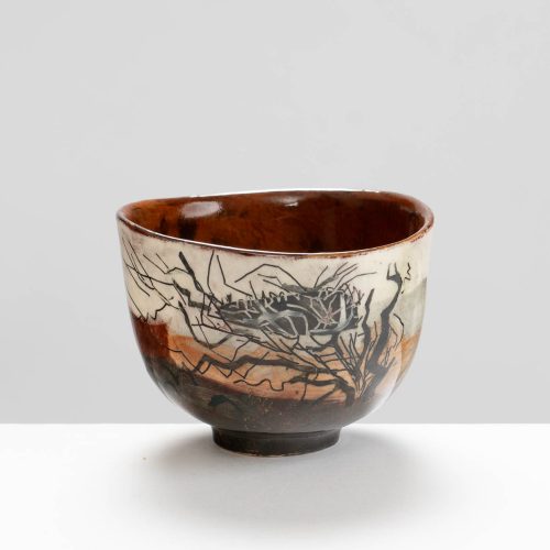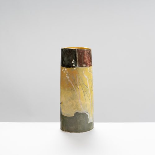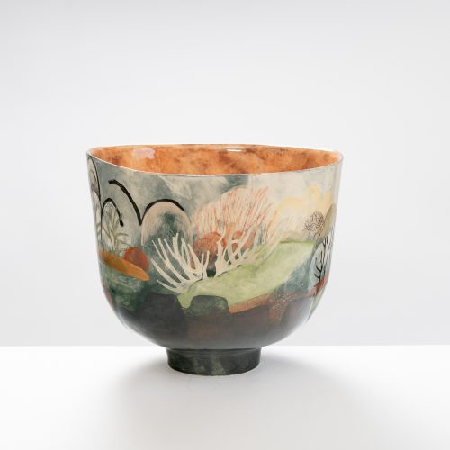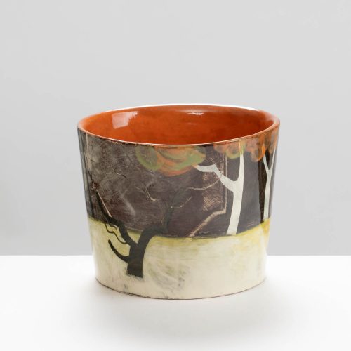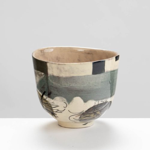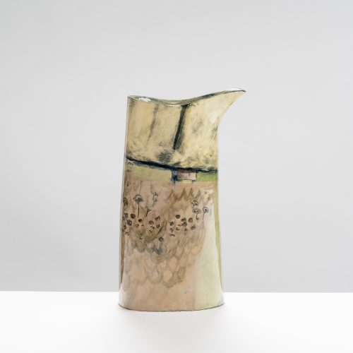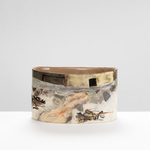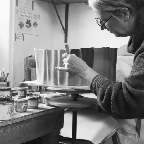 Each piece is developed during the making stage using drawing in the landscape as a starting point. Often assembling her pieces from fine pliable sheets (slabs) of clay – white earthenware mixed with a rougher clay – she then alters, cuts and fettles them. On occasion she may add sections of texture from carved or lino cut designs.