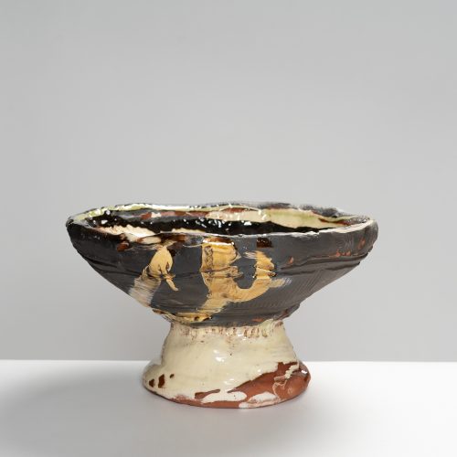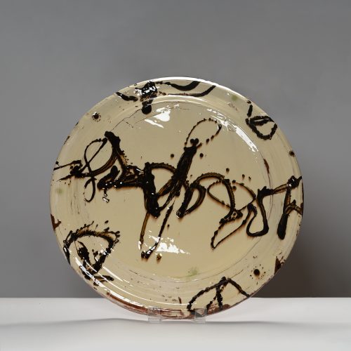 Internationally renowned, Dylan Bowen trained with his father, Clive at Shebbear Pottery before studying at Camberwell School of Art. His wheel-thrown, hand-built works are a balance between traditional painting and ceramics. Renowned for his loosely thrown, abstract pieces, he works on a small but ever mutating range of shapes, attempting to capture some of the action and spontaneity of his making processes. He pours, trails and brushes slip onto his pieces with a vigour that challenges the careful traditions of English slipware and makes them entirely his own.