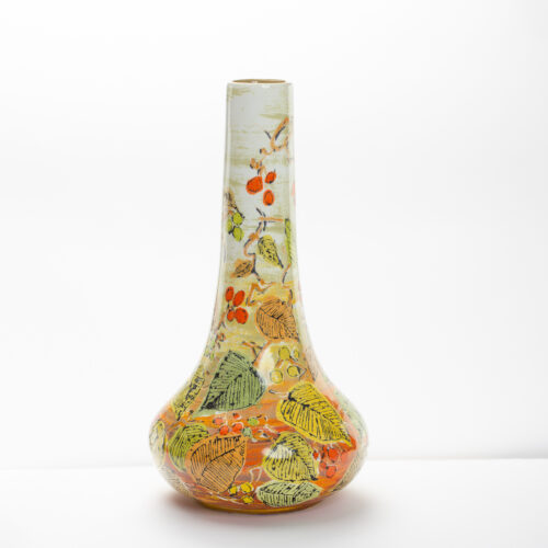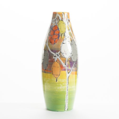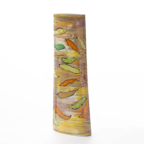 All her forms are slip-cast, the shapes are originally hand carved or turned on a lathe. Although simple, they are specifically designed to carry the intricate and complex hand painted designs, and each piece is a one-off.