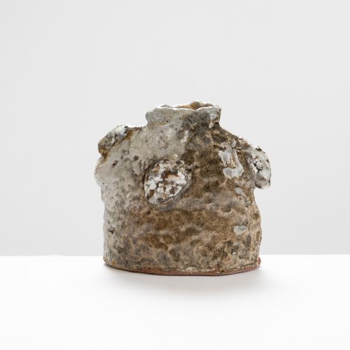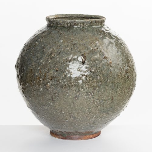 Work is produced in three or four-month periods, the time it takes to prepare clays and rocks, make pots, glaze, pack, and fire his kiln. Clays have to be crushed and prepared. He makes his own grogs and crushes and mills all the rocks for his glazes. This is very time consuming but it has become extremely important to him that he is involved in the whole process of making.