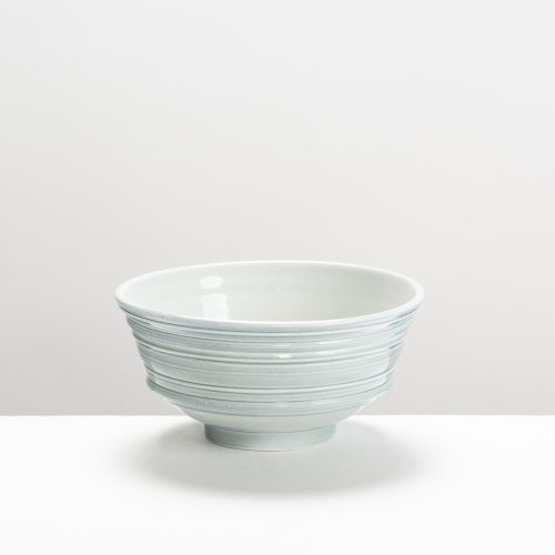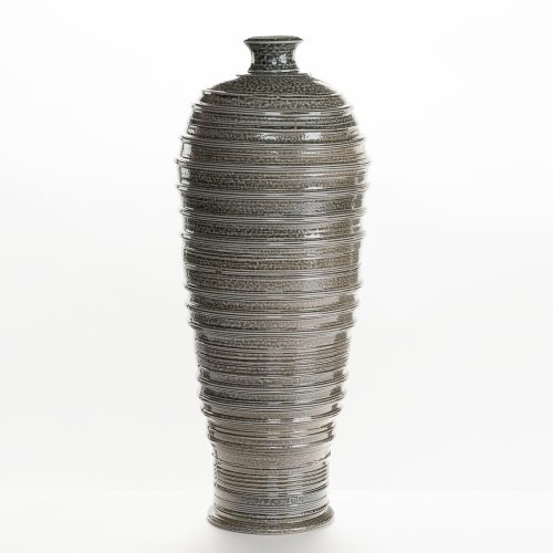A graduate of Clay College Stoke, his work expresses contrasts, and explores traditional forms and detail. The shapes and banding are precise, yet the work is salt glazed and with mark making that evokes the turning, the softness and spinning of the clay on the wheel. The banding may elicit feelings of support, protection, safety and security, but at other times perhaps a constraint, confinement or caging.