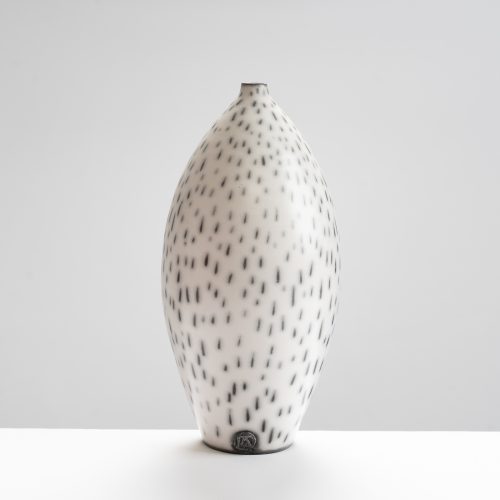 Tim’s work is labour-intensive. Pieces are thrown or hand-built or often a mixture of both.  Many are burnished and individually raku-fired. Playing with smoke and fire is still central, black/white with linear decoration – or splashes of colour. Tim loves exploring the interaction between controlled technique and expressive release – the exciting place of tension between the cautious and the cavalier that he calls ‘seat of the pants’ ceramics.