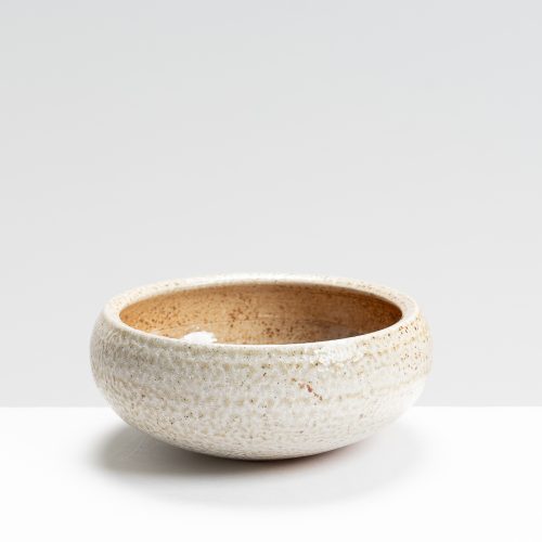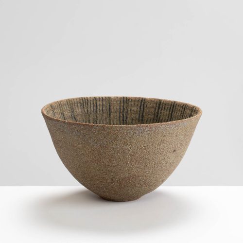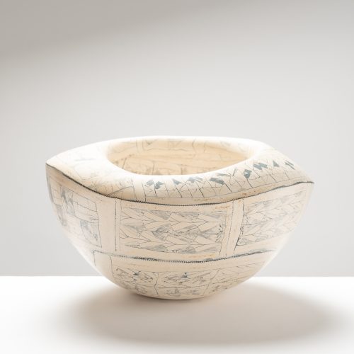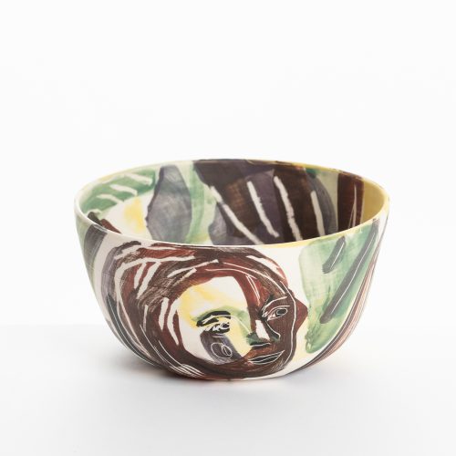 A hand-built earthenware small bowl worked on with multiple layers of coloured slips, with painted or stencilled images. Sgraffito drawing is added and may be inlaid with slips. It is enhanced with subtle underglaze painting and finished with a transparent glaze.
