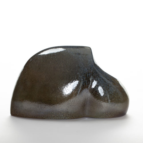 The initial form of this abstract sculptural piece is slip-cast in bone china after which it is altered and shaped whilst the clay is still soft. After it’s bisque fired the form is sanded and burnished before going into a final firing where the very high temperature causes the shape to soften and bow further.