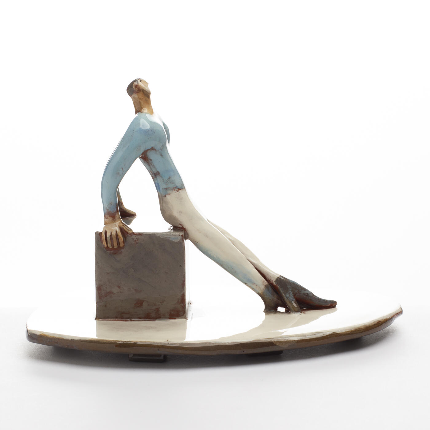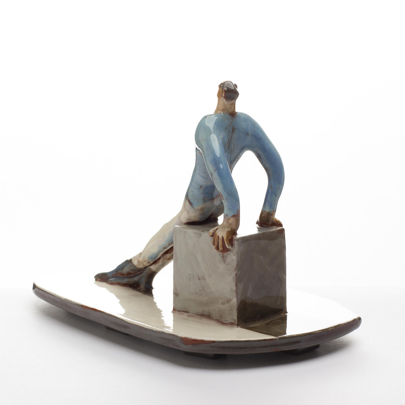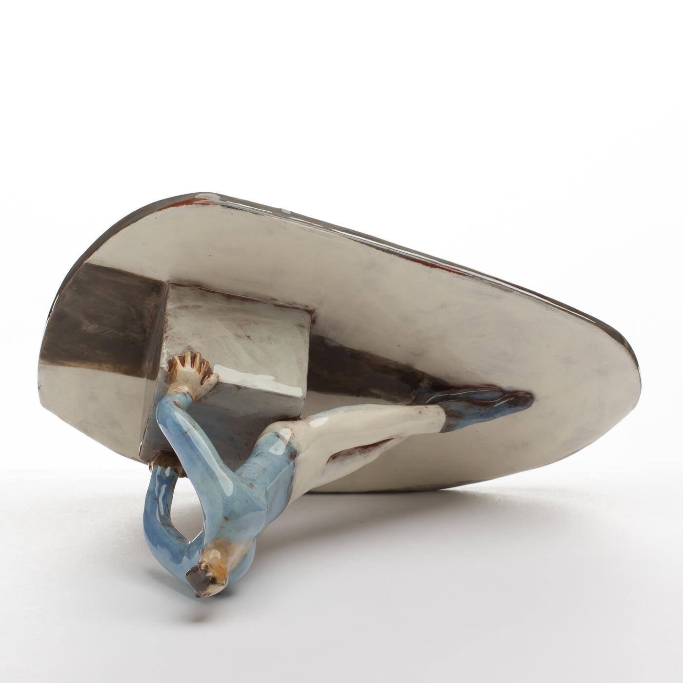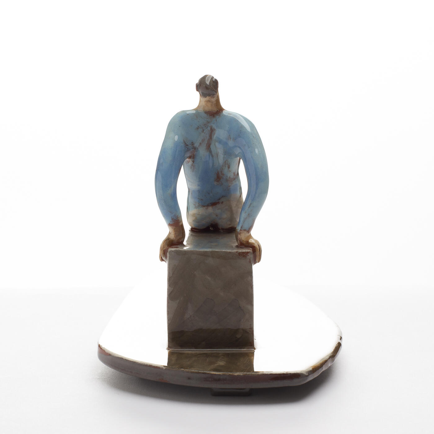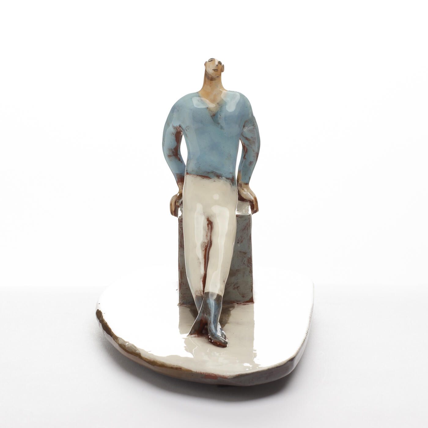 This animated earthenware tableau is hand-built and decorated in painterly detail. It is a part of Jenny’s ‘knitting pattern folk’ series which explores the figures from her childhood collection of vintage knitting patterns. She sees each piece as a psychological drama, with some unseen narrative enacted within the arena.
