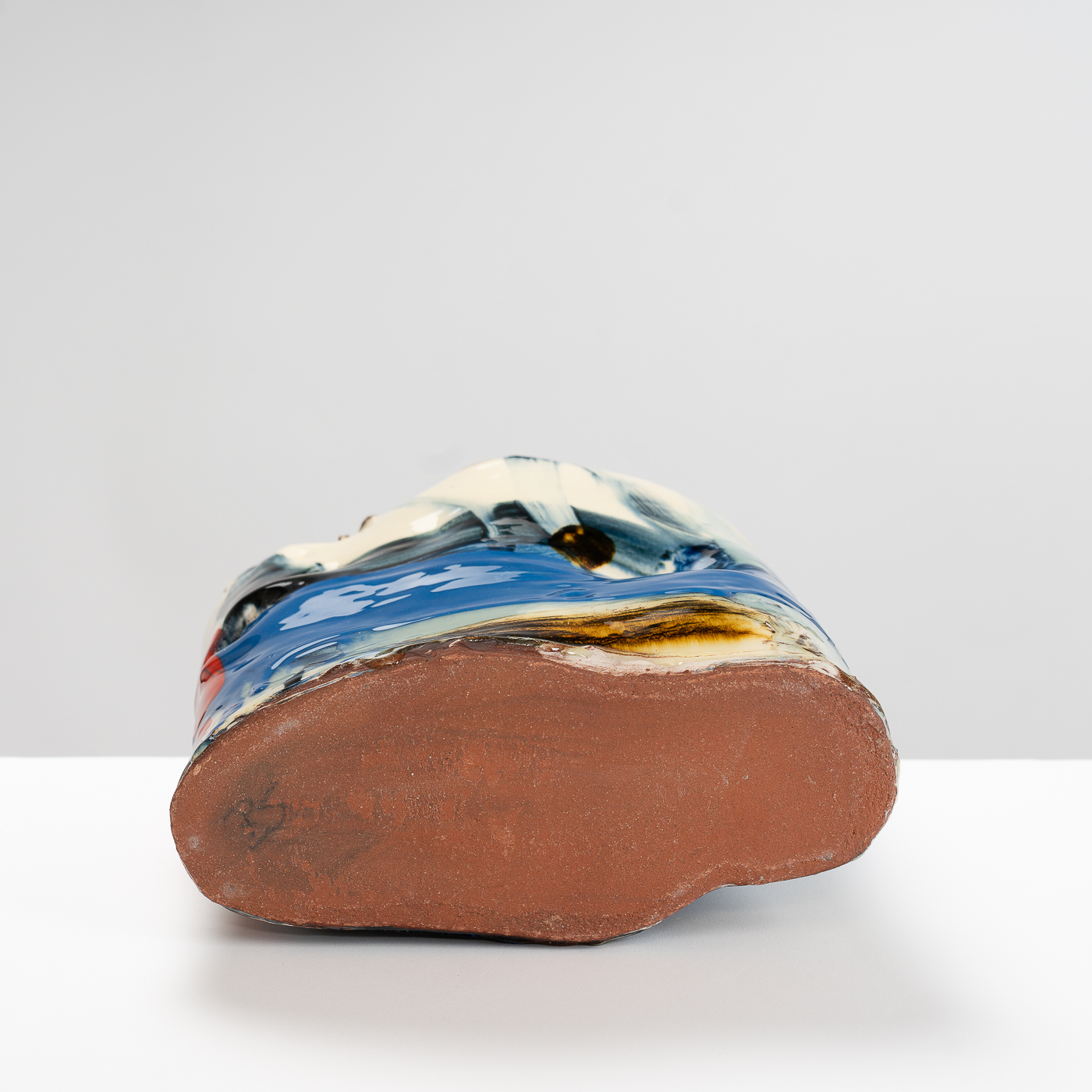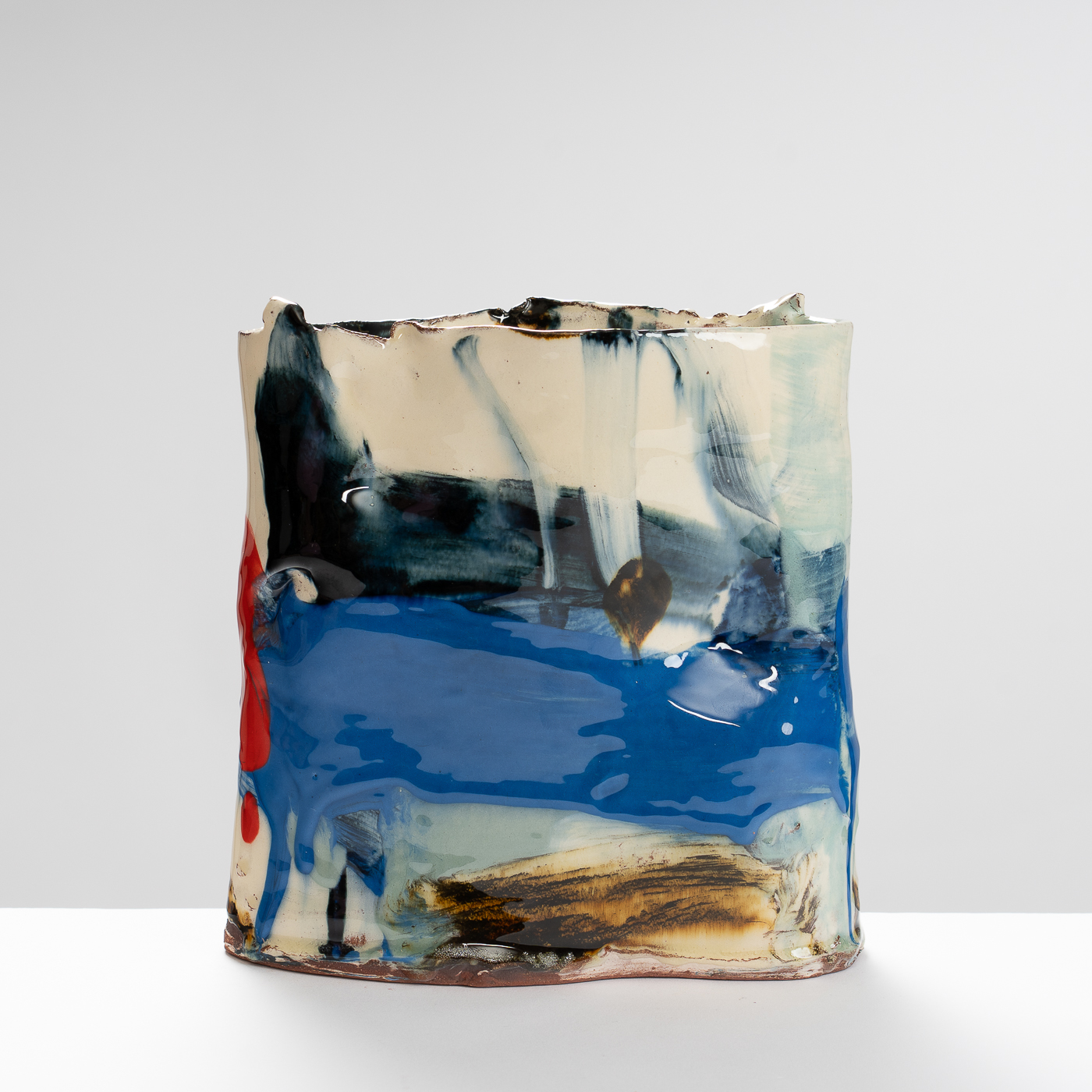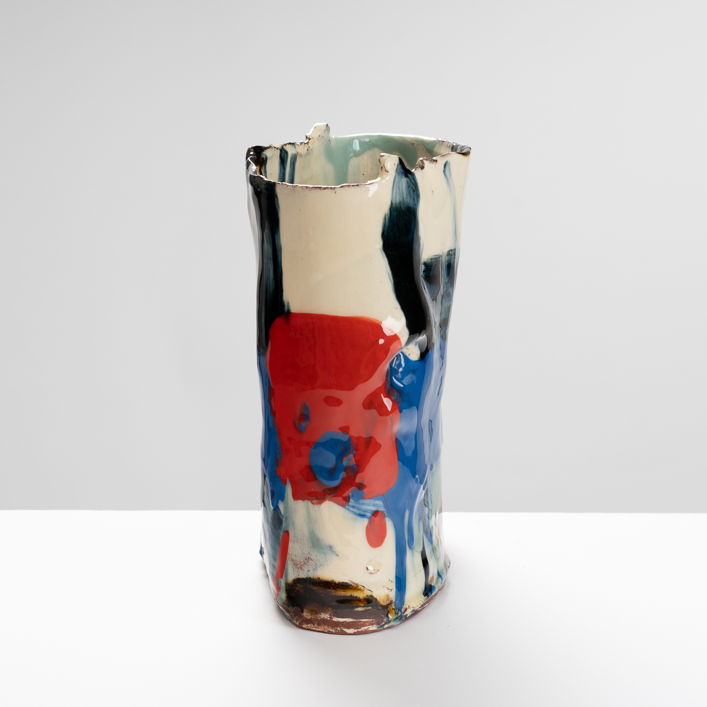 This animated earthenware vessel is thrown soft and altered. It is then scratched, cut and marked and brushed in layers with pigment, slip, oxides, and glaze.