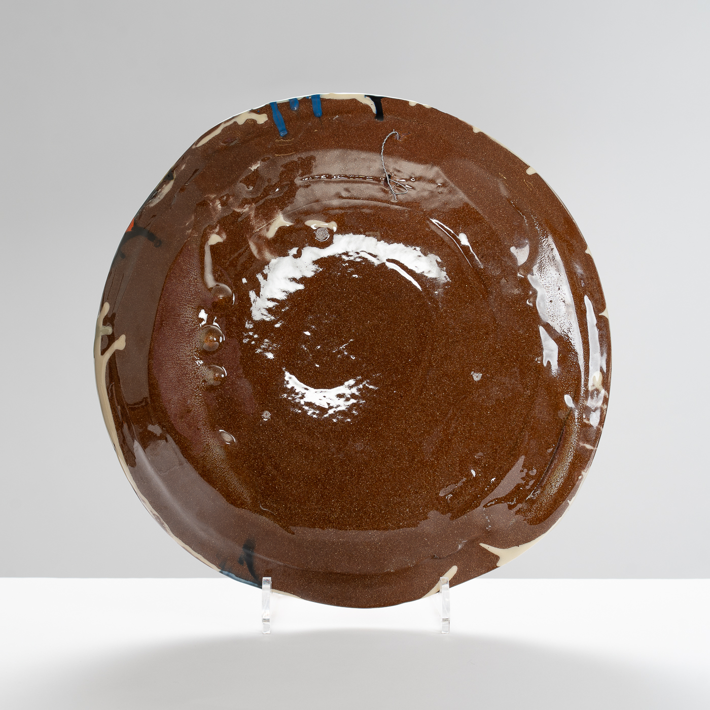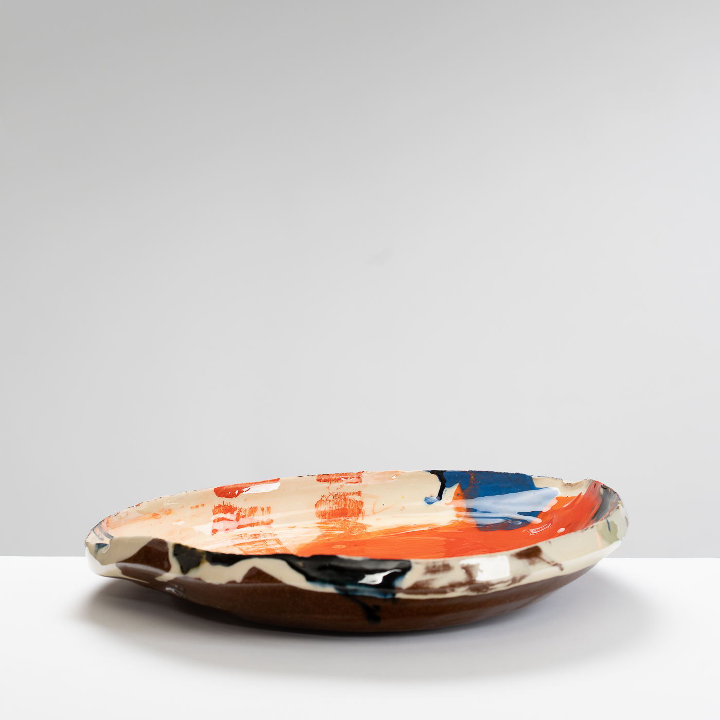 This animated earthenware platter is thrown soft and altered. It is then decorated in a painterly way with brushed layers of multi-coloured slips, and glaze.