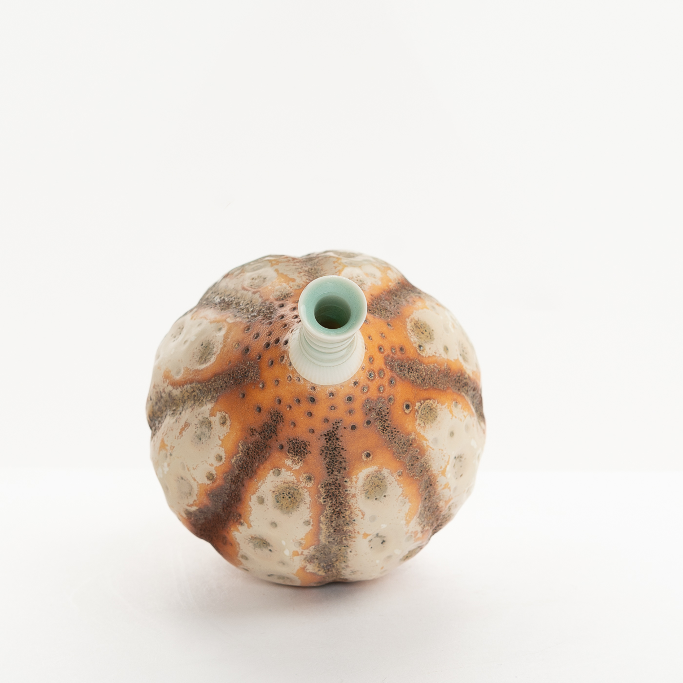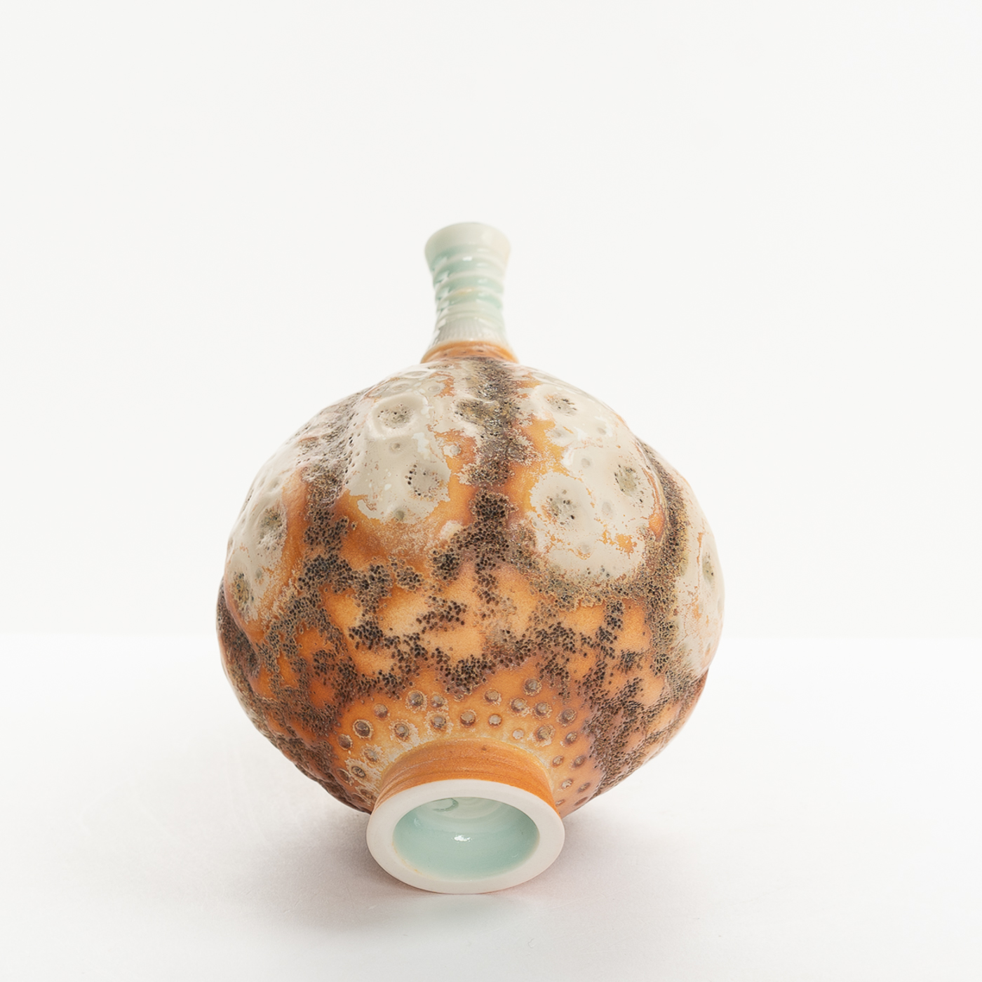 This vessel is wheel-thrown in porcelain. It is decorated with a sgraffito and glaze design, then finished with ribbed and textured details.