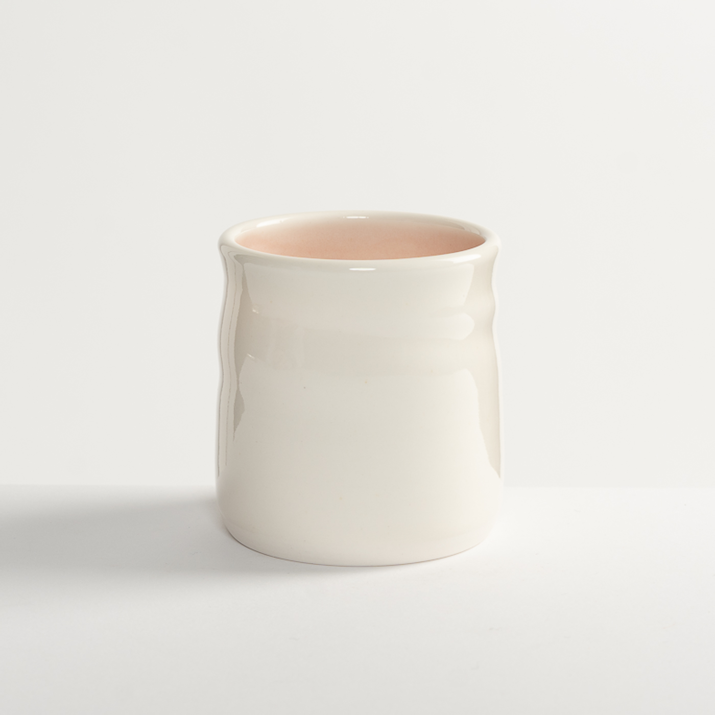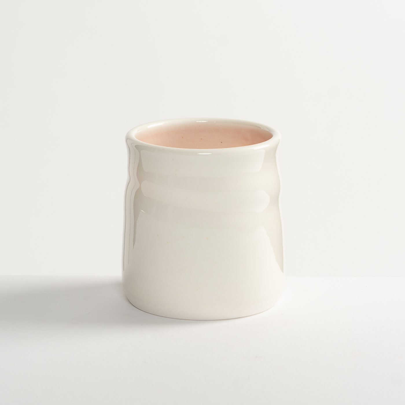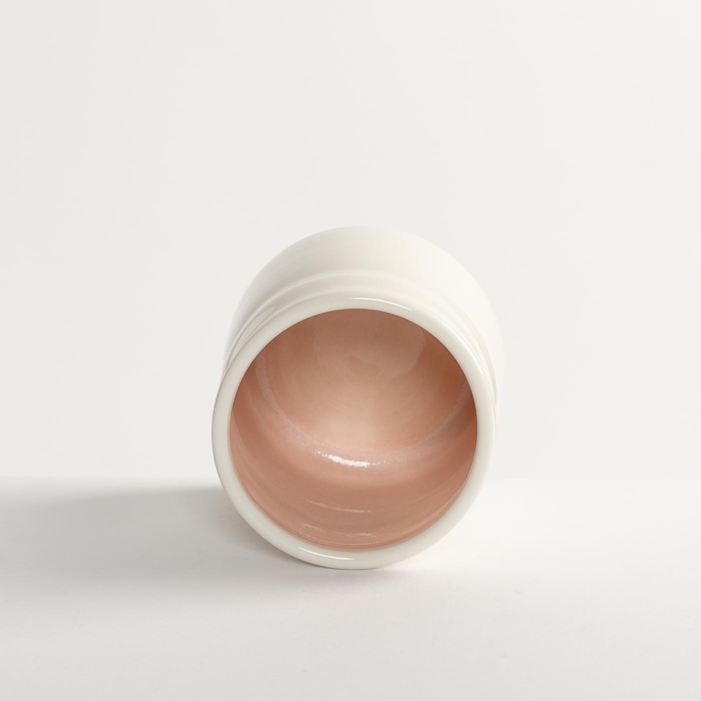This vessel is softly thrown in porcelain. It is finished with a glossy transparent glaze, the interior is glazed with a contrasting pastel colour. The base is polished to enhance the tactility of the piece.