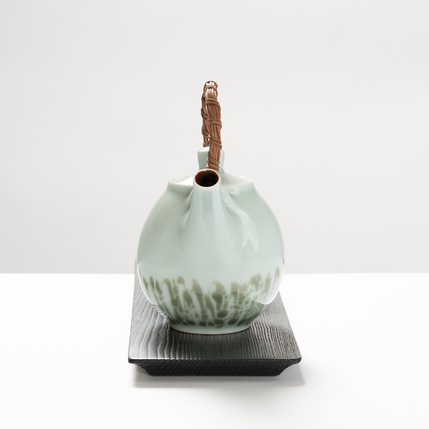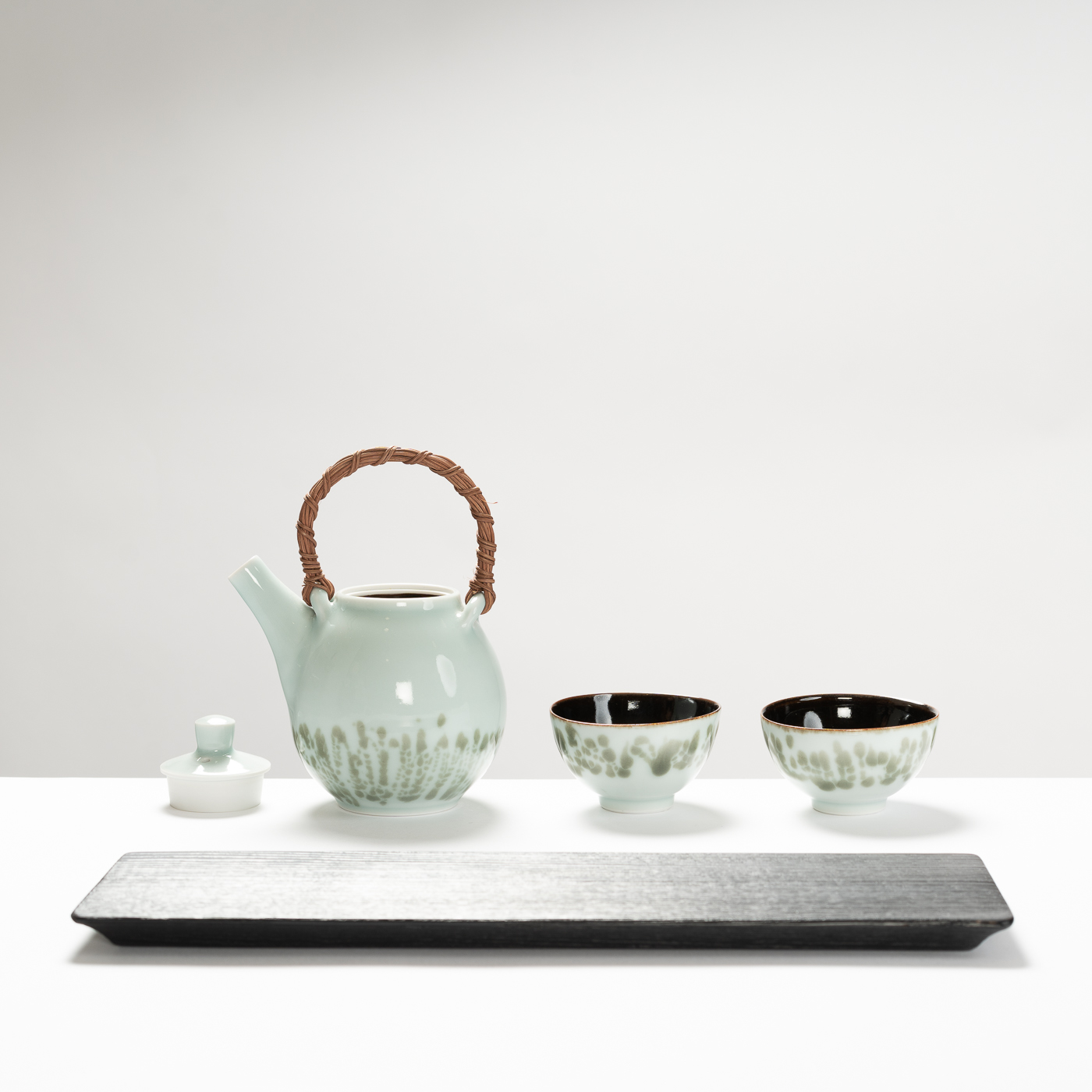 This elegant wheel-thrown porcelain tea set comprises a teapot, two cups, and a wooden tray. It features a green glaze design with the artists signature celadon glaze.