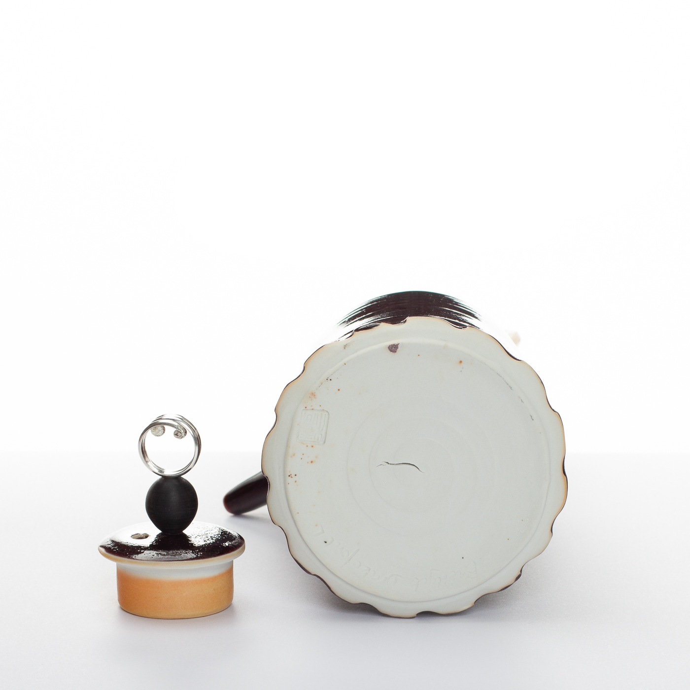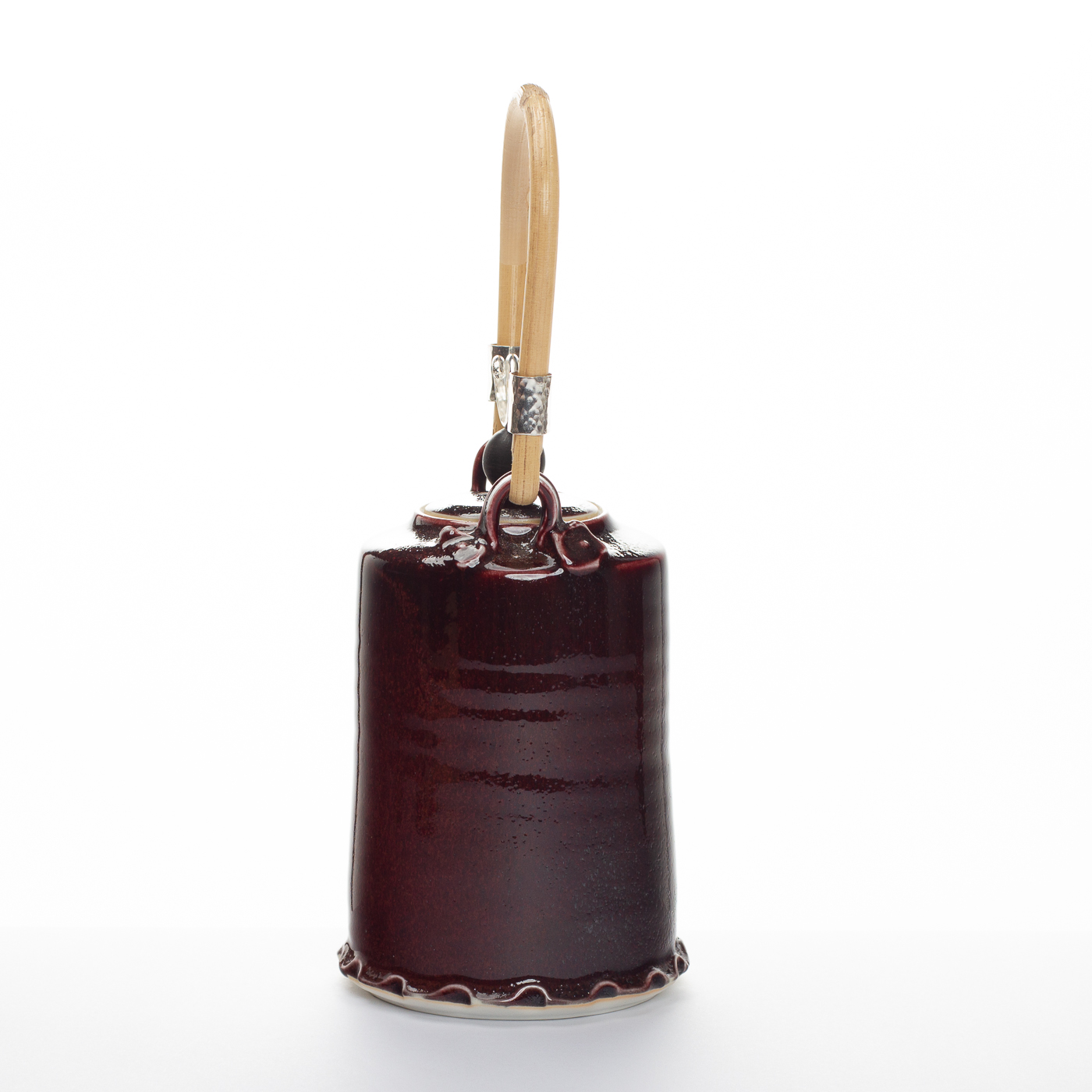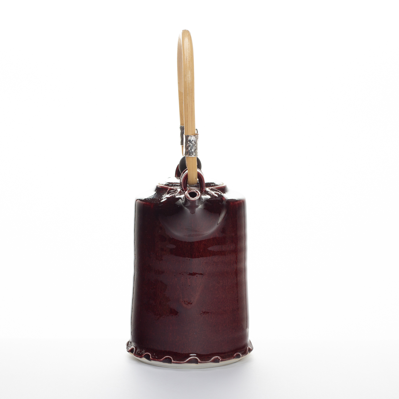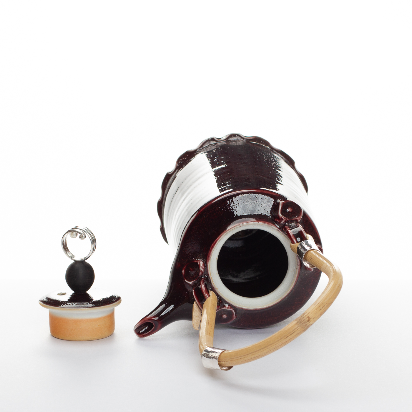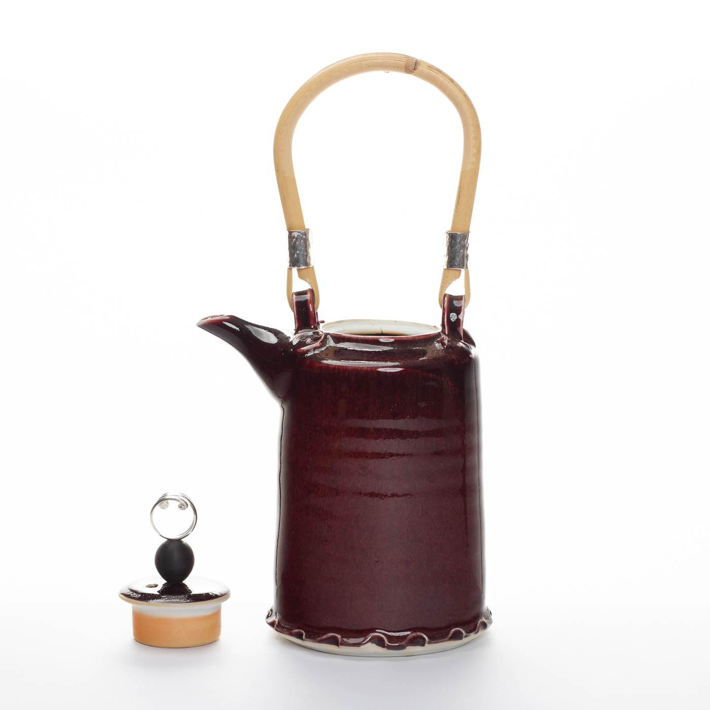 This finely thrown deep copper red teapot has a frilled base with a cane handle and silver details.