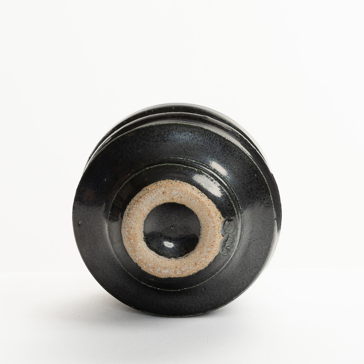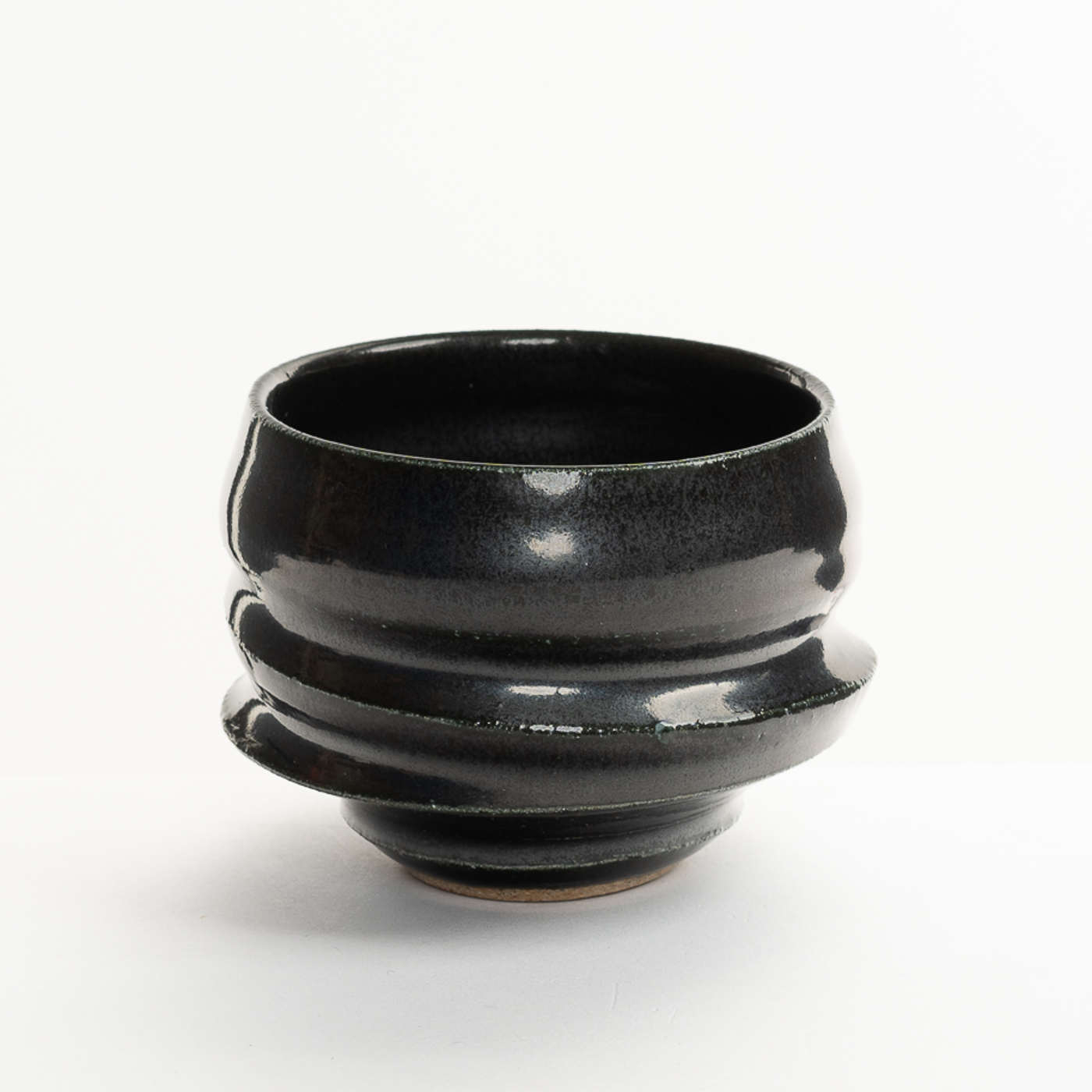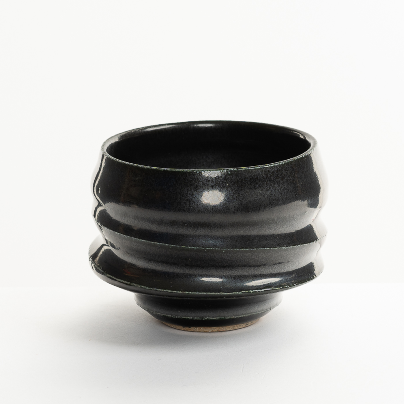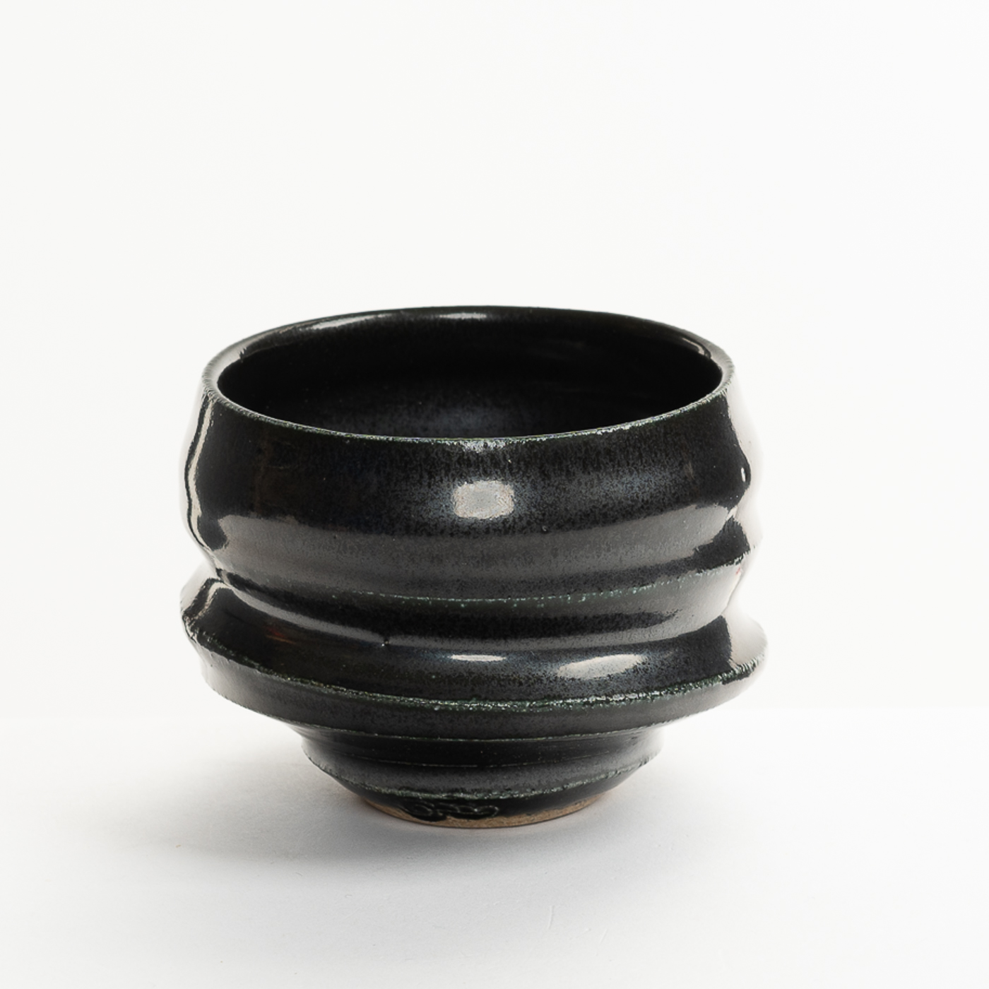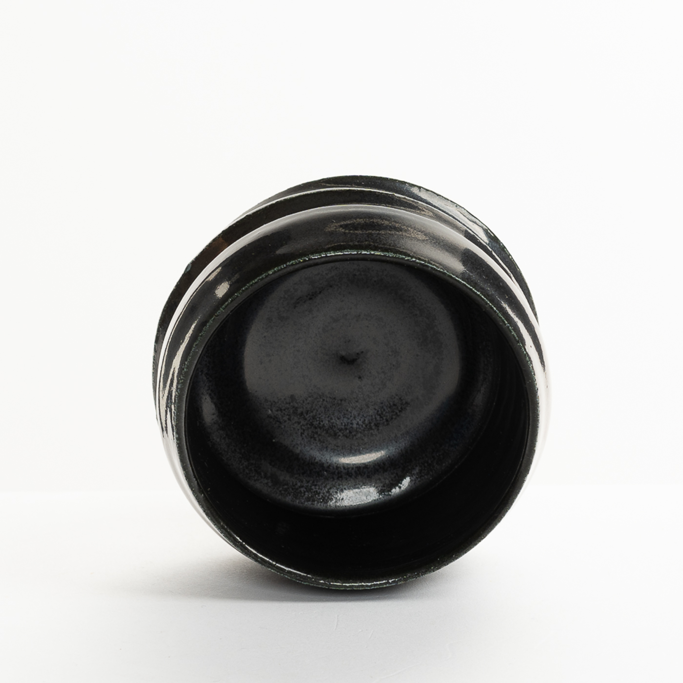 This stoneware cup is wheel-thrown with prominent throwing lines, and is enveloped in a satin black glaze.