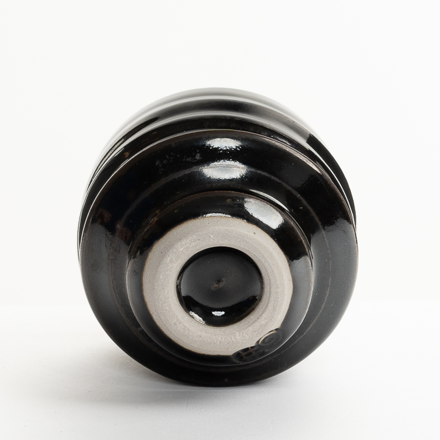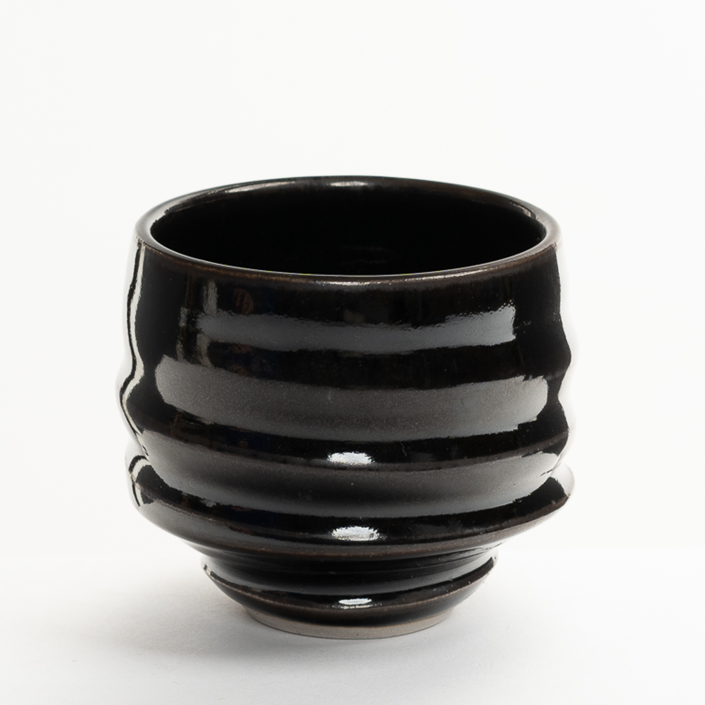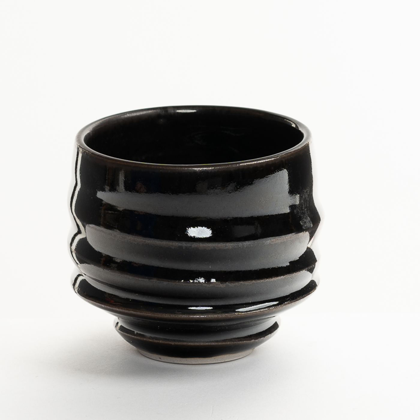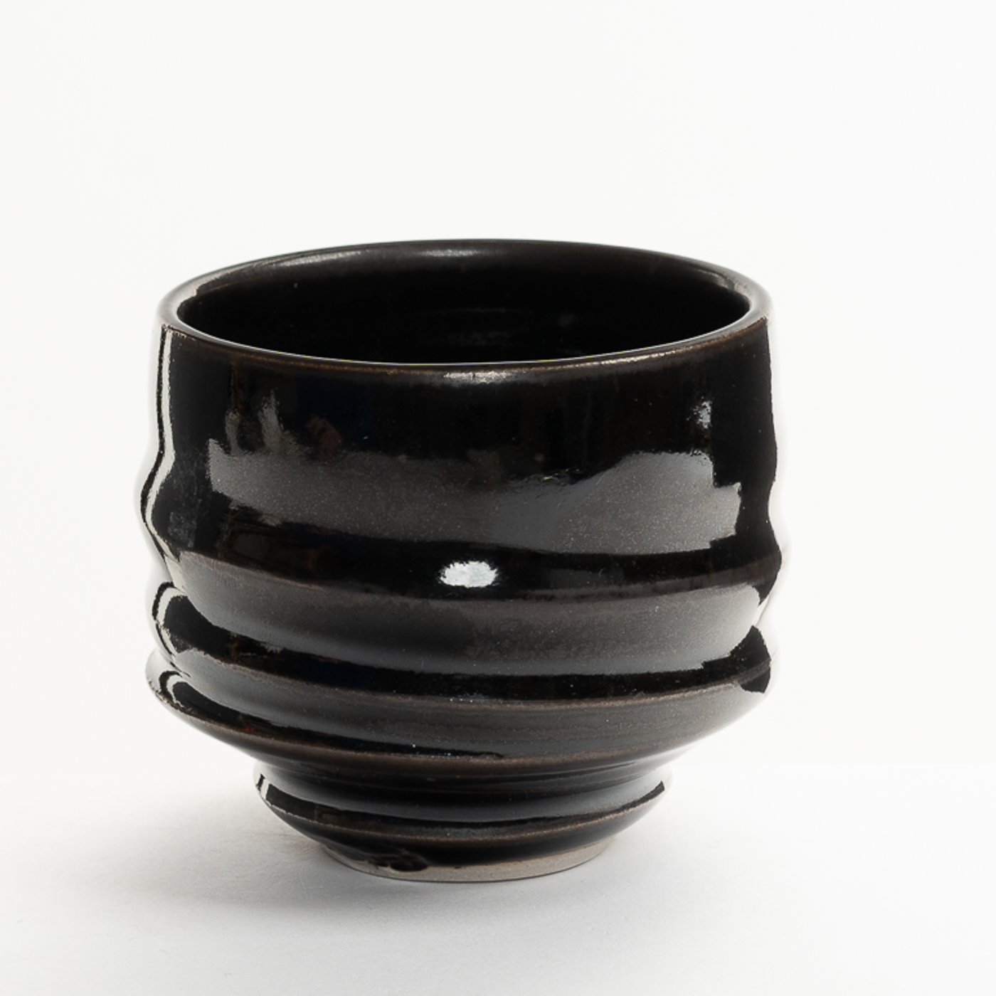 This stoneware cup is wheel-thrown with prominent throwing lines, and is enveloped in a lustre black glaze.