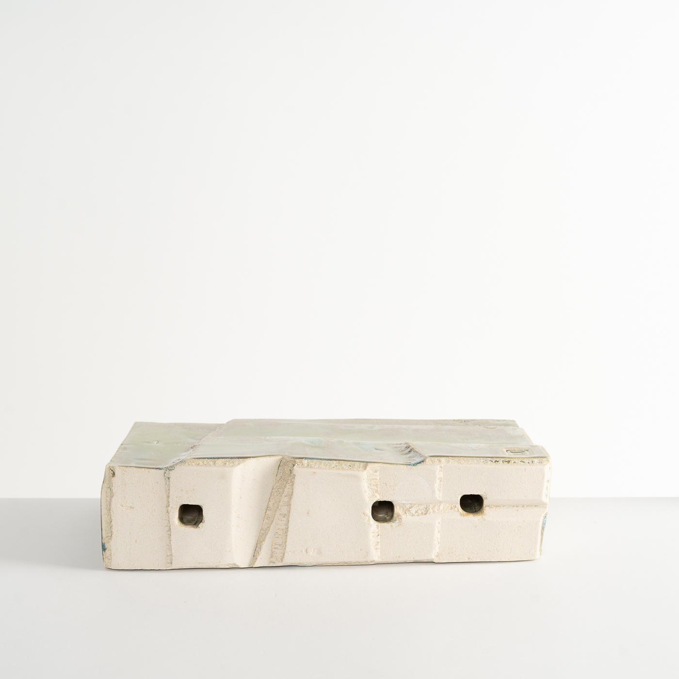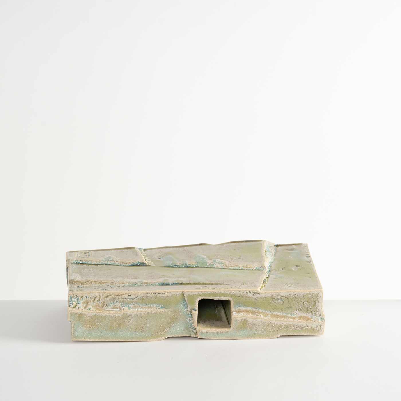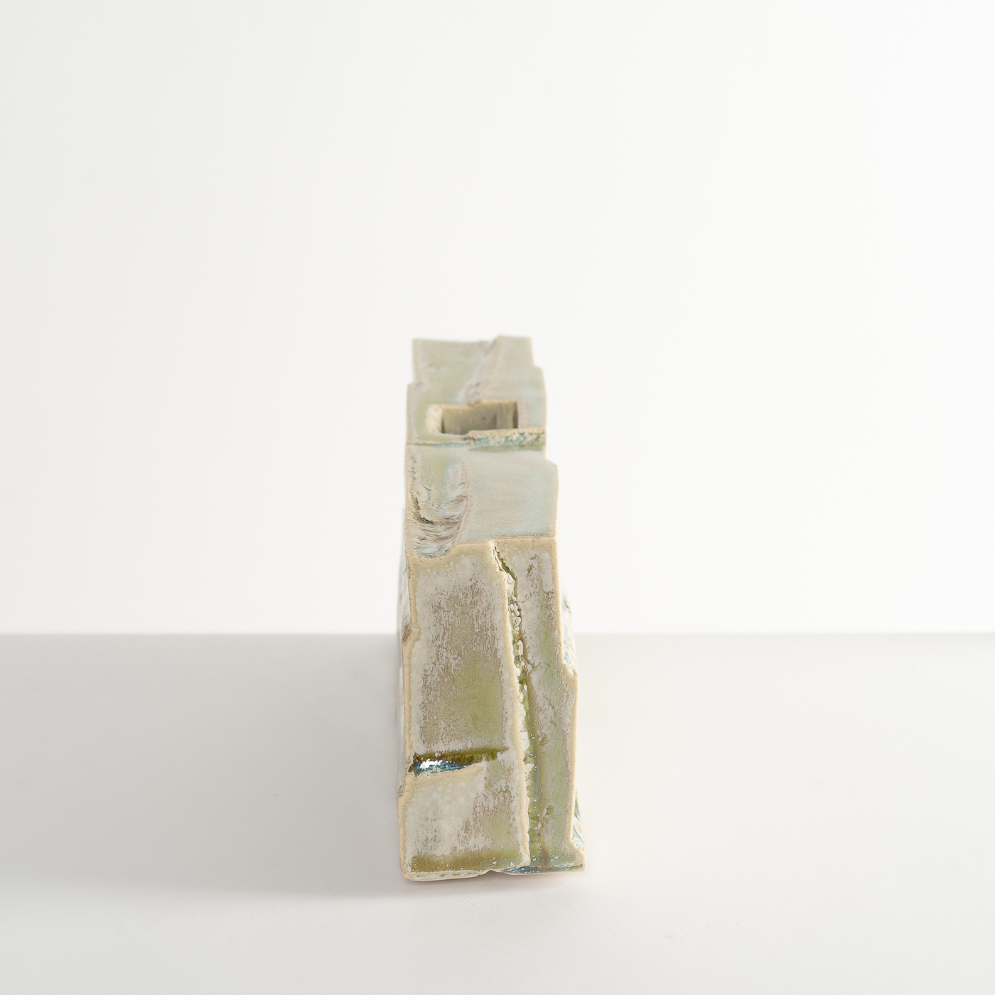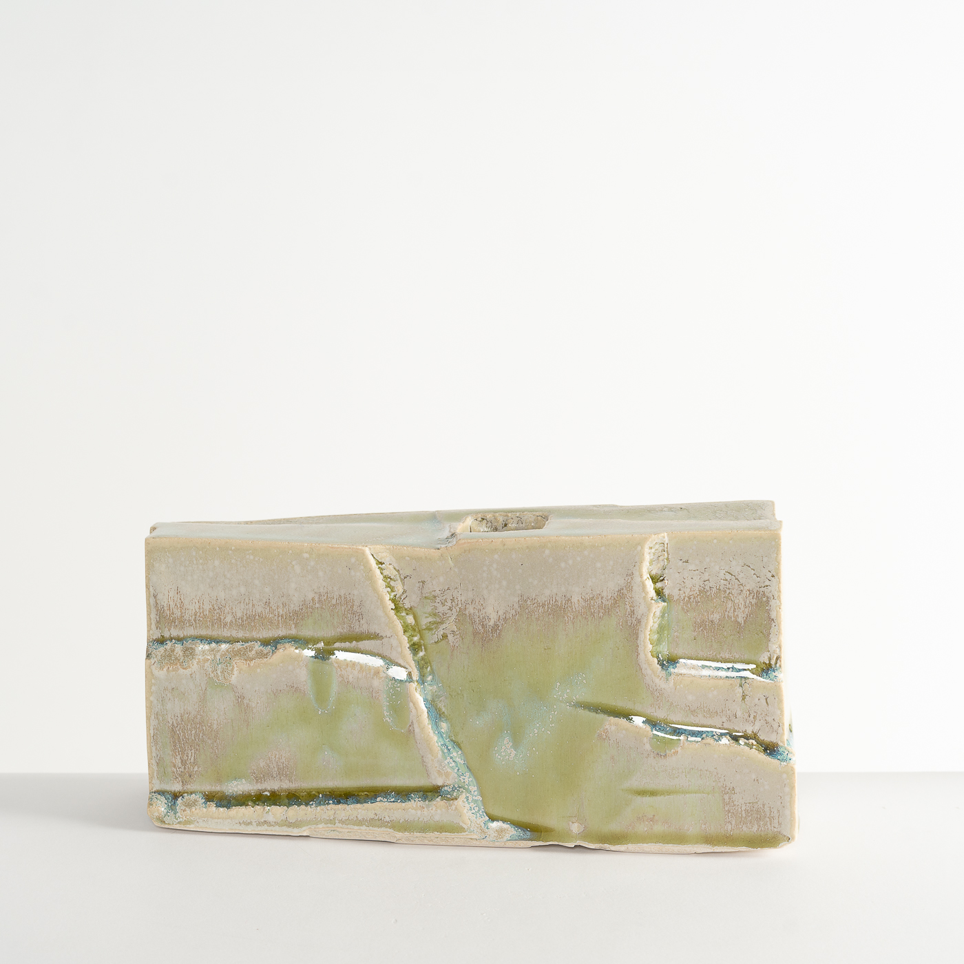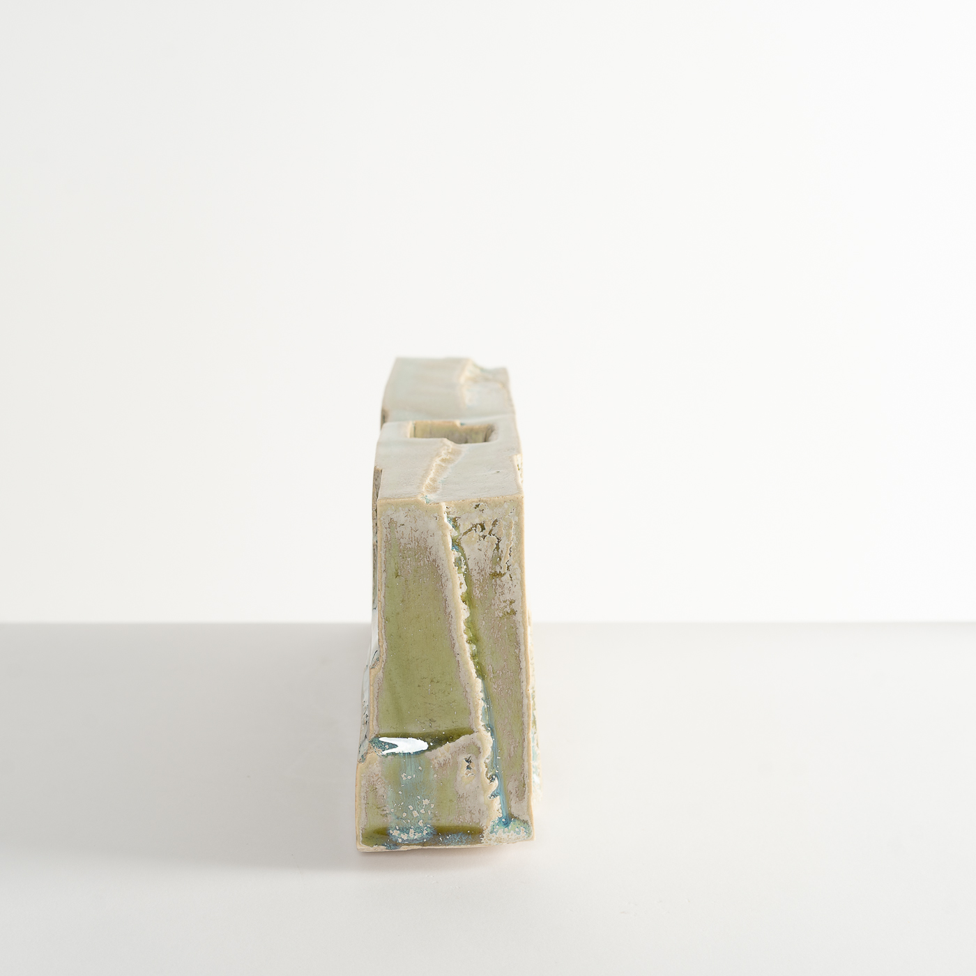 Inspired by the natural landscape and Japanese aesthetics, this vase form is carved from a solid block of stoneware clay using woodworking chisels and blades. The piece is enveloped in a glaze containing copper and titanium.