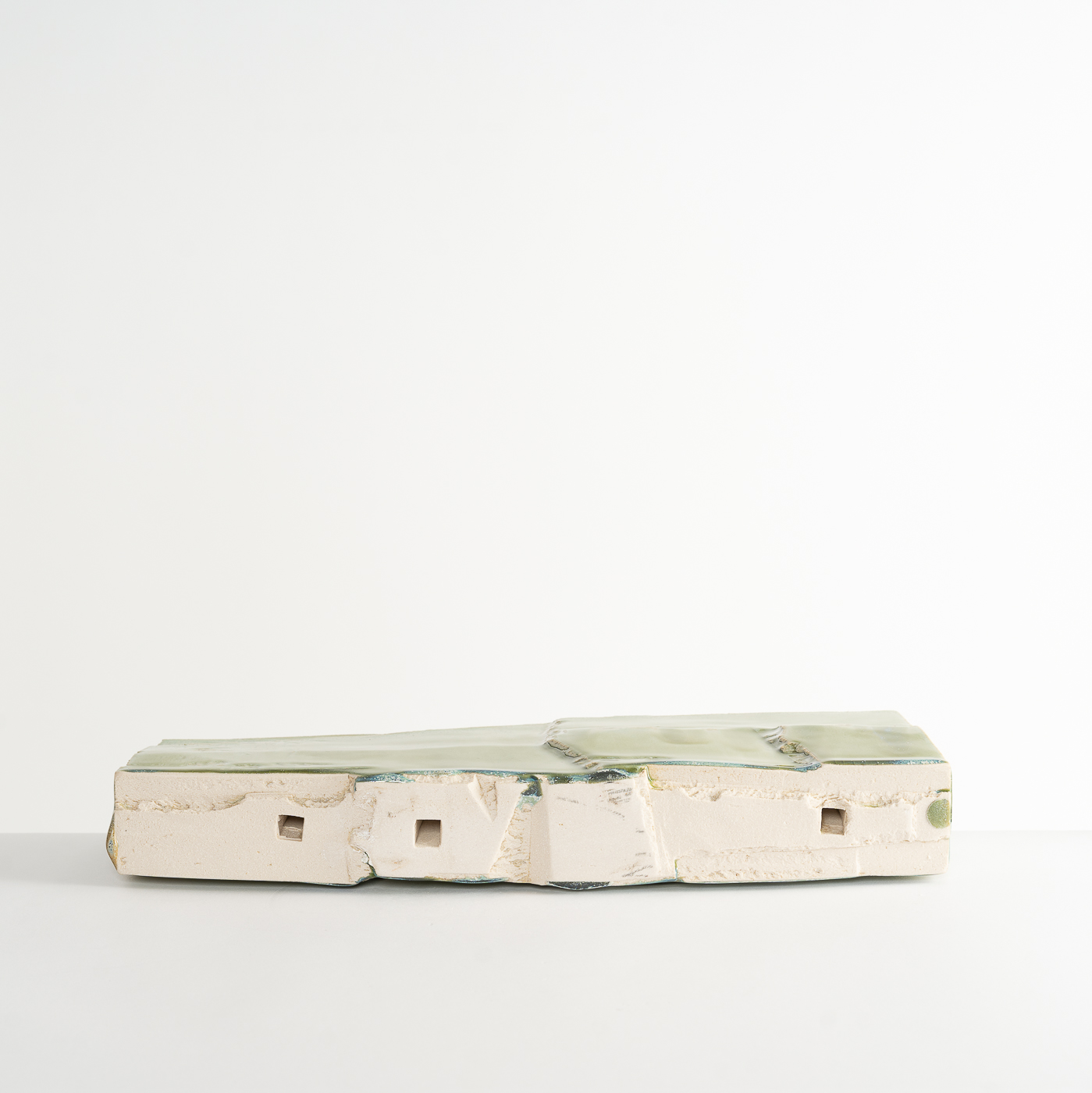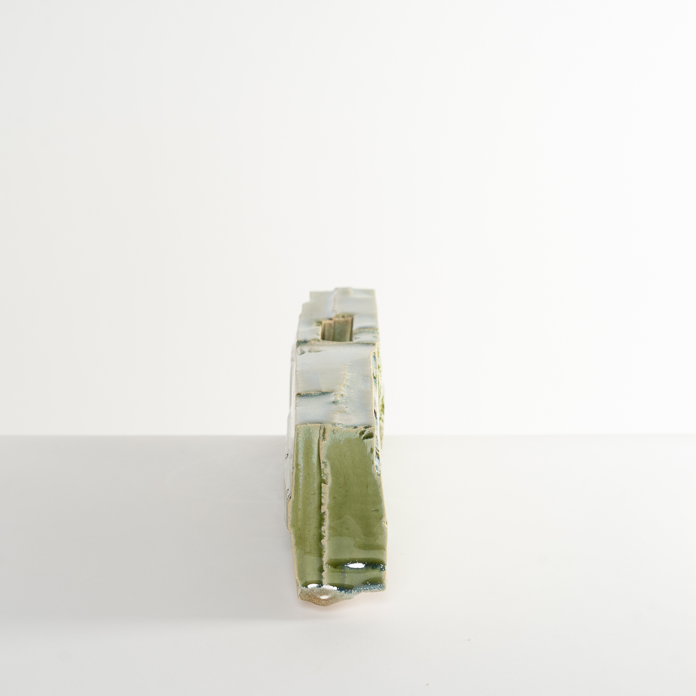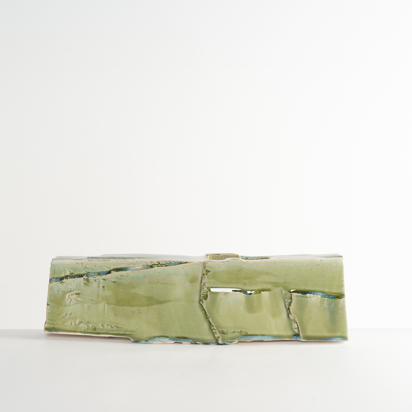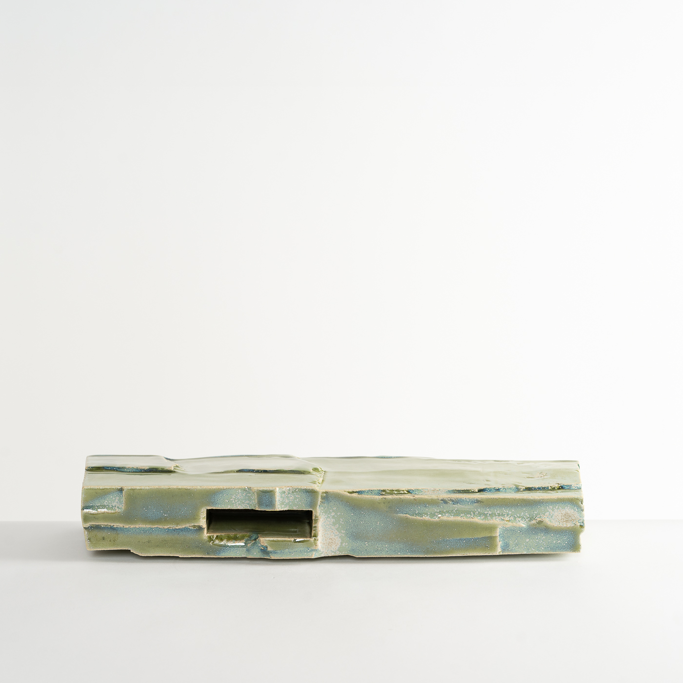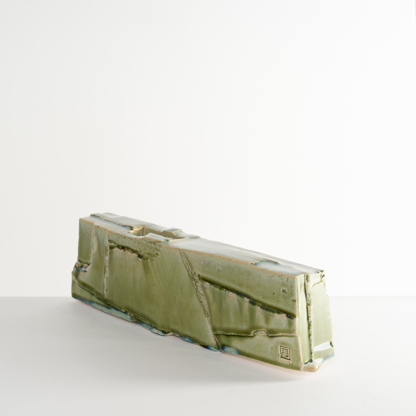 Inspired by the natural landscape and Japanese aesthetics, this vase form is carved from a solid block of stoneware clay using woodworking chisels and blades. The piece is enveloped in a glaze containing copper.