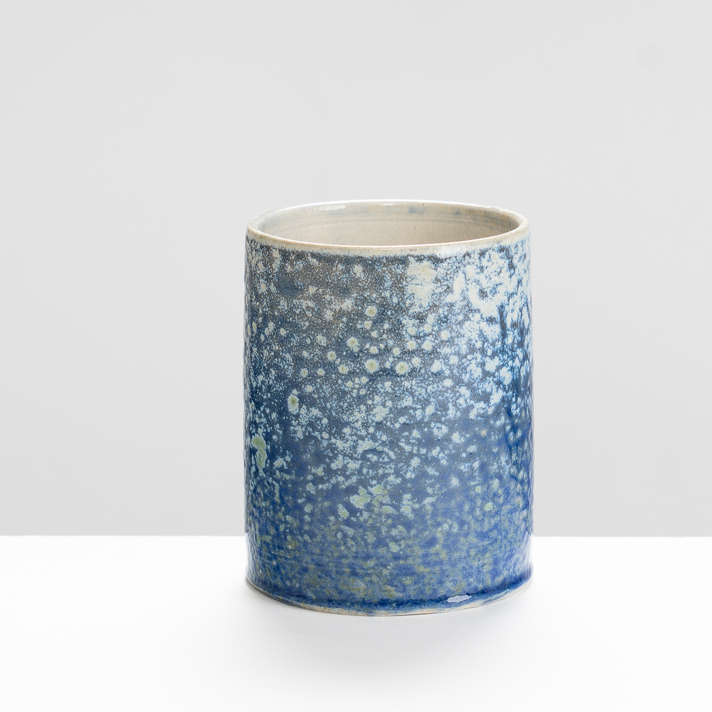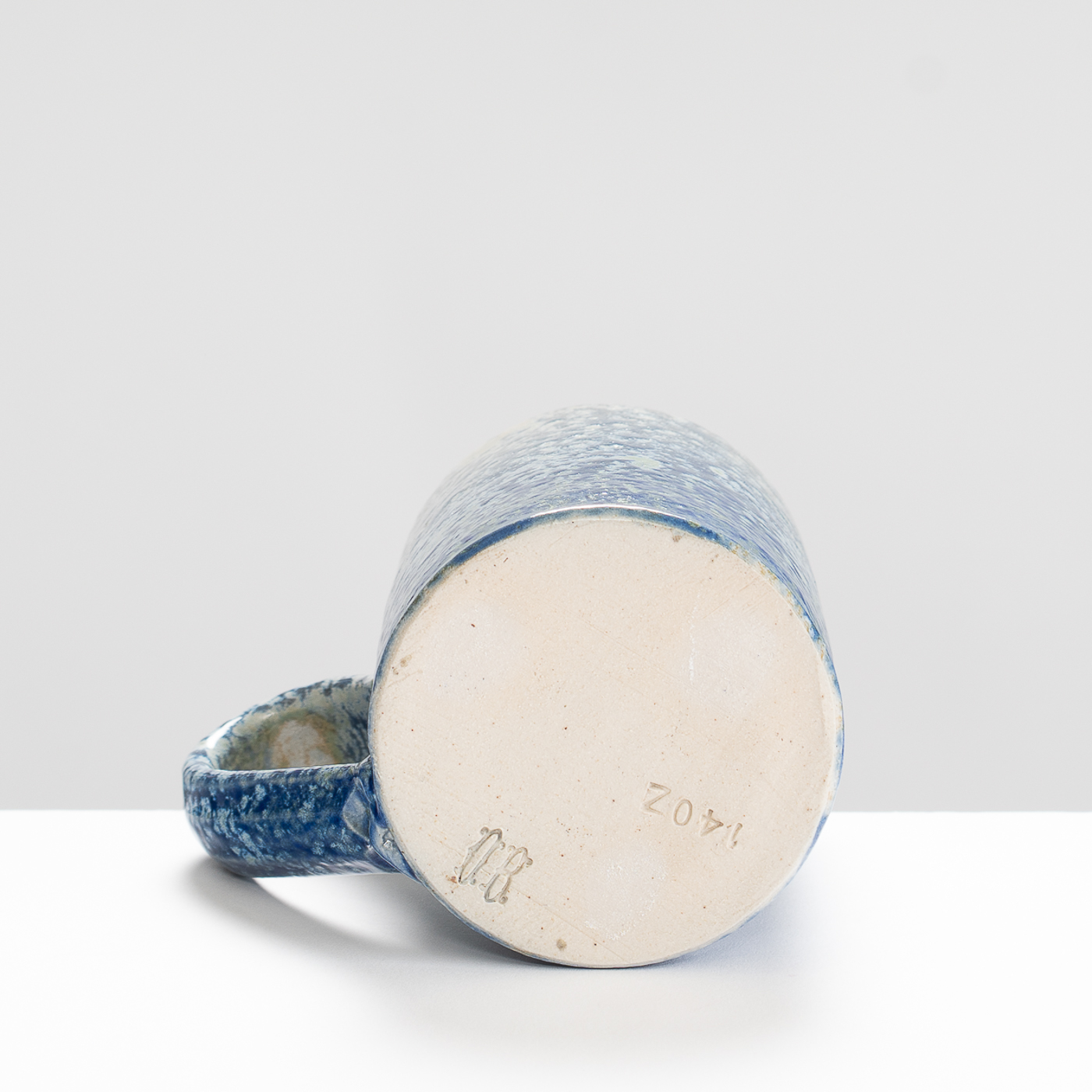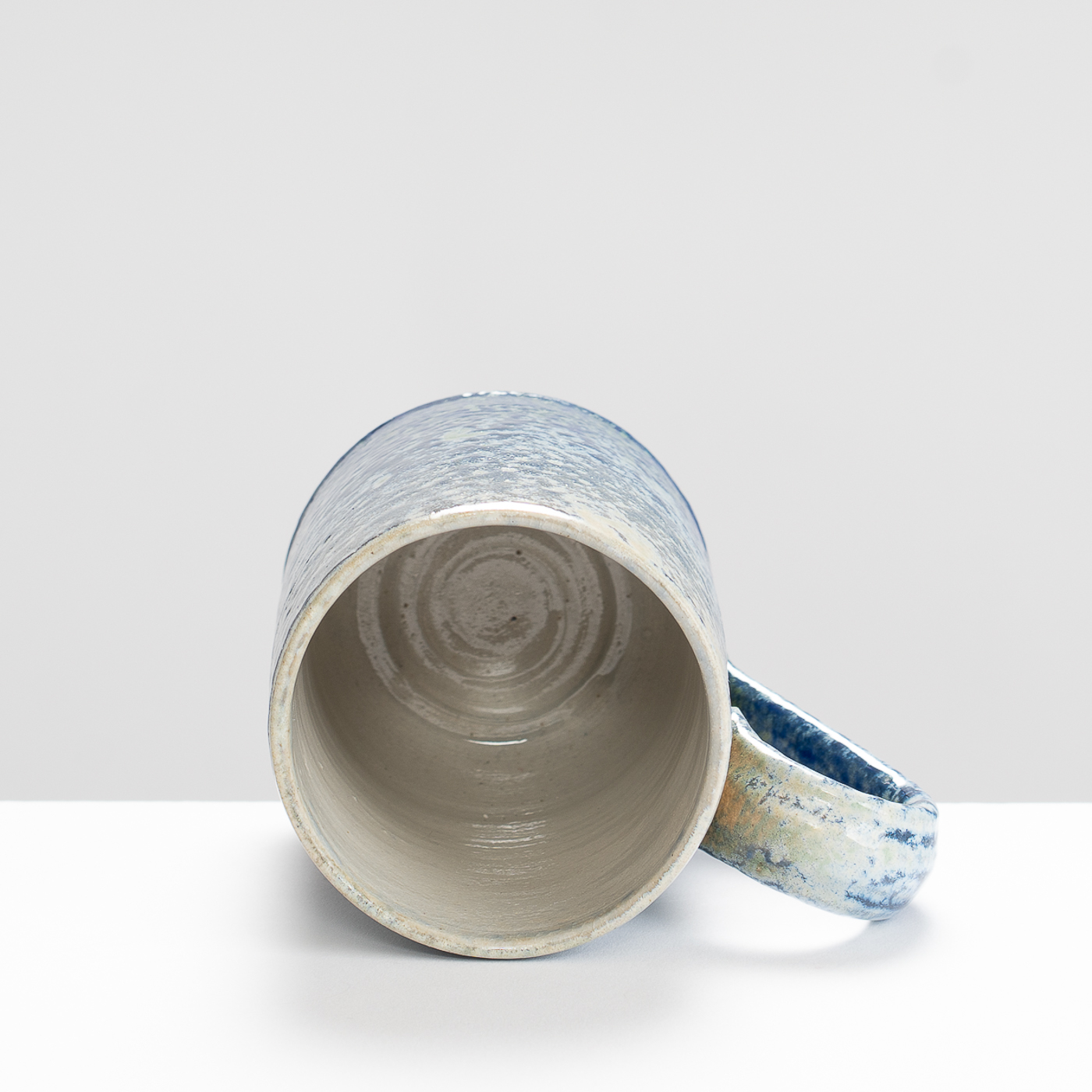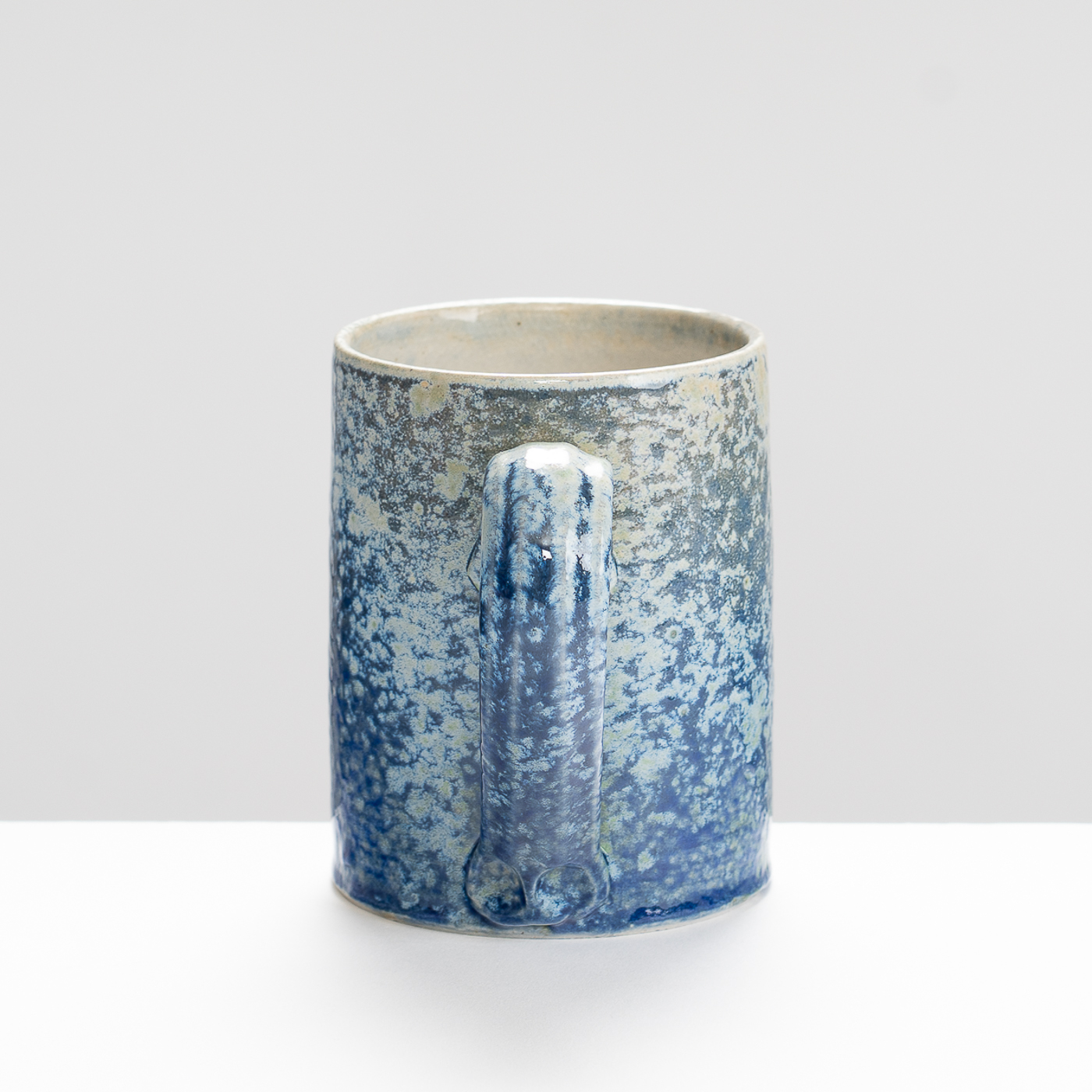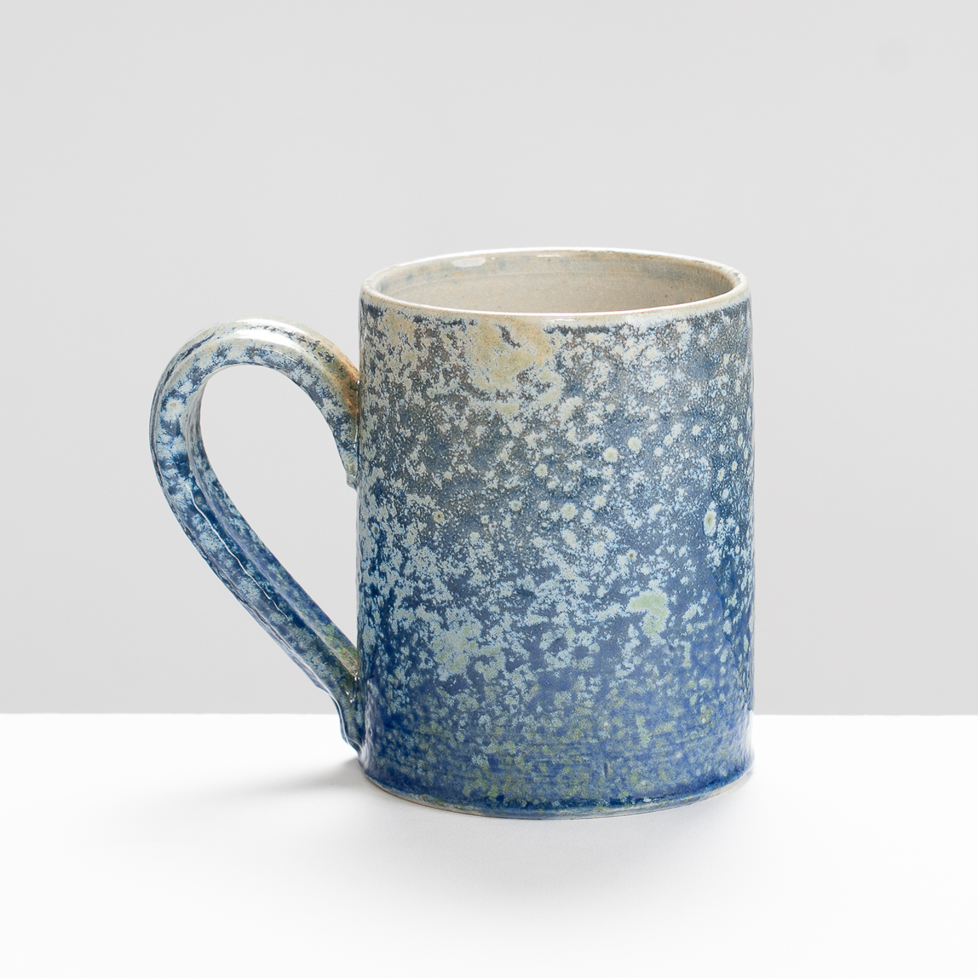This stoneware wheel-thrown mug is salt and ash glazed. Vibrant slips and ash glazes are used which encourage the firing process to leave its mark on the ware, developing textures and movement within the fluid glaze, producing unique works to be explored beyond their surface.