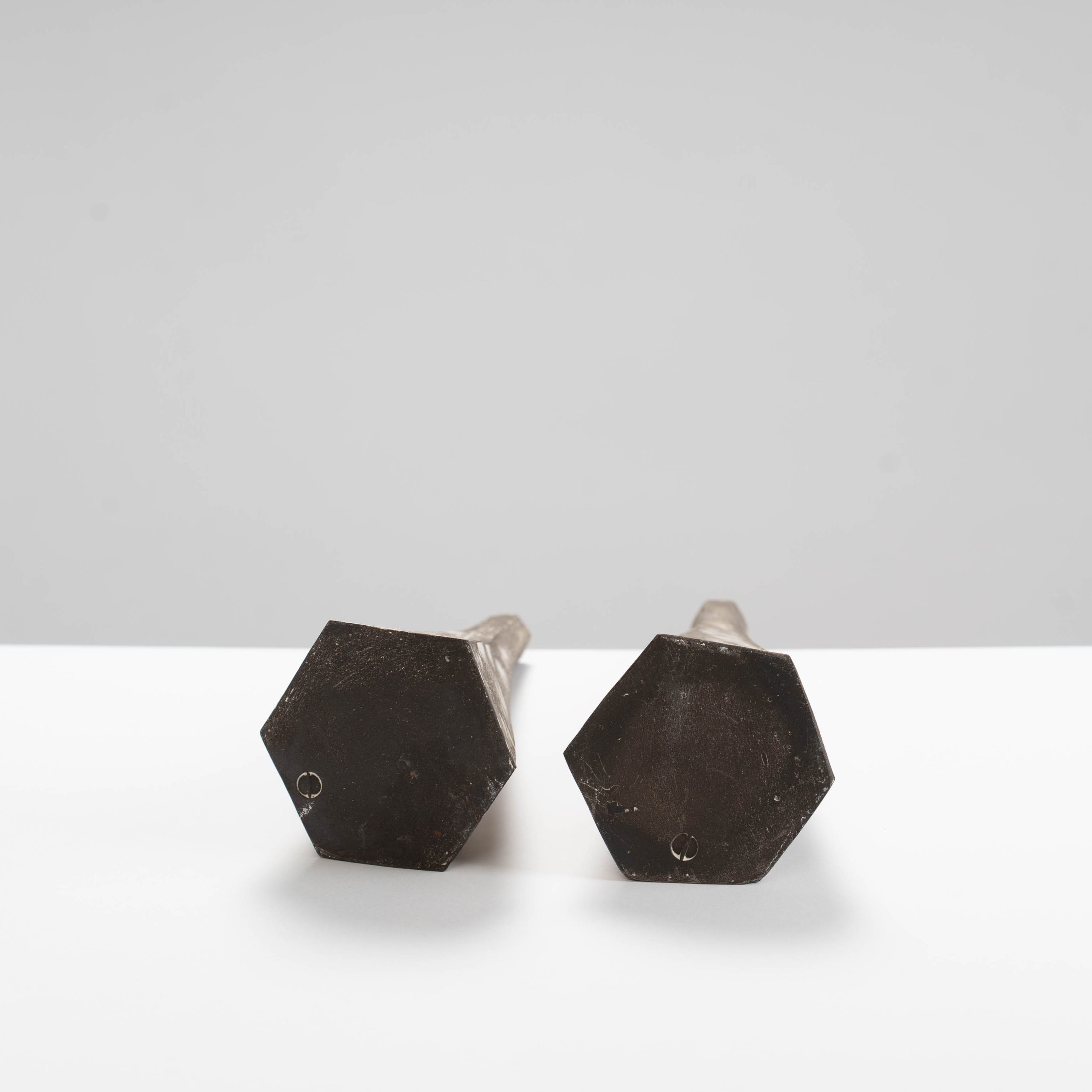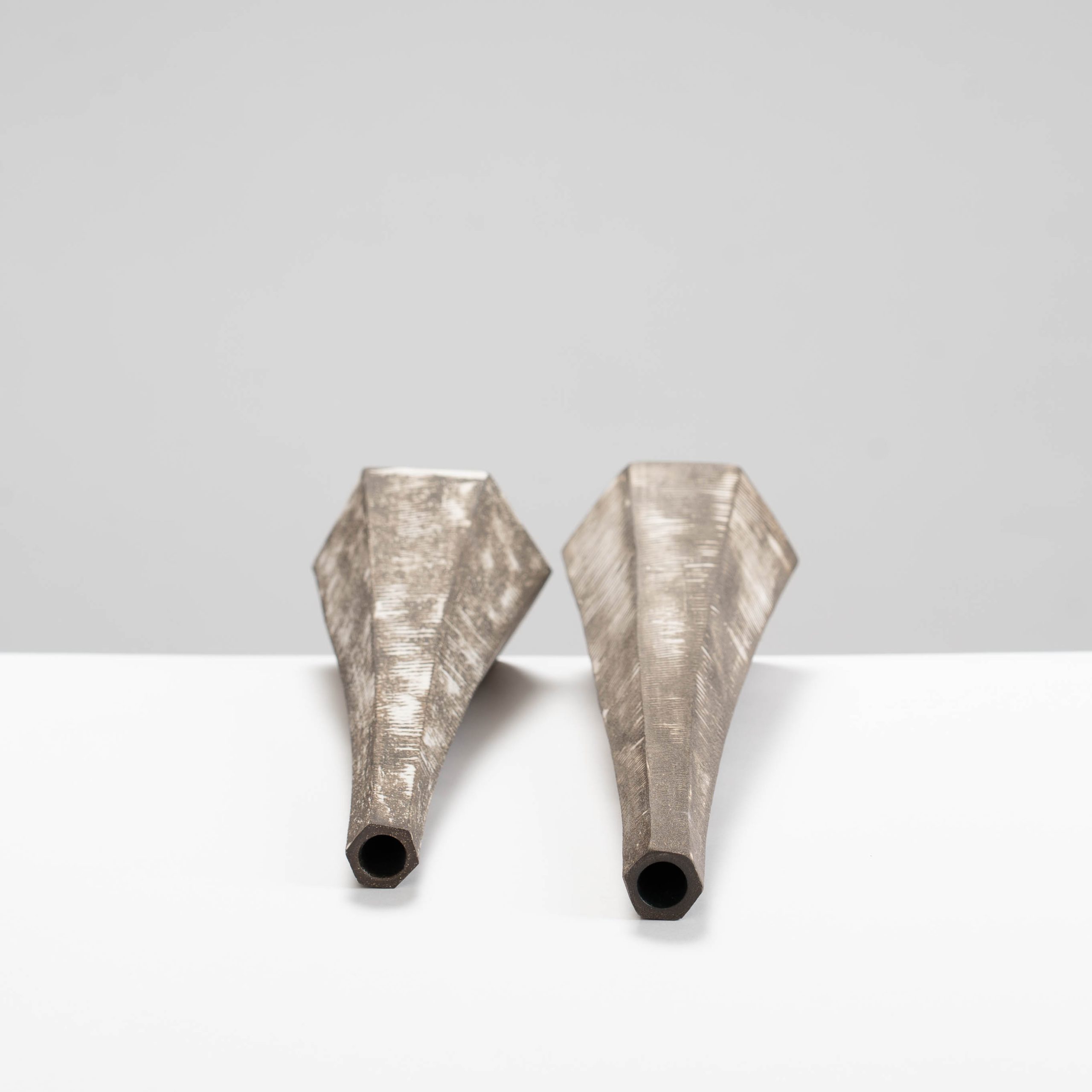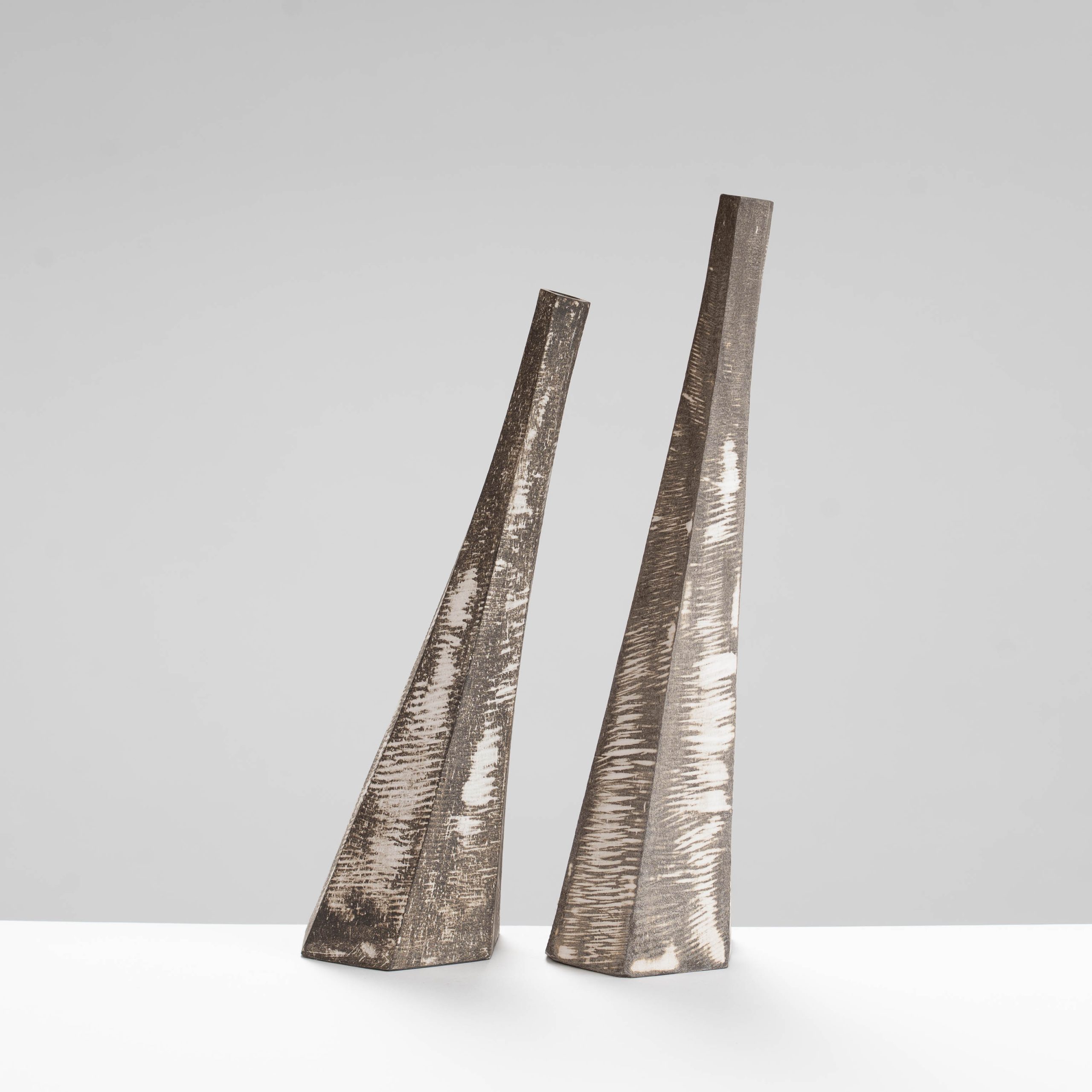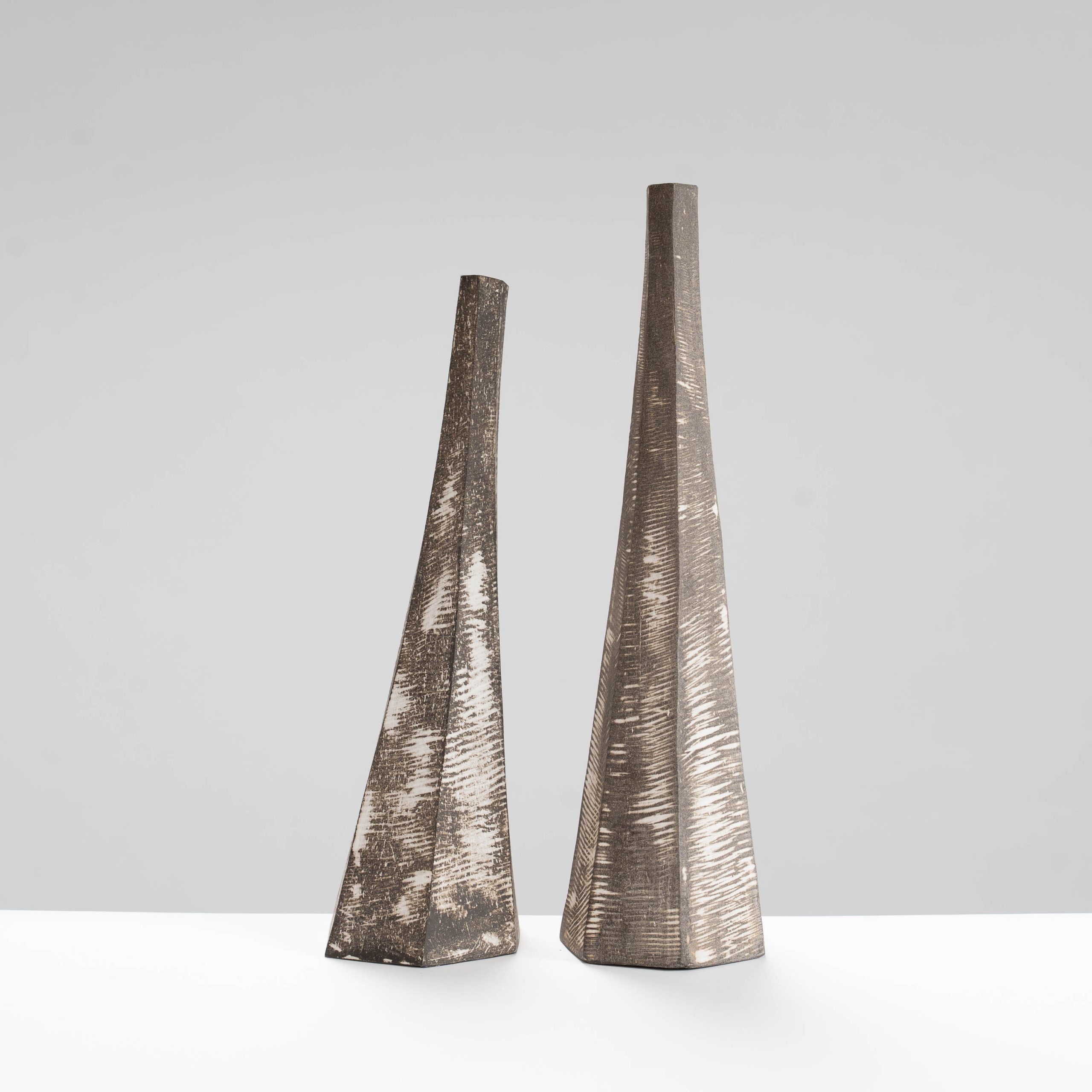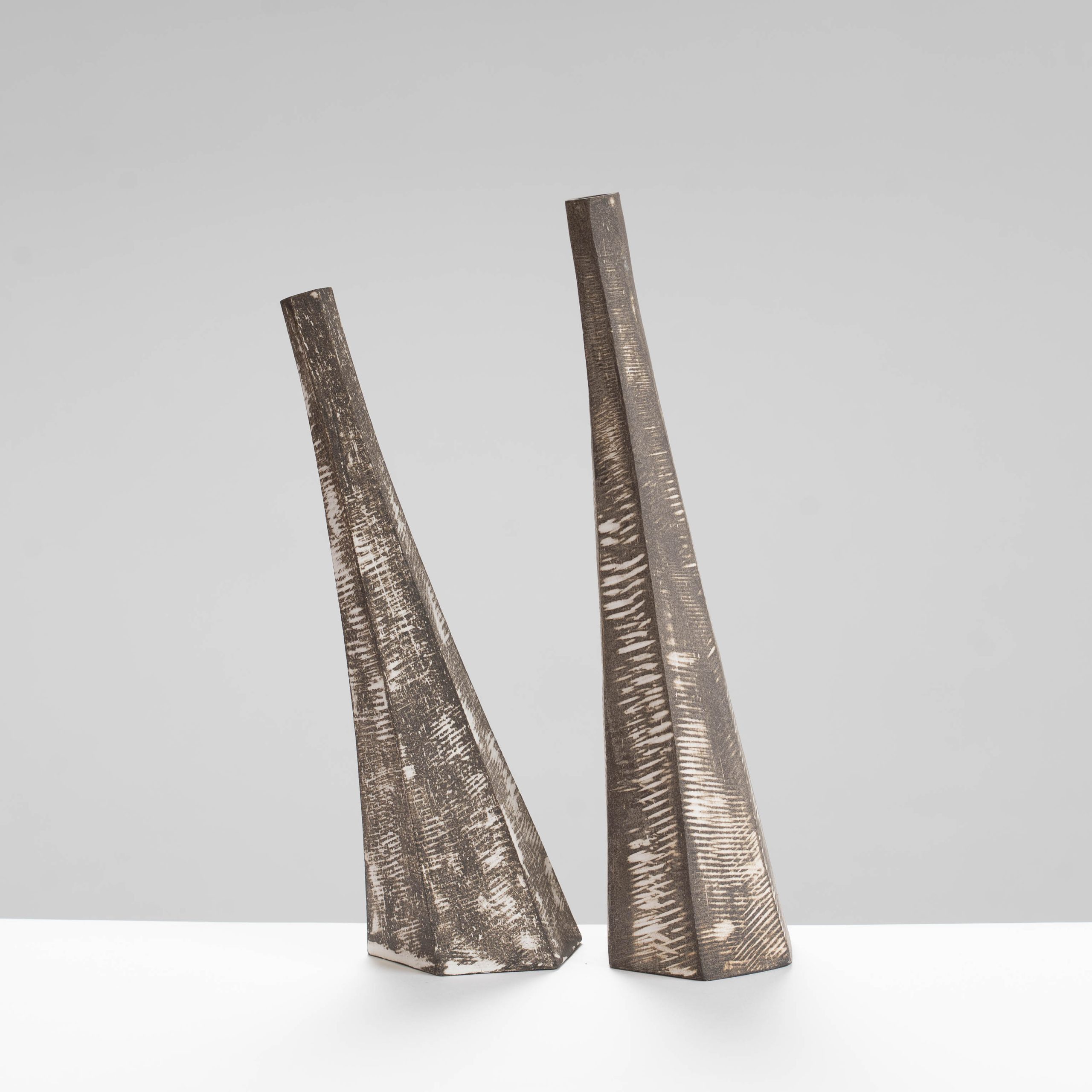 This elegant pair of bottles is thrown in dark stoneware clay and carved when leather hard. The interior is glazed and the exterior is unglazed with a textured and inlaid surface.