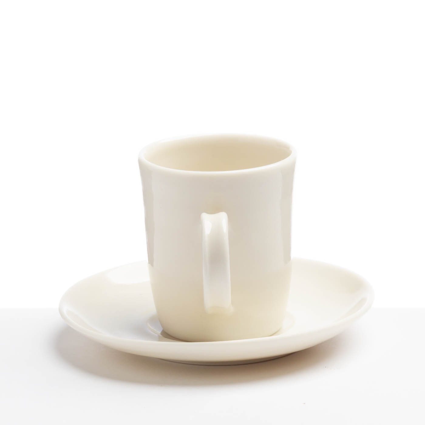 This cup and saucer set is wheel-thrown in porcelain. The form is quiet and simple and perfect for an espresso.
