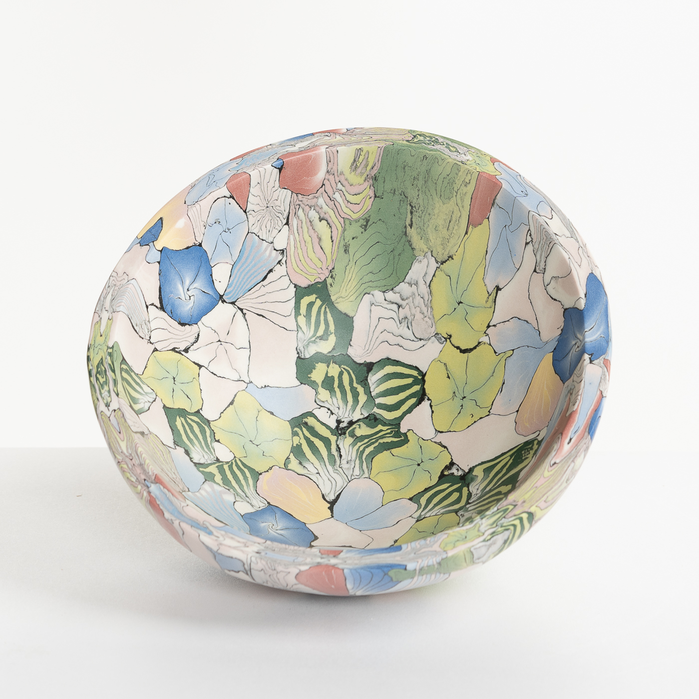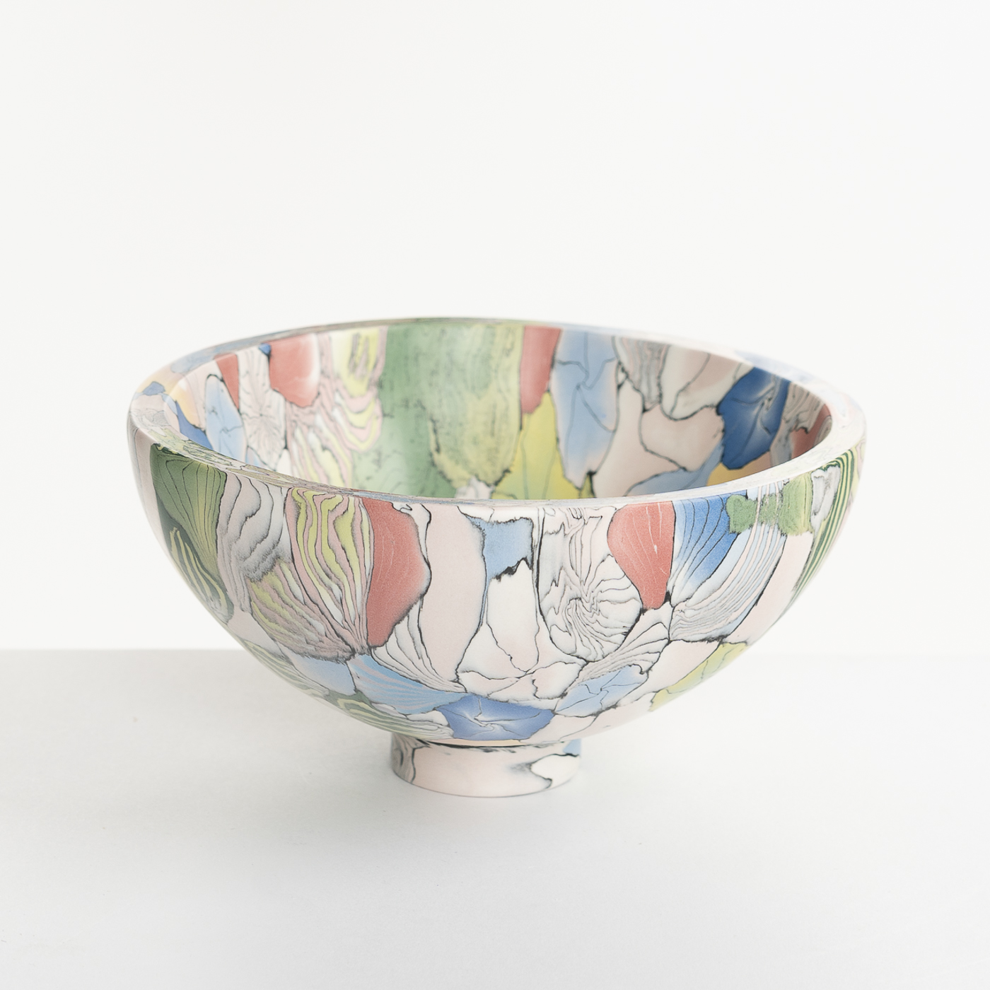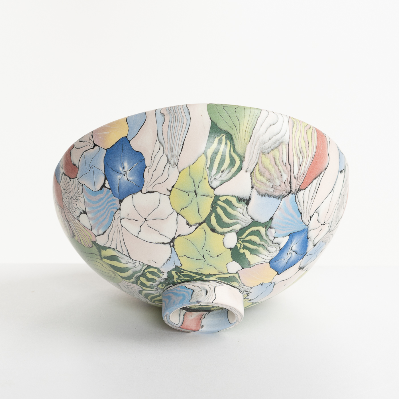 This porcelain bowl is hand-built using the Japanese technique called nerikomi. Coloured porcelain is stacked, then sliced through the cross section to reveal a pattern. Judy manipulates the slabs by hand to make a form which after firing is polished to create a silky surface.