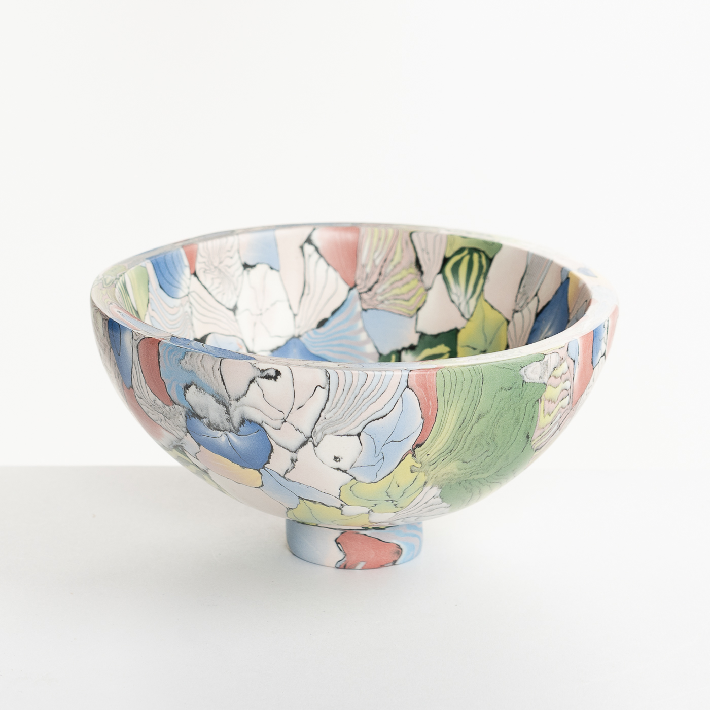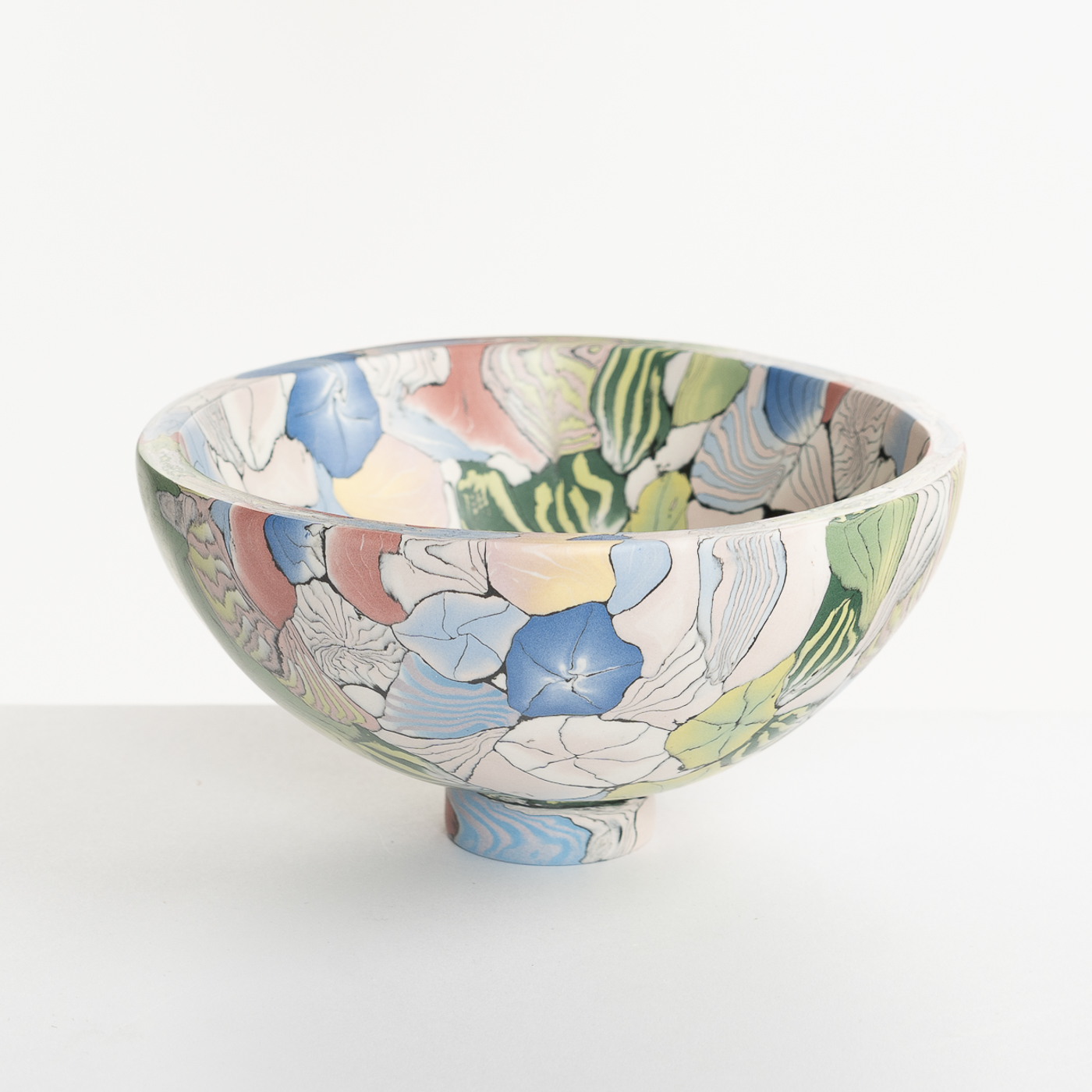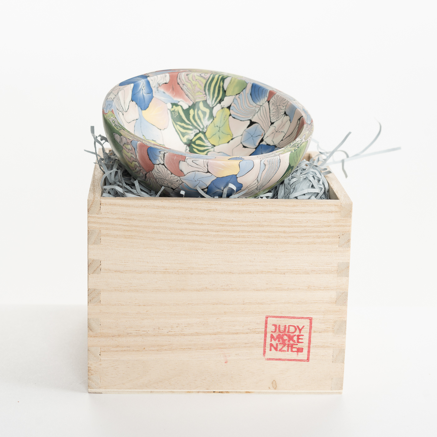 This porcelain bowl is hand-built using the Japanese technique called nerikomi. Coloured porcelain is stacked, then sliced through the cross section to reveal a pattern. Judy manipulates the slabs by hand to make a form which after firing is polished to create a silky surface.