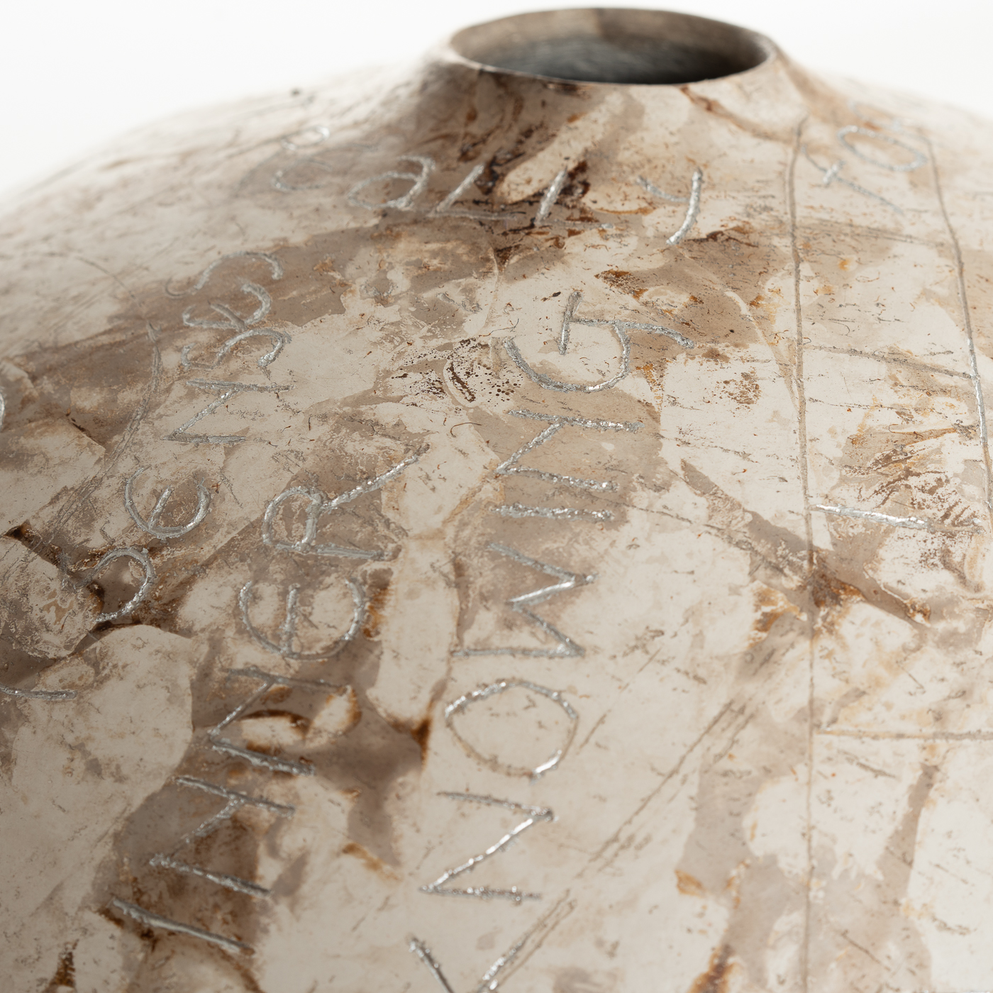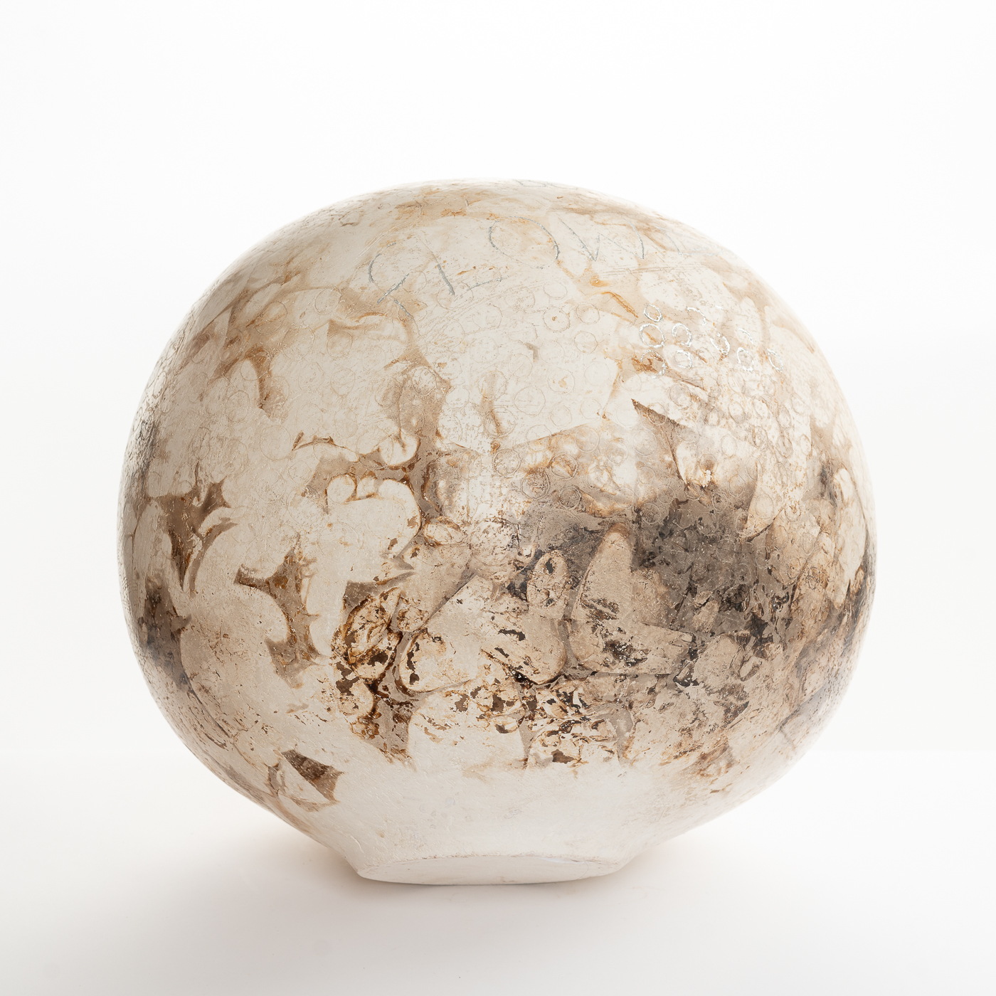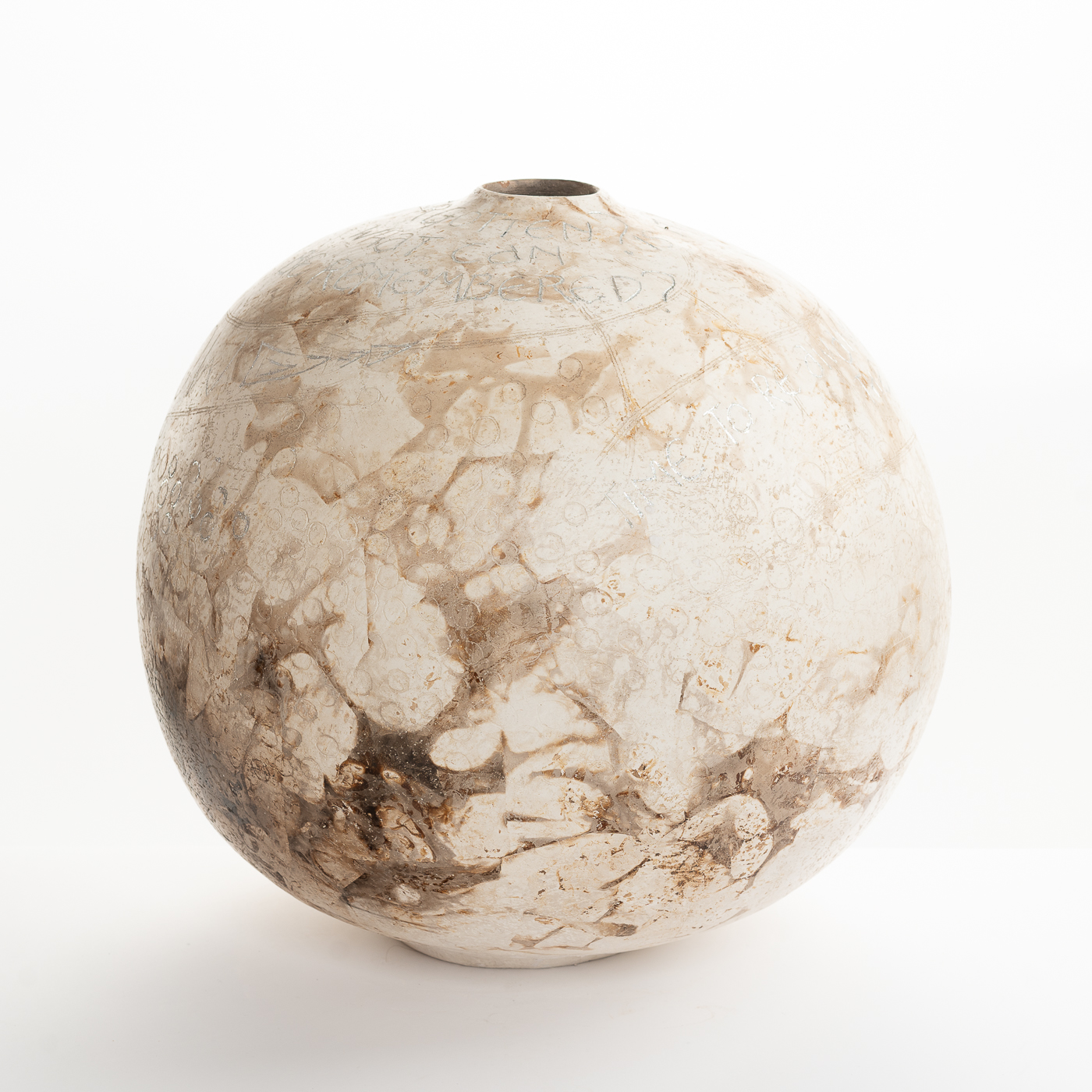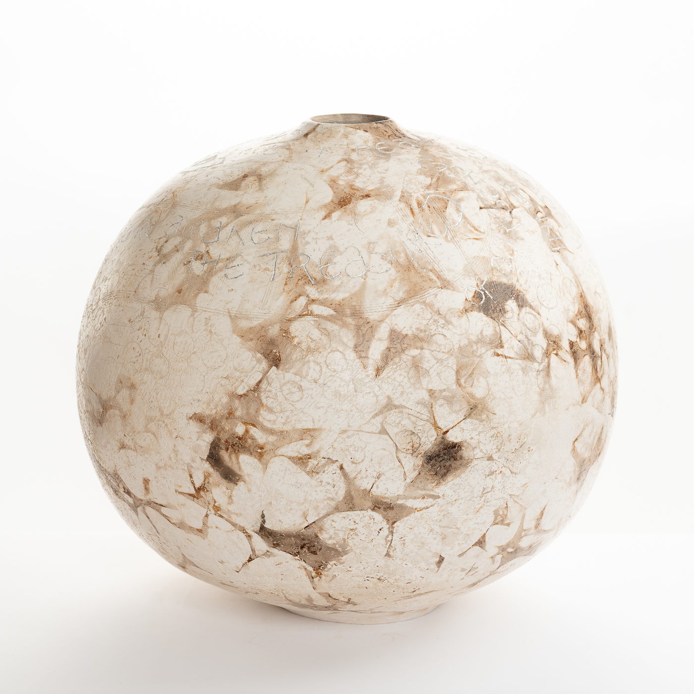 This smoke-fired vessel is coil-built and finished with silver leaf. Jane’s work is inspired by time spent in Africa absorbing the spiritual qualities of clay use there.