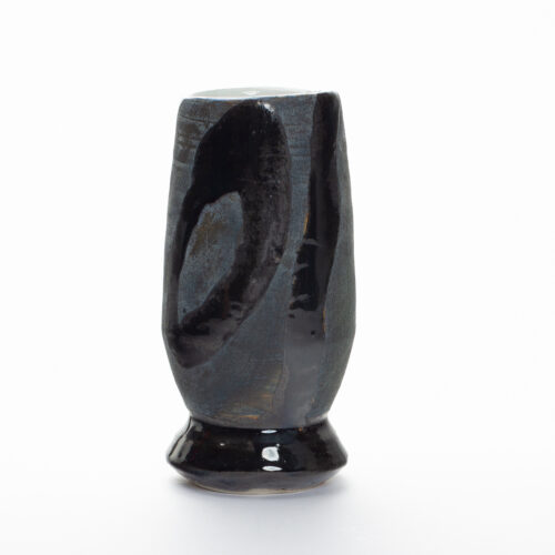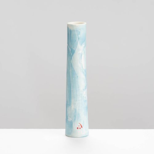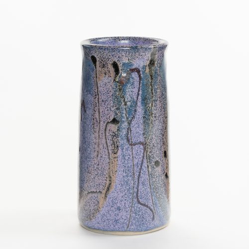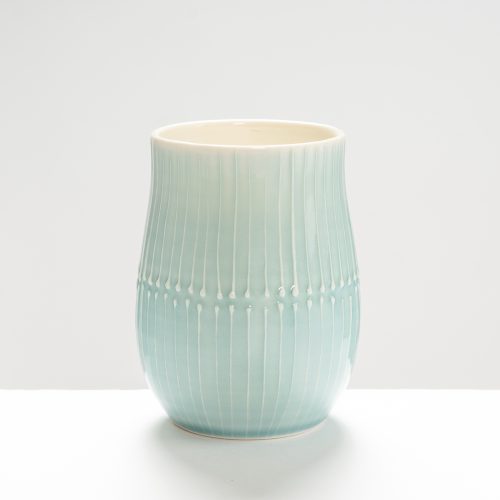 This porcelain vessel is hand-built with inlaid sgraffito illustration. Blue underglazes and washes animate the design.