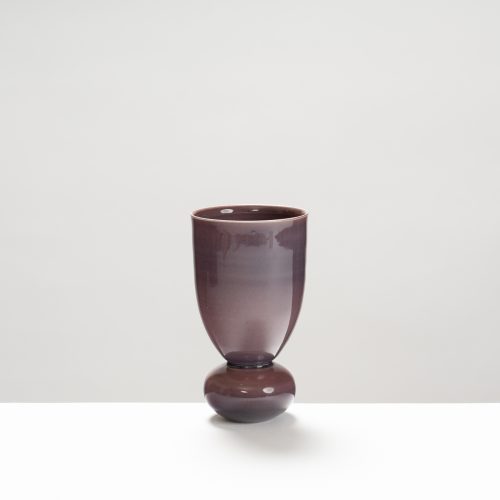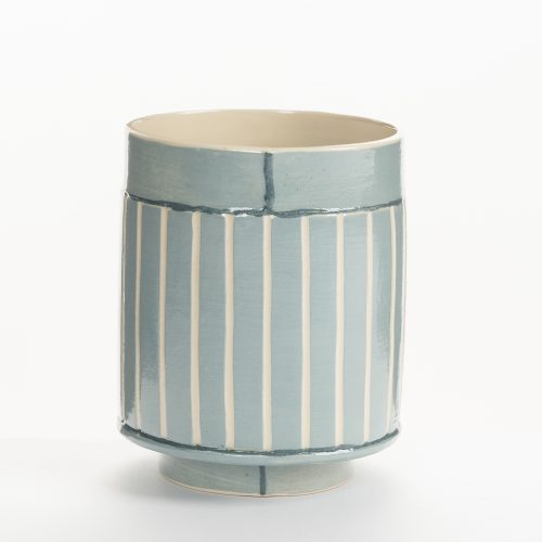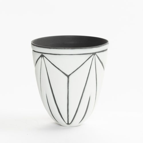 This vessel is wheel thrown and naked raku fired. It expresses Gaby’s interest in the interplay between the controlled form and the ‘seemingly’ random nature of the surface marks created by smoke and metallic, chemical reactions.
