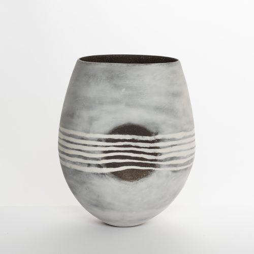 Gaby’s current focus is making saggar-fired, wheel-thrown pots. What originally drew her to this type of making was the interplay between the highly controlled form, and smooth, polished, surface texture of the piece on the one hand; and the ‘seemingly’ random nature of the surface marks created by smoke and metallic, chemical reactions, on the other.