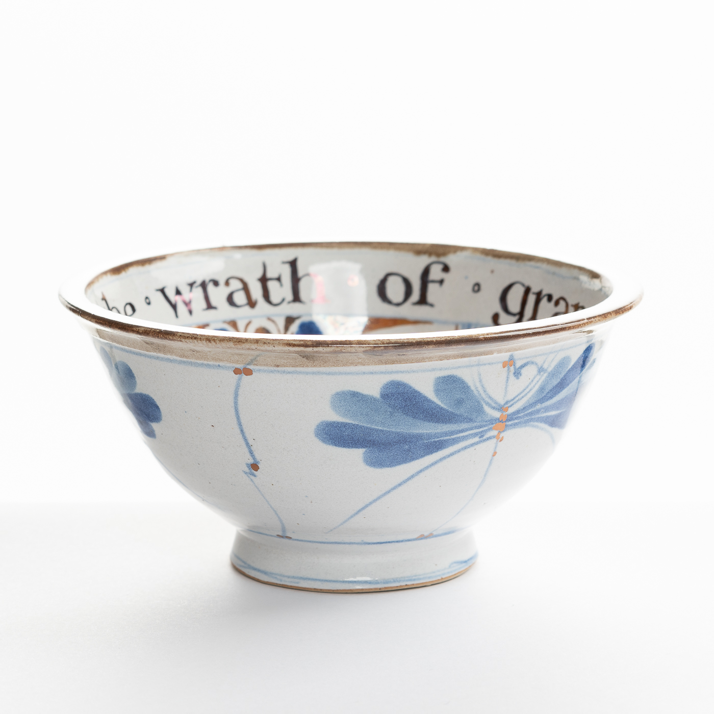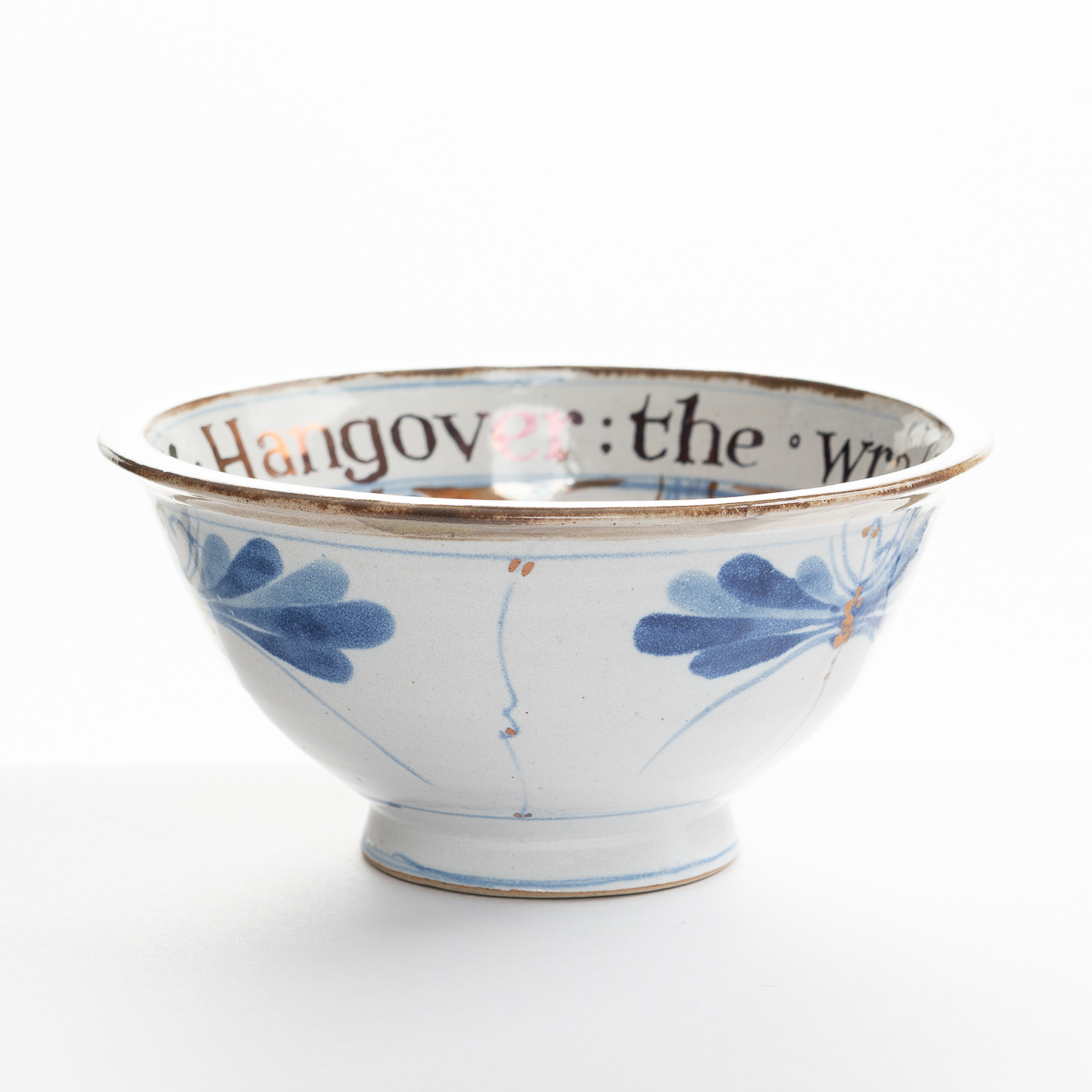 This stoneware bowl is ornately decorated with skilled brush-work and finished with lustre calligraphy. The words are usually humorous aphorisms.