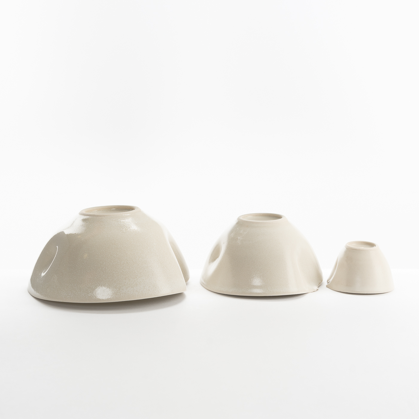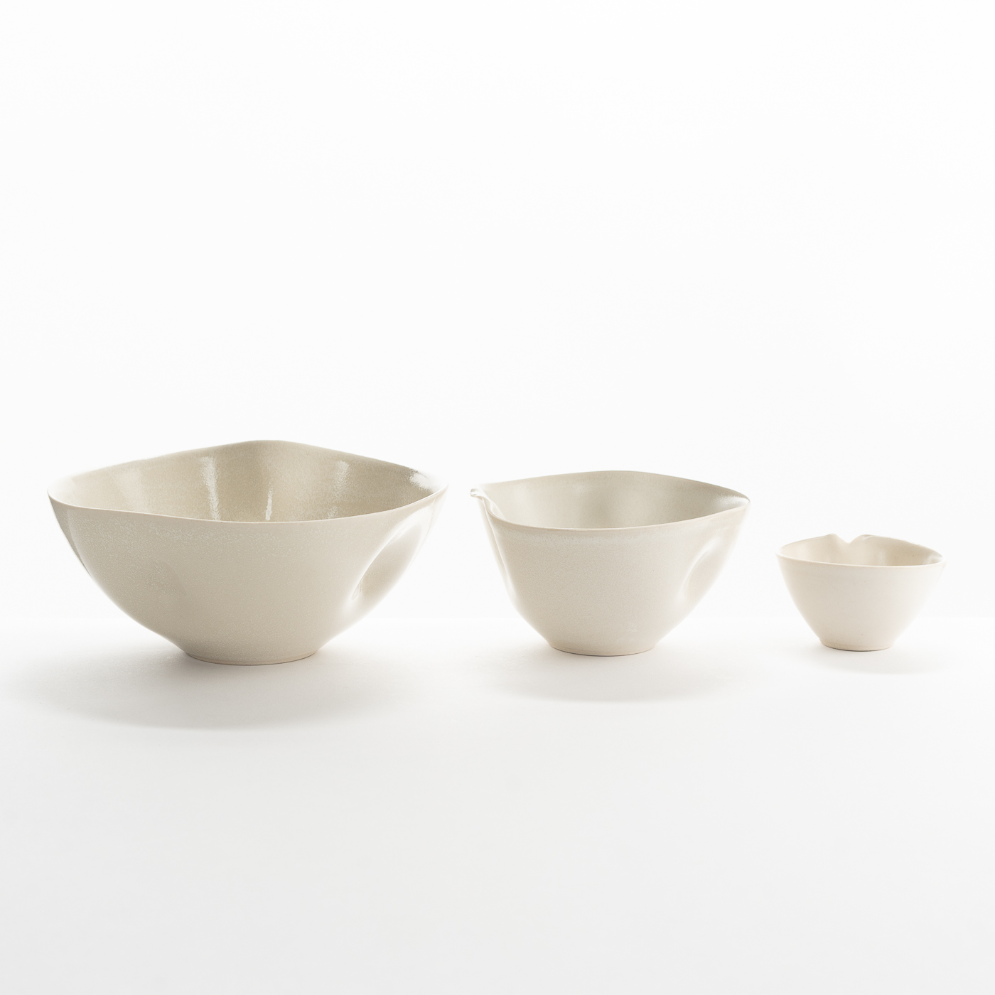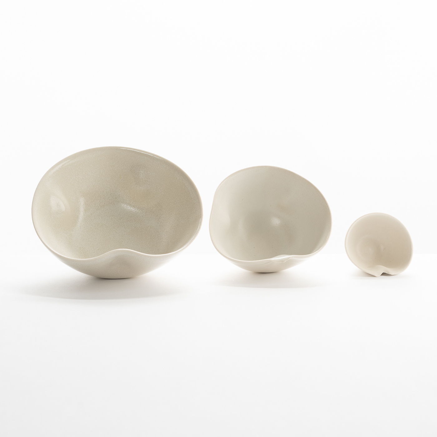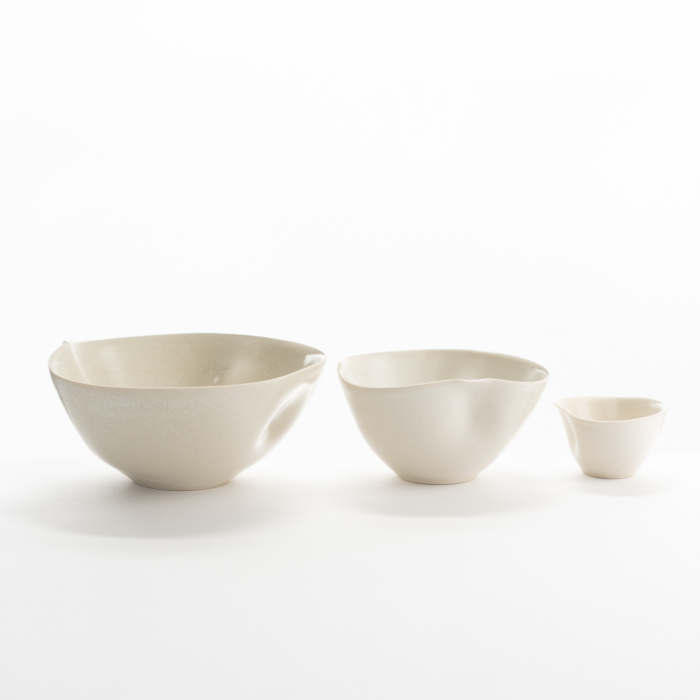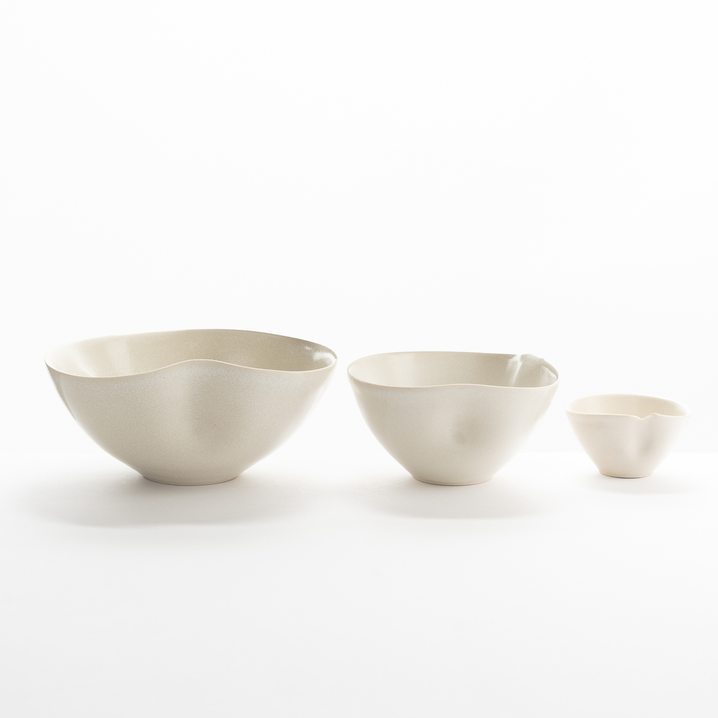 This set of three porcelain nesting bowls are wheel-thrown and altered, featuring torn rims and enveloped in a semi-matt cream glaze.