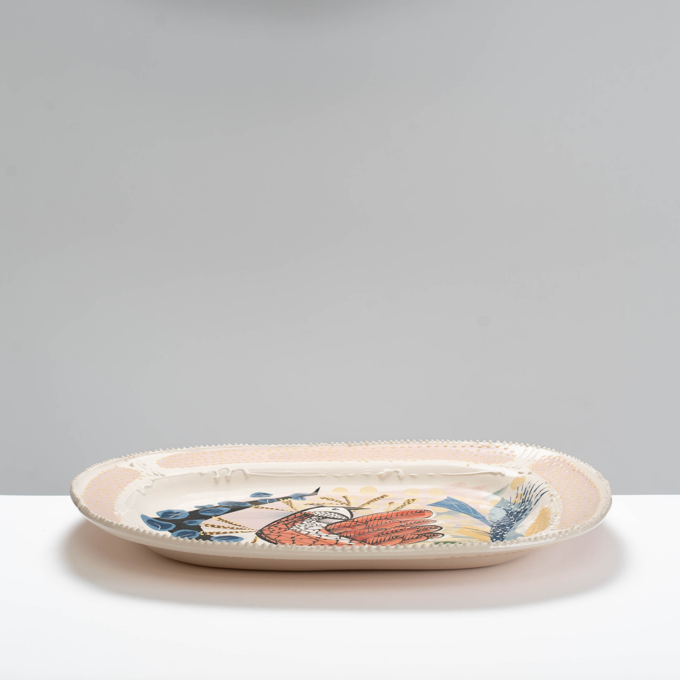 Full of character and charm, this earthenware plate is slab-built and carefully decorated in Irena’s classic and animated slip decoration.