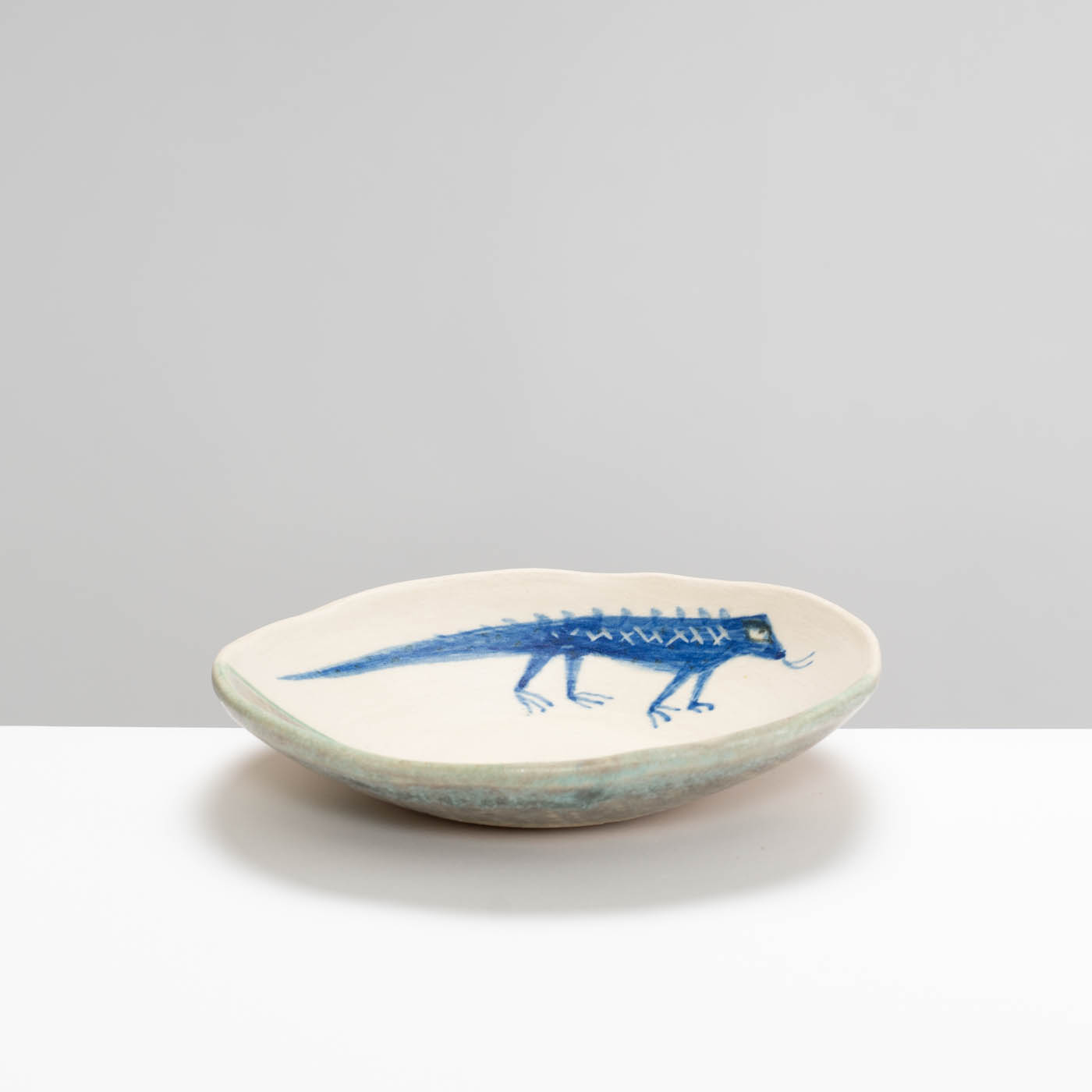This stoneware plate is hand-built and decorated. Jill uses a variety of techniques with coloured slips and glaze, textures, and often with skilful hand-painted motifs.