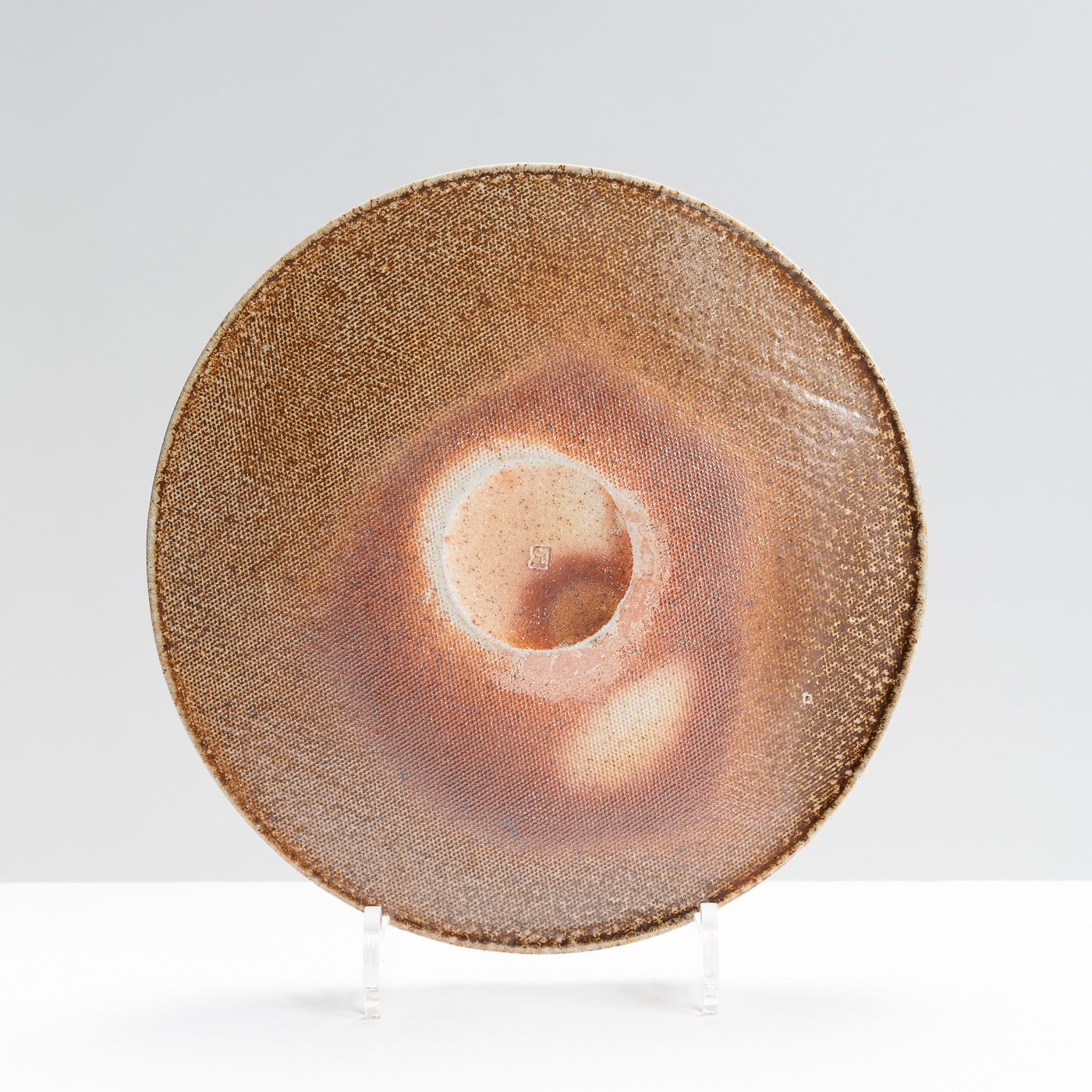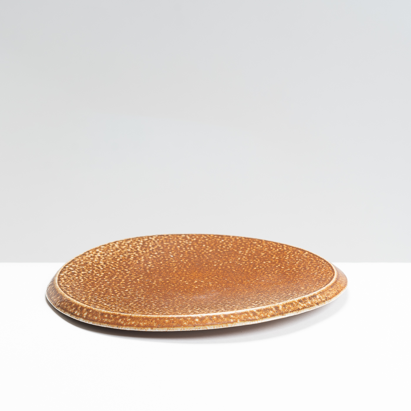 This stoneware plate is wheel-thrown with a beveled rim. It’s distinctive lustrous and orange peel finish is the result of a salt glaze firing.