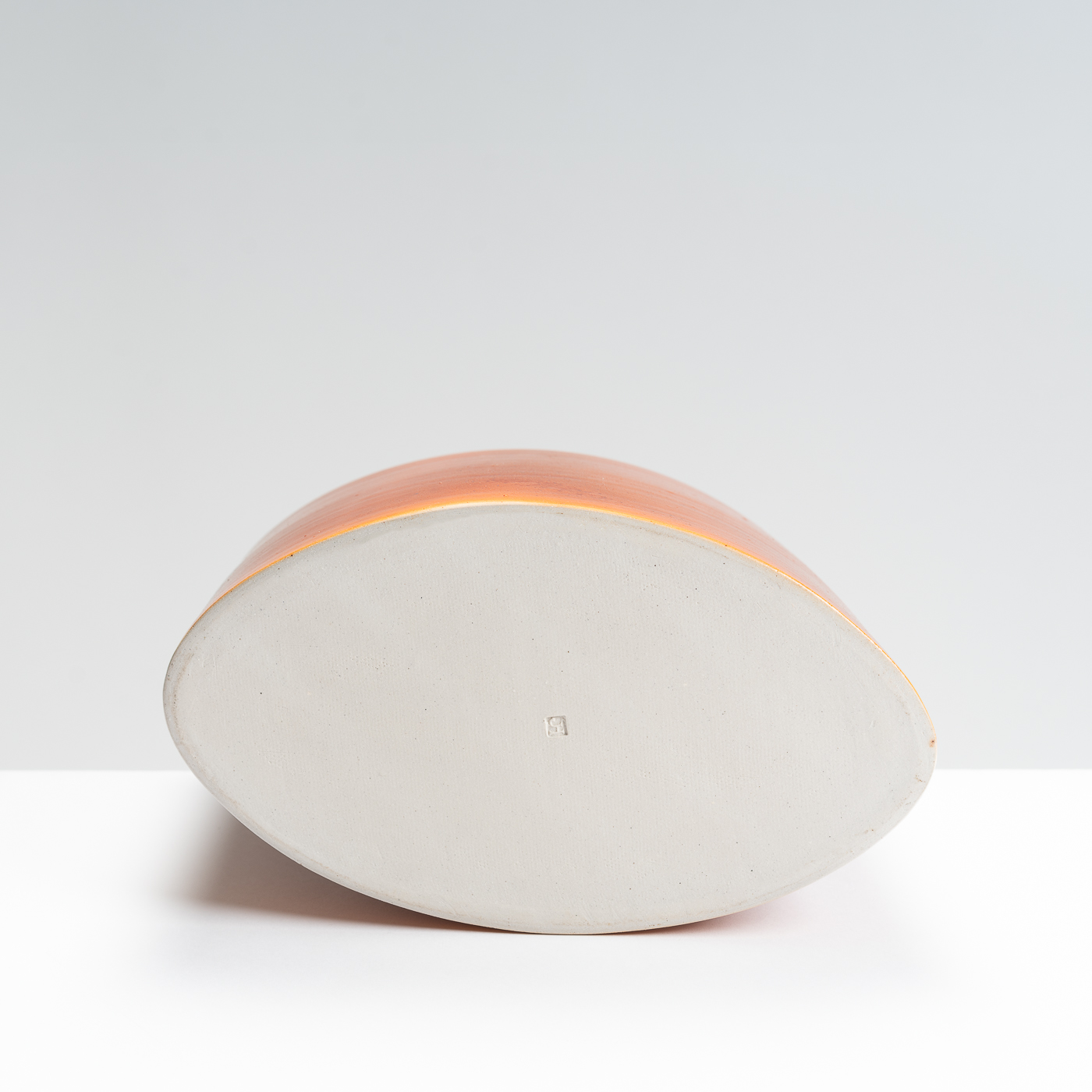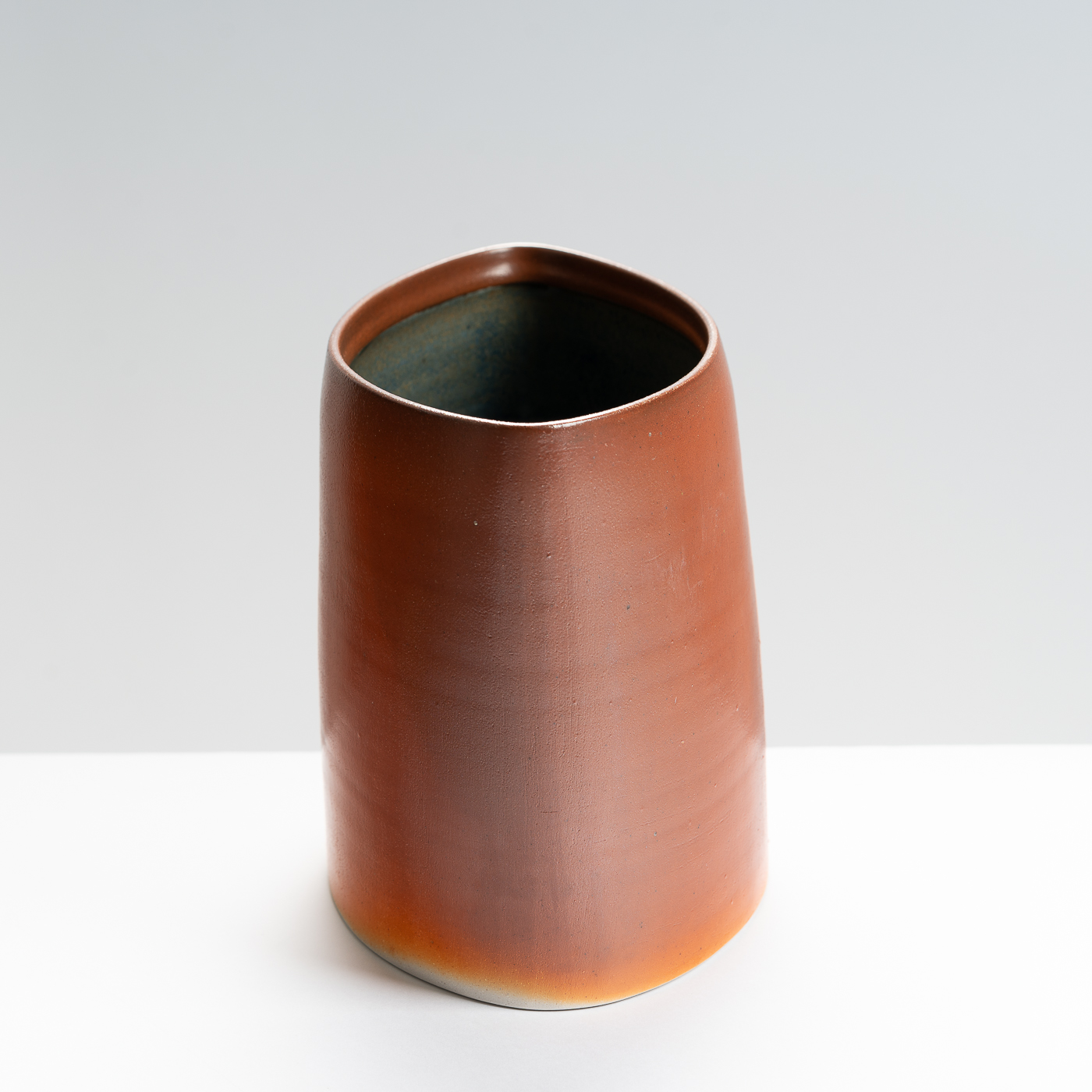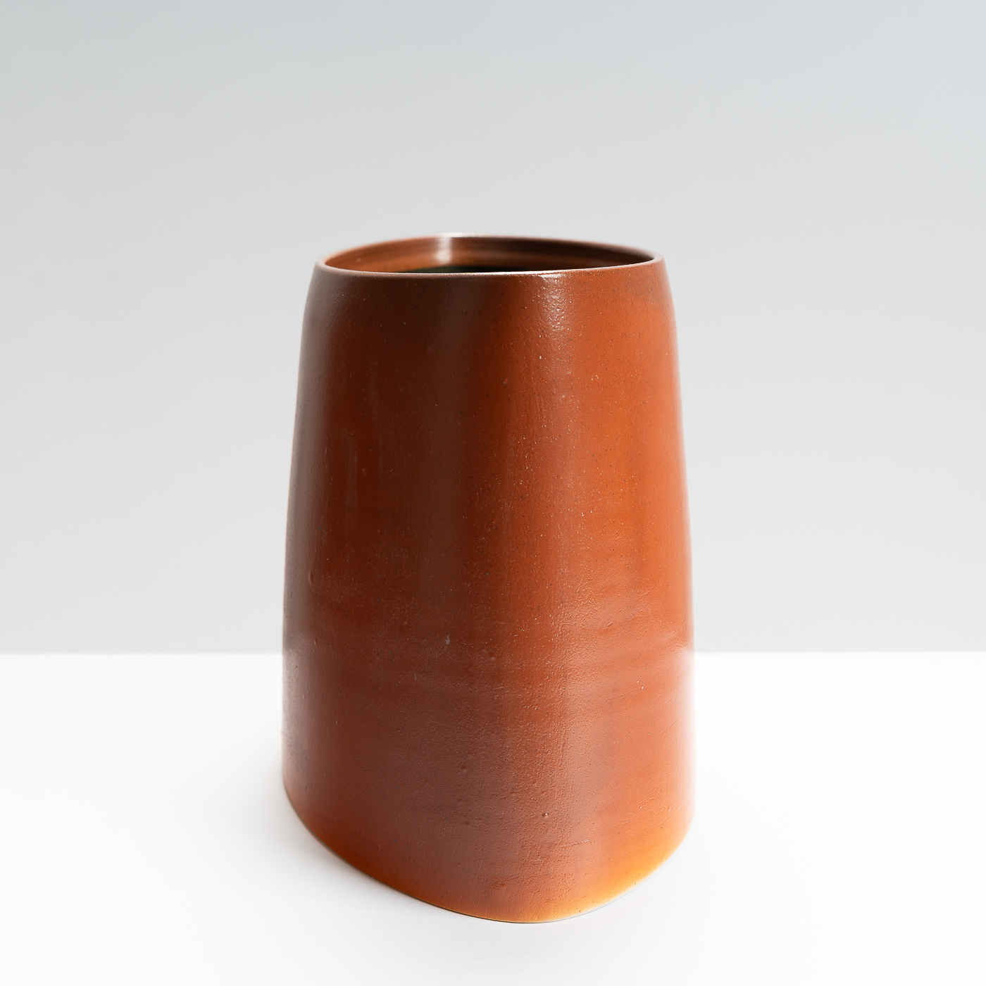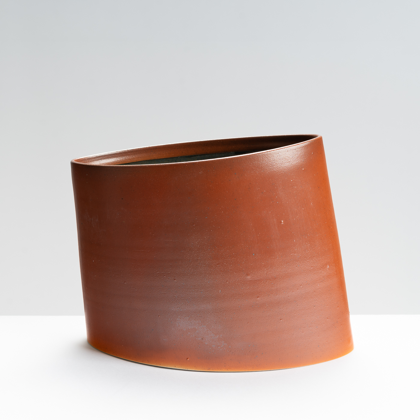 This slanted vase is wheel-thrown and then altered to lean at an elegant angle. It’s distinctive lustrous and orange peel finish is the result of a salt glaze firing.