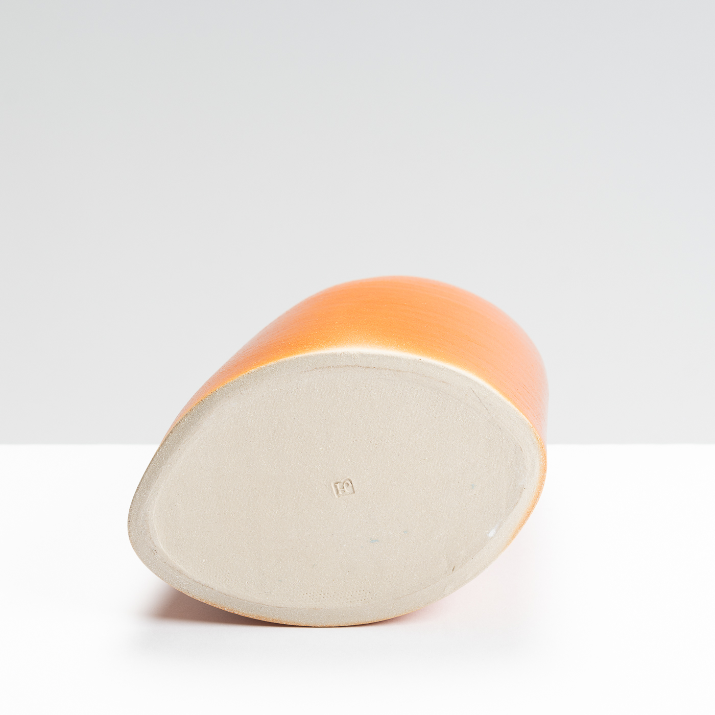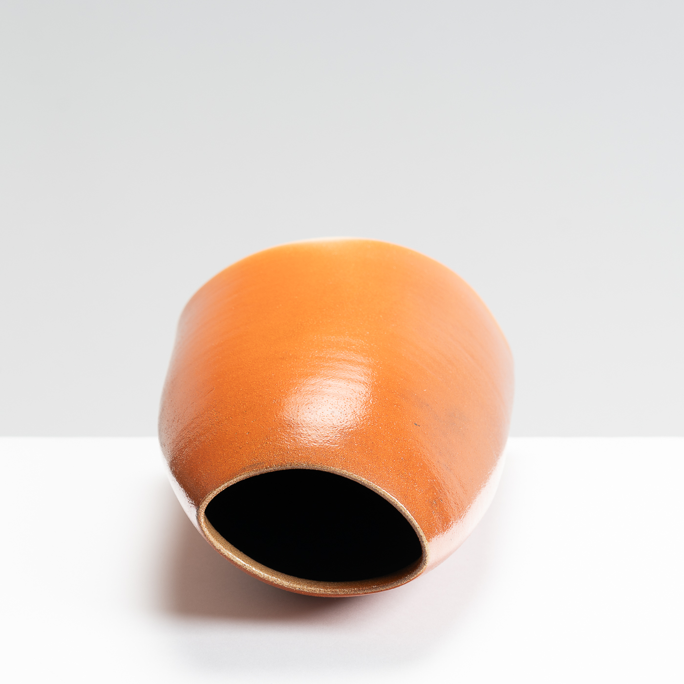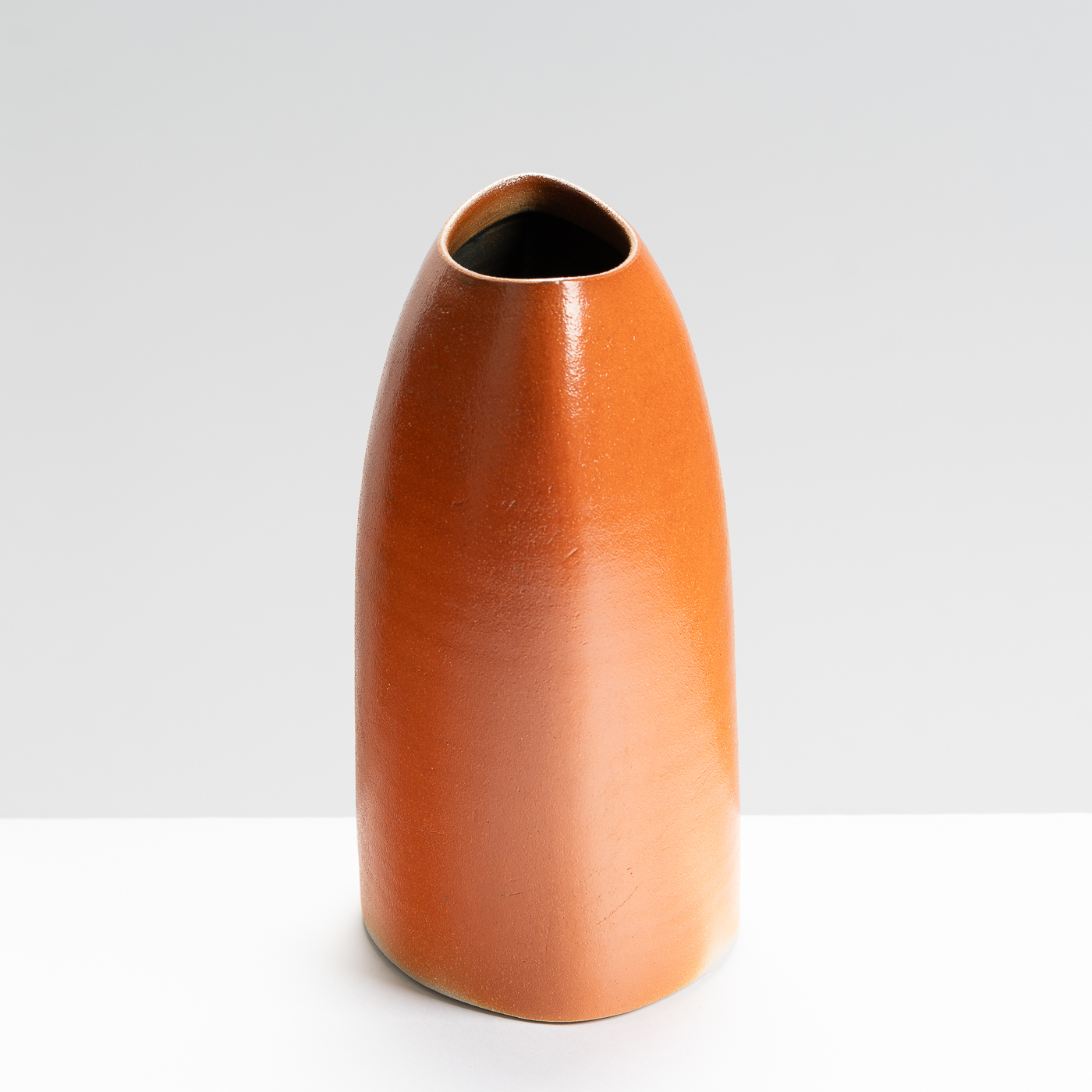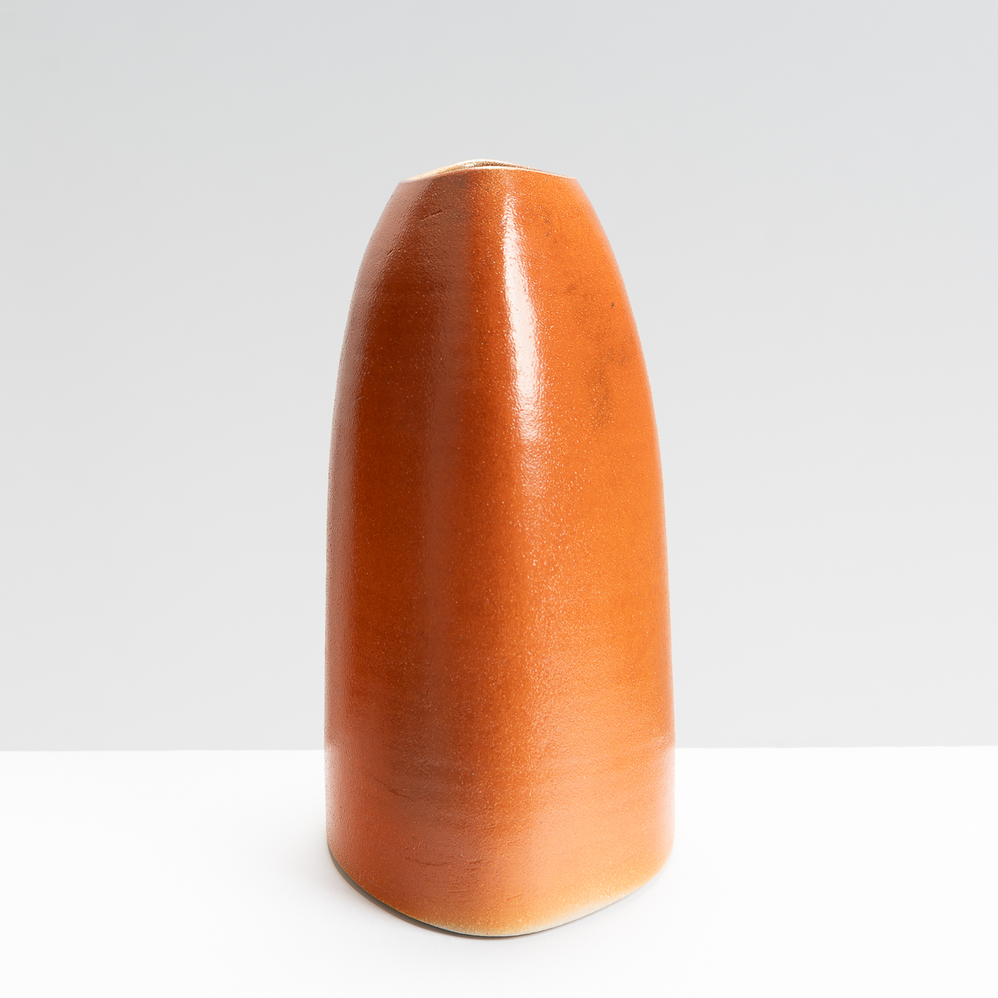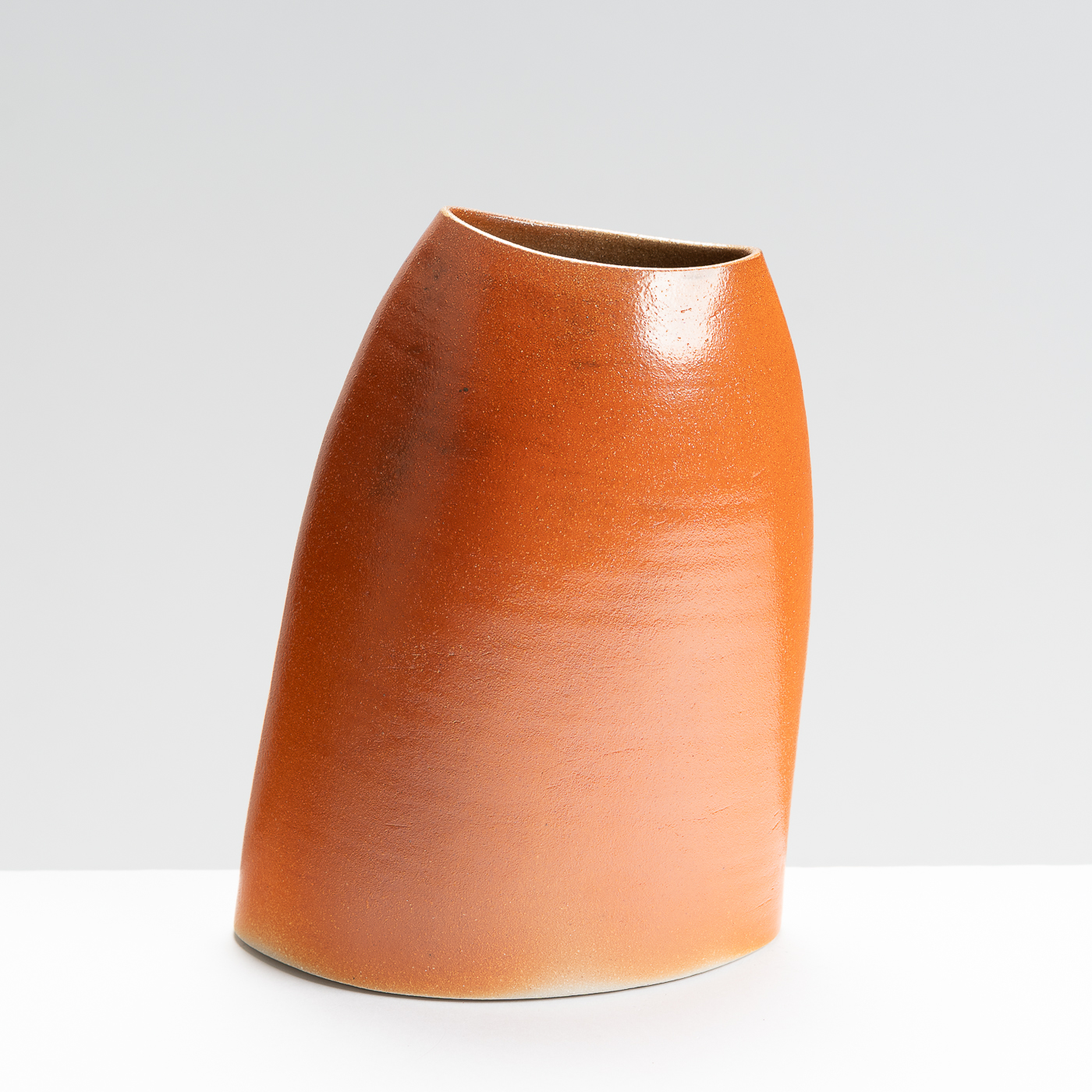 This slanted vase is wheel-thrown and then altered to lean at an elegant angle. It’s distinctive lustrous and orange peel finish is the result of a salt glaze firing.