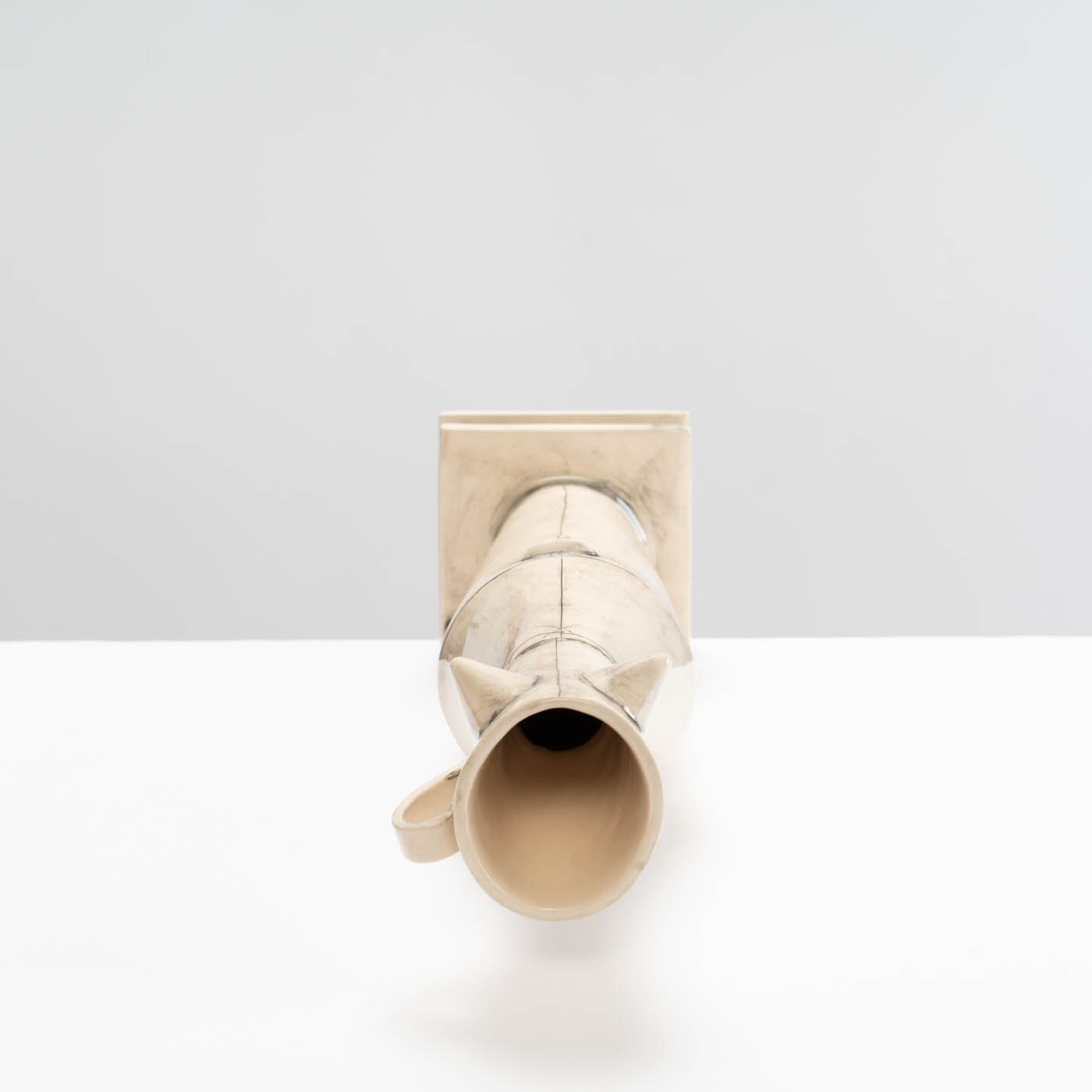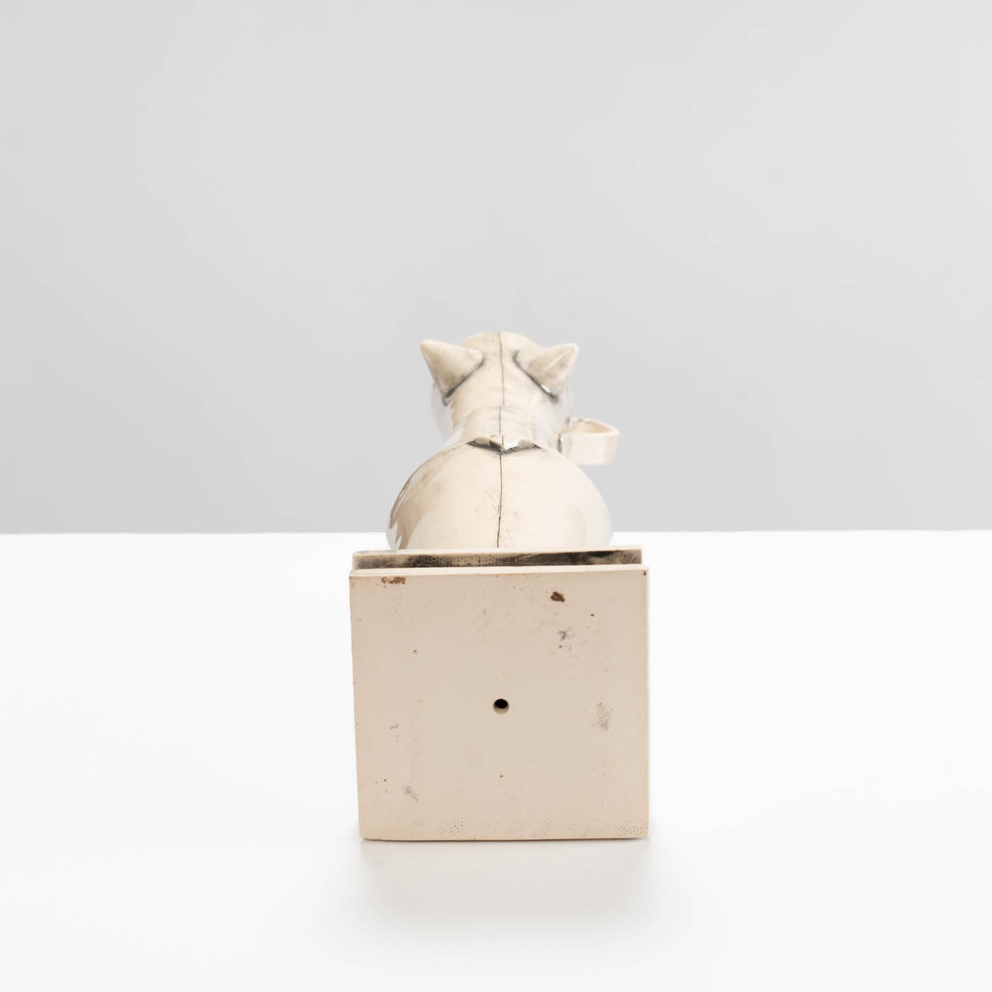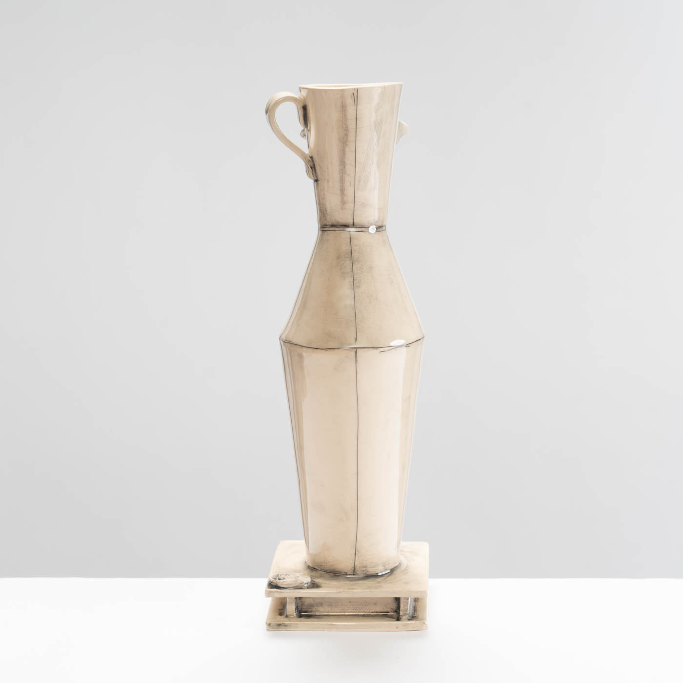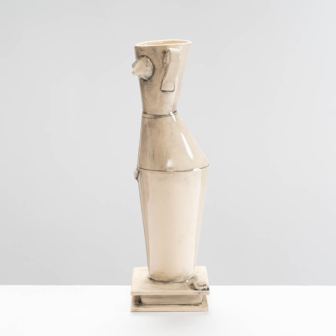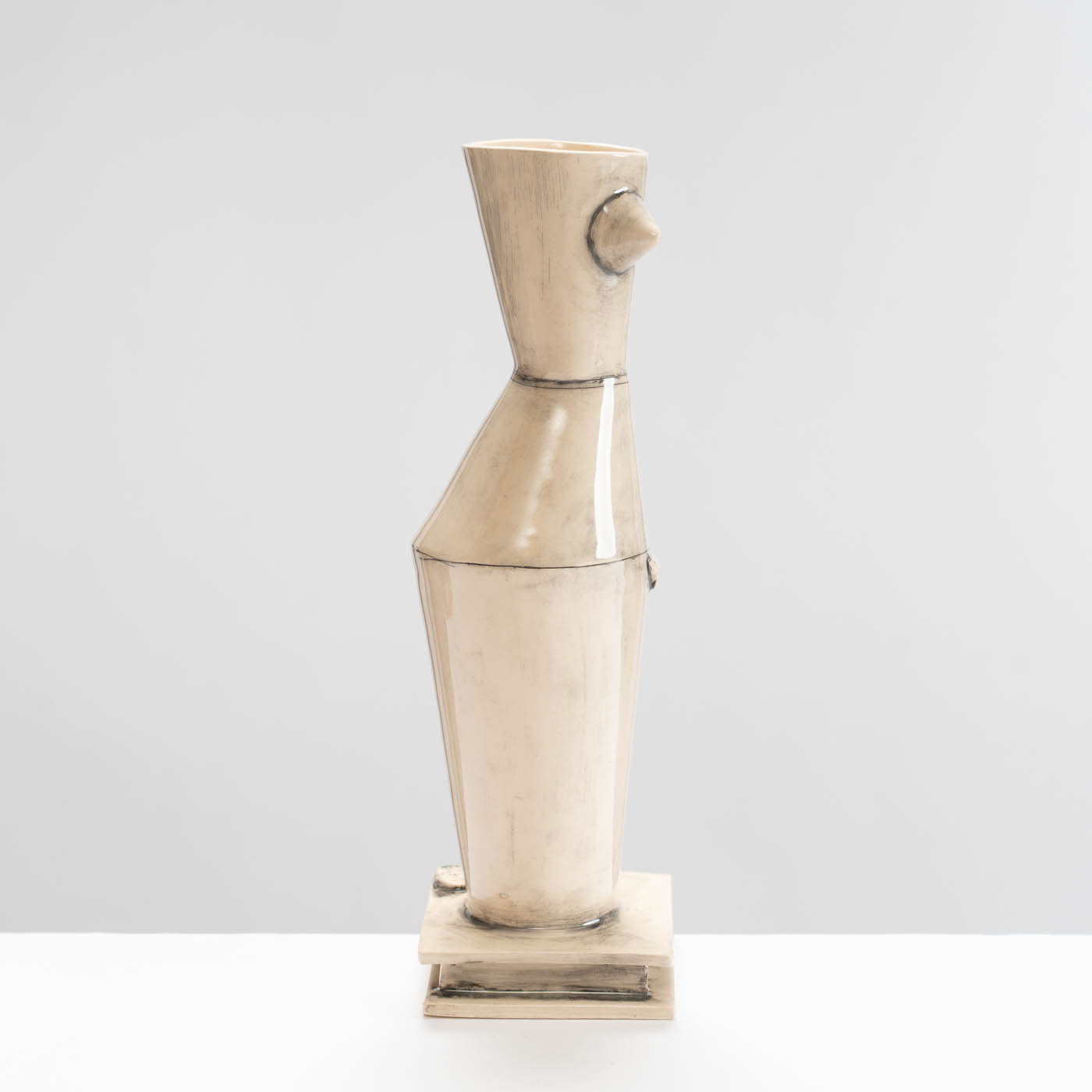 This earthenware sculpture is slab-built. The piece is decorated with washed-back stain accentuating the joins, and finished with glaze.