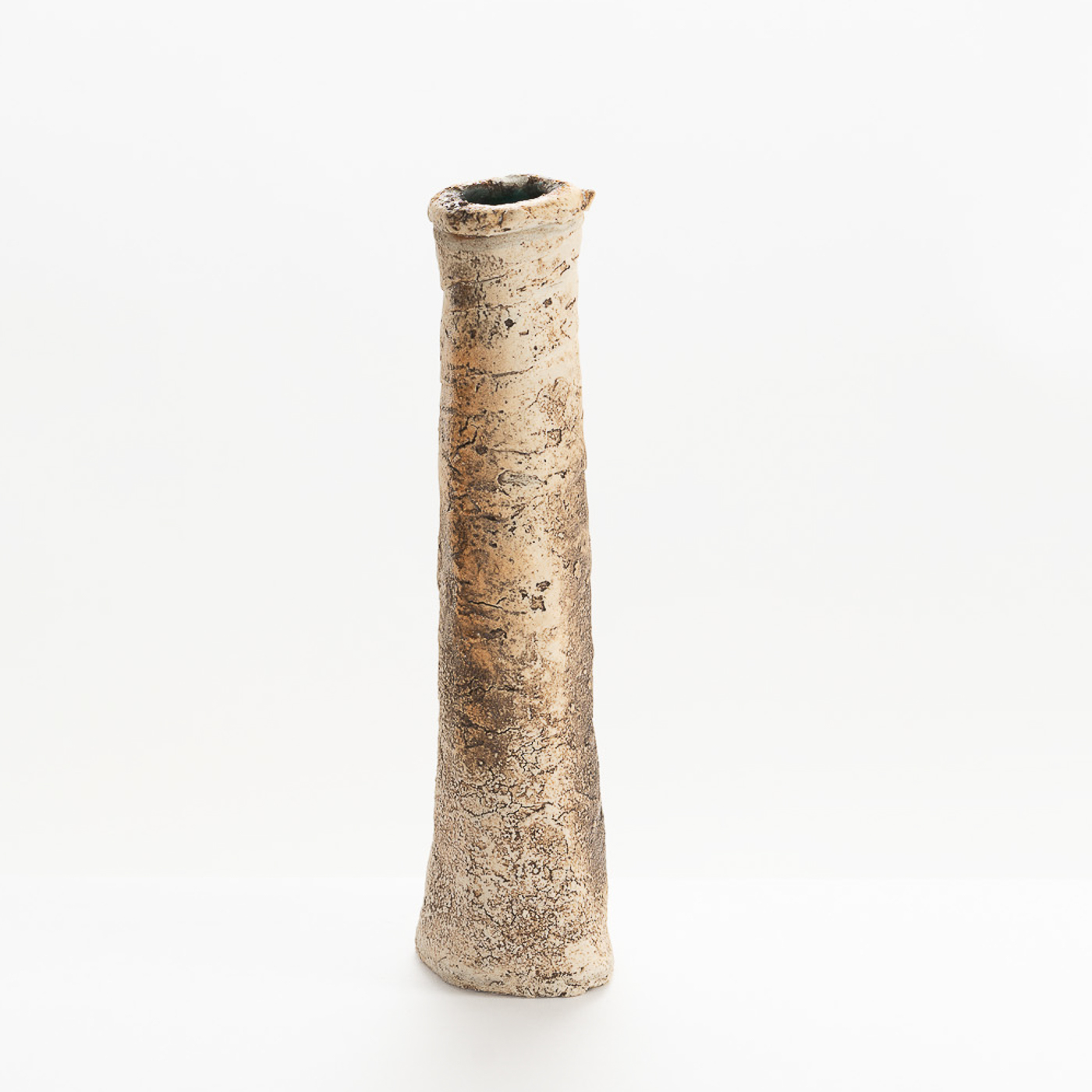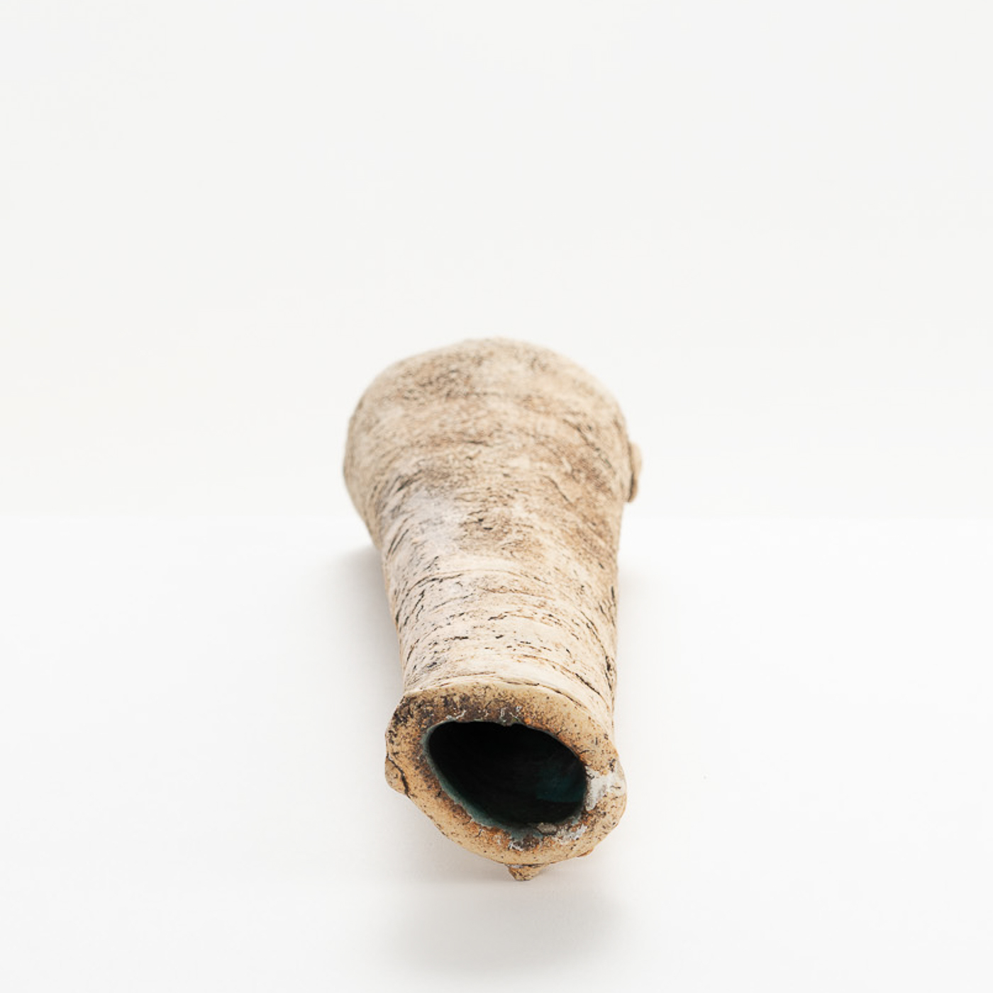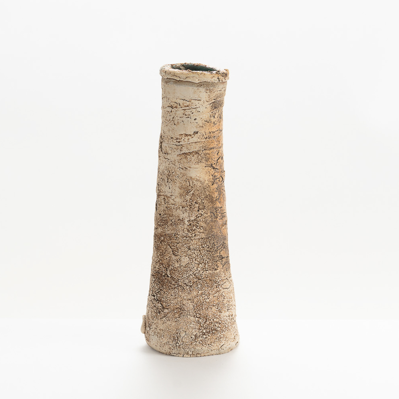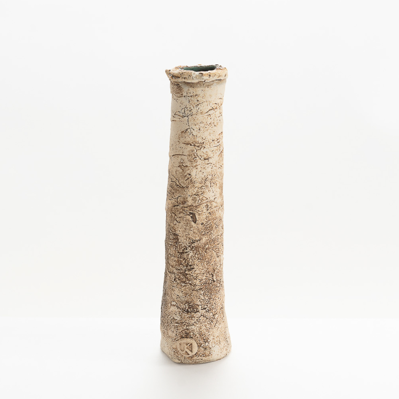 This stoneware vase is hand-built in ball clay. Elements of John’s inspiration by ancient Greek pottery can be detected in the sandy textured surface and the deep turquoise interior.