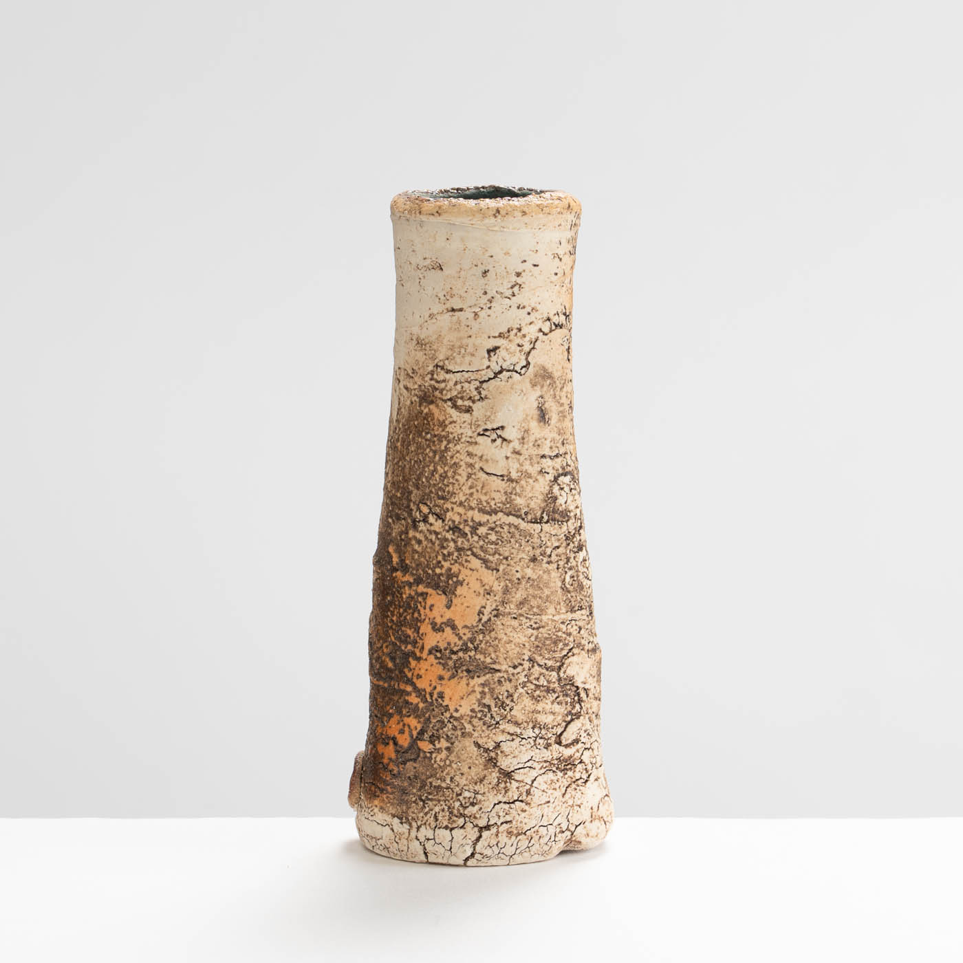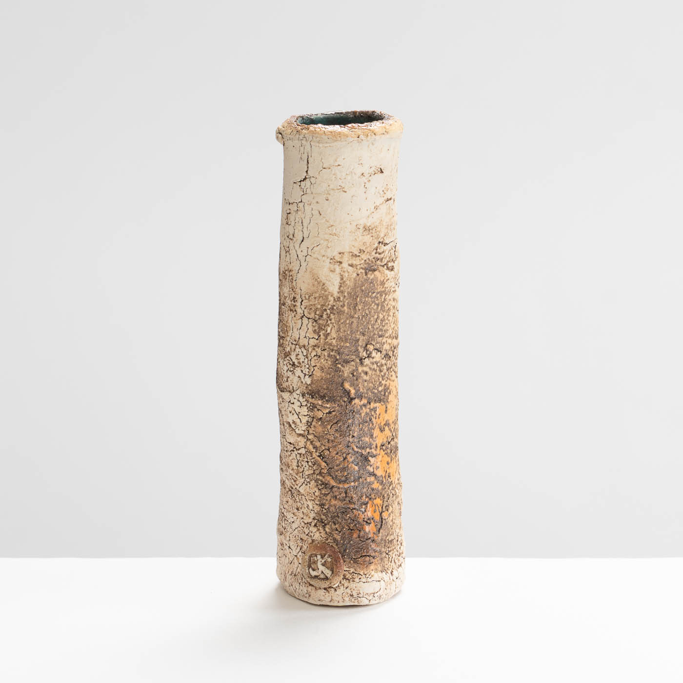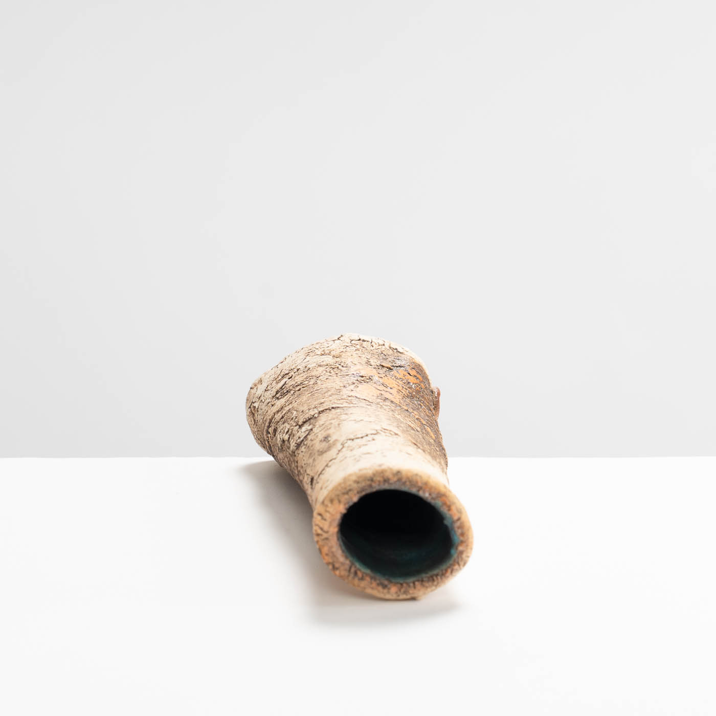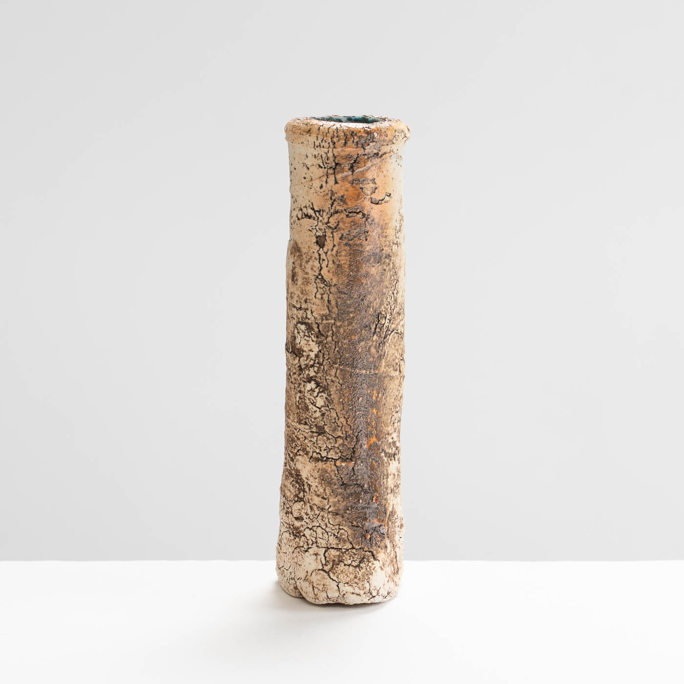This stoneware vase is hand-built in ball clay. Elements of John’s inspiration by ancient Greek pottery can be detected in the sandy textured surface and the deep turquoise interior.