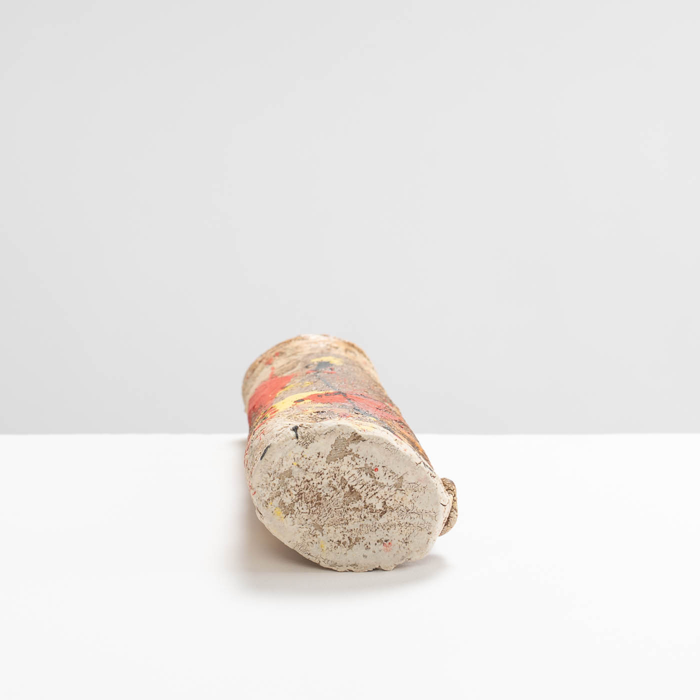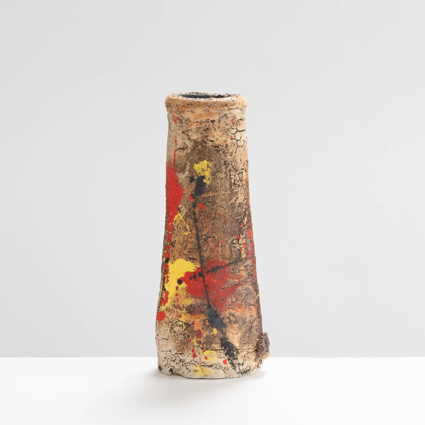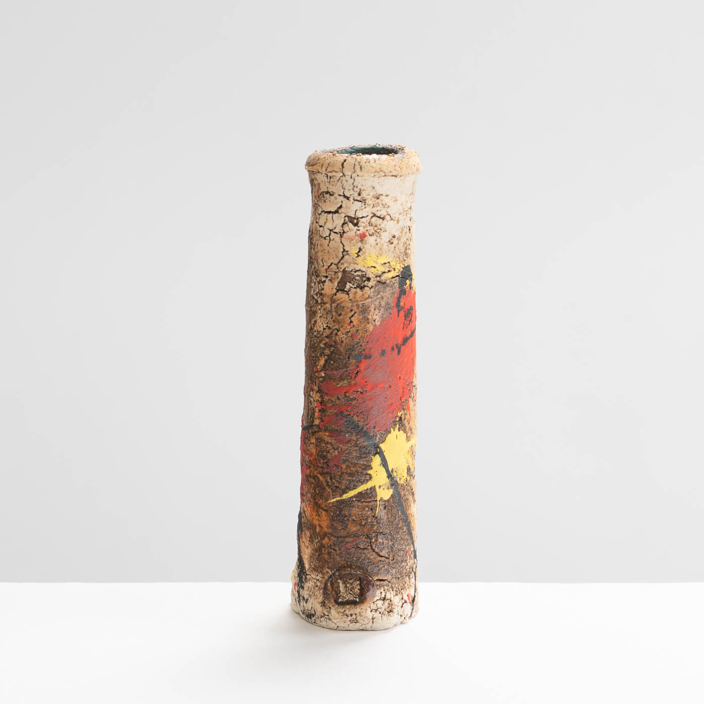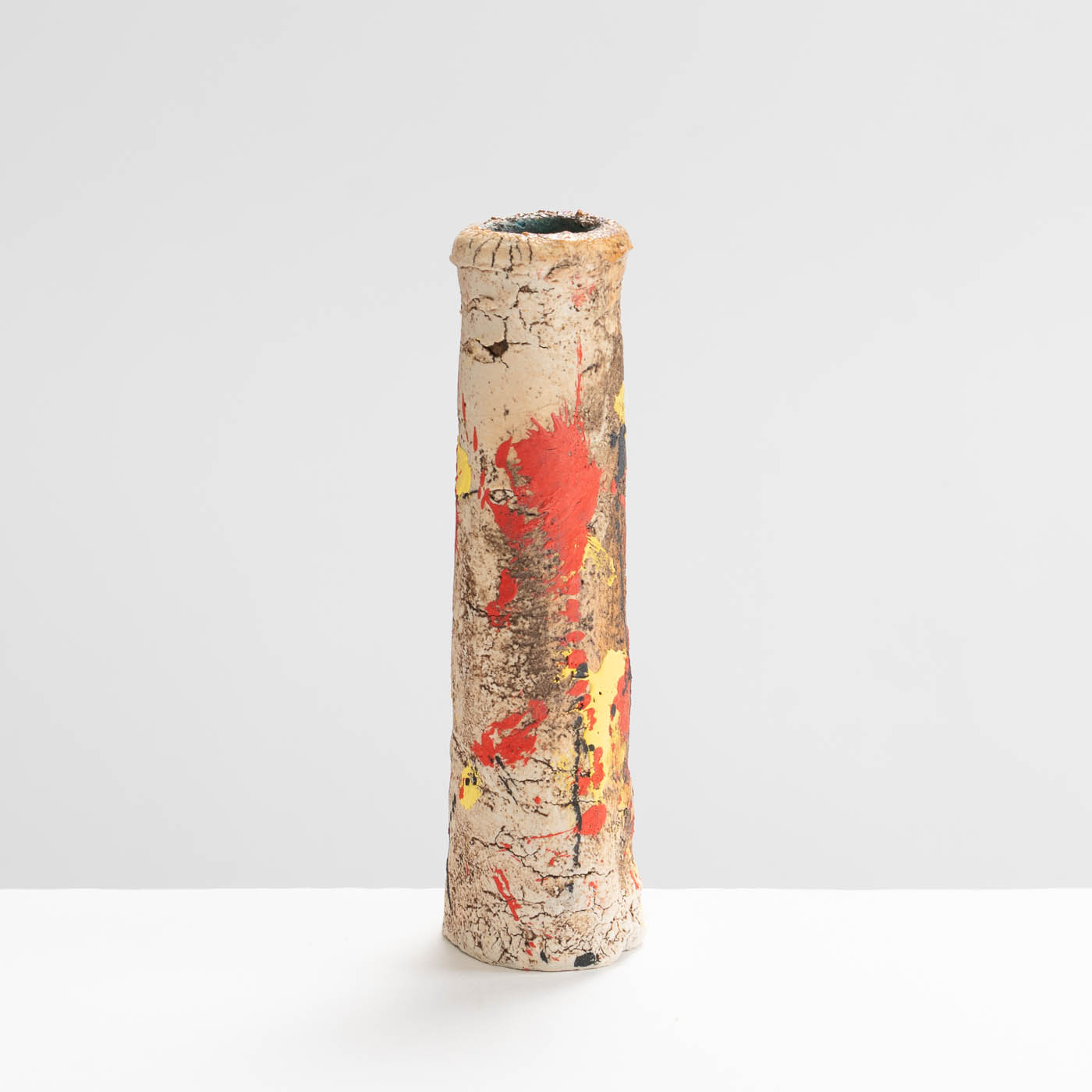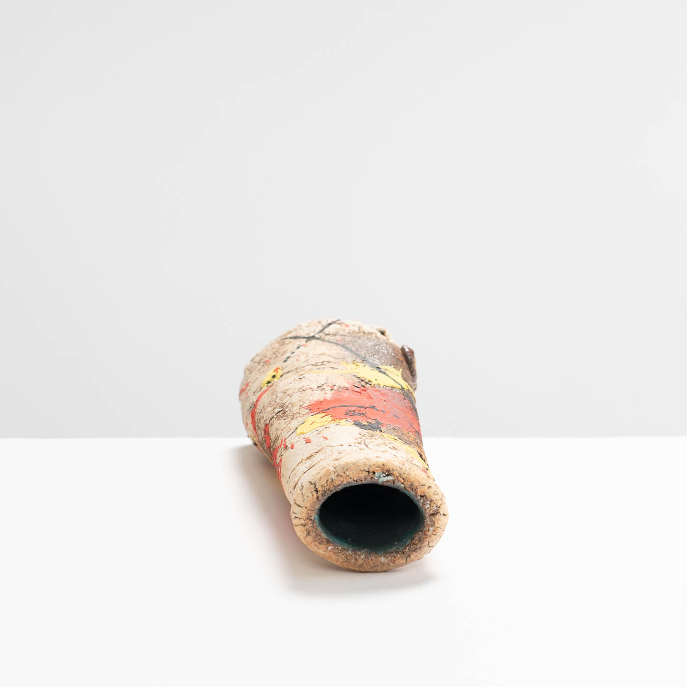 This stoneware vase is hand-built in ball clay and decorated with splashes of colour. Elements of John’s inspiration by ancient Greek pottery can be detected in the sandy textured surface and the deep turquoise interior.