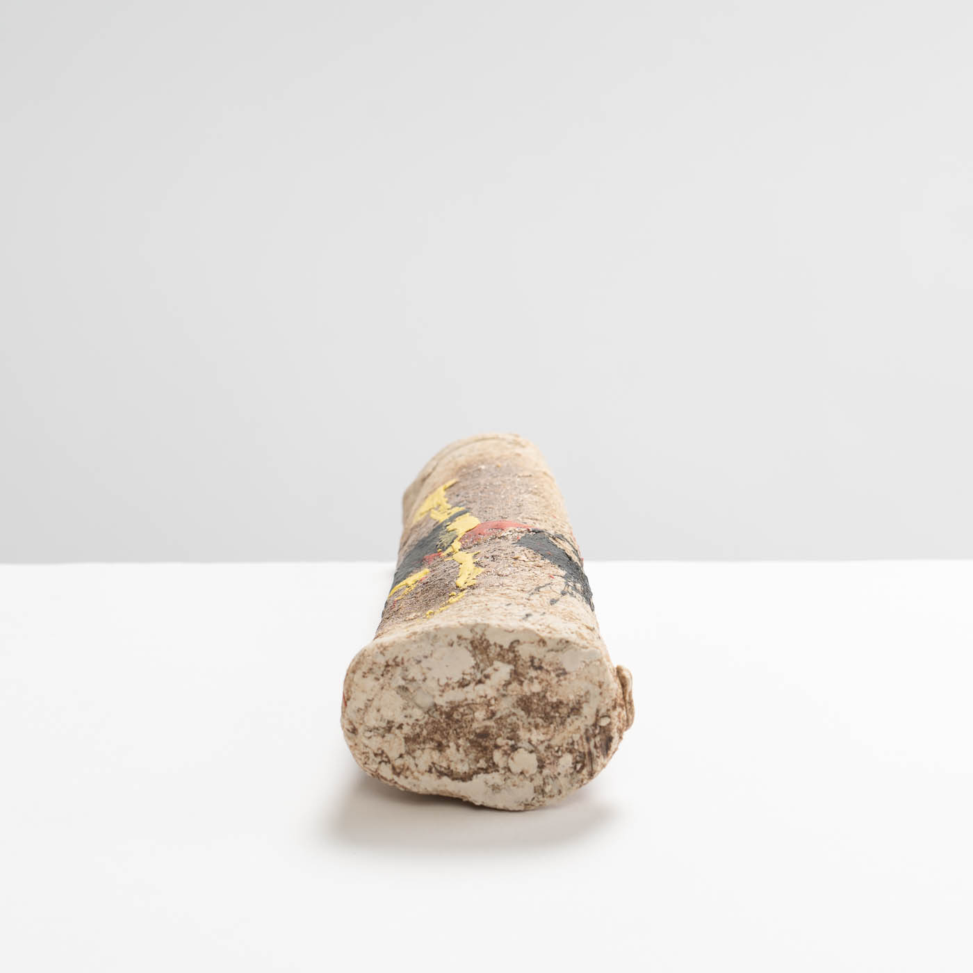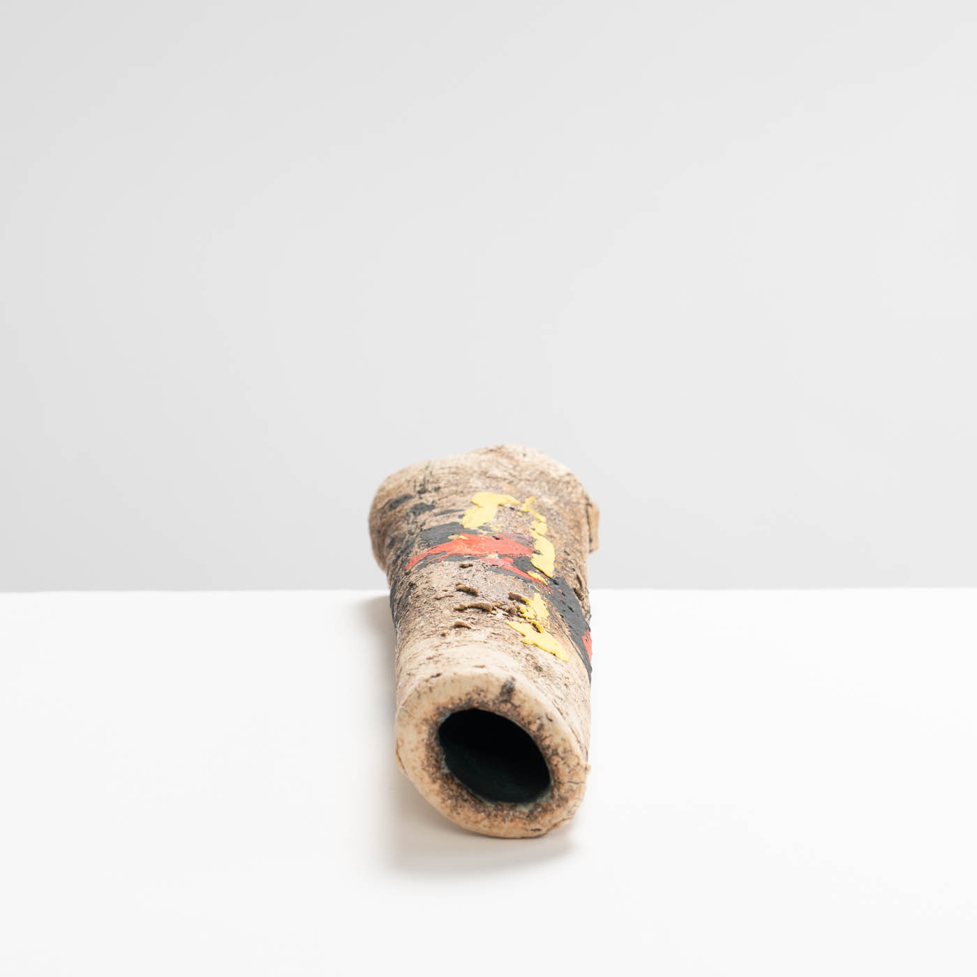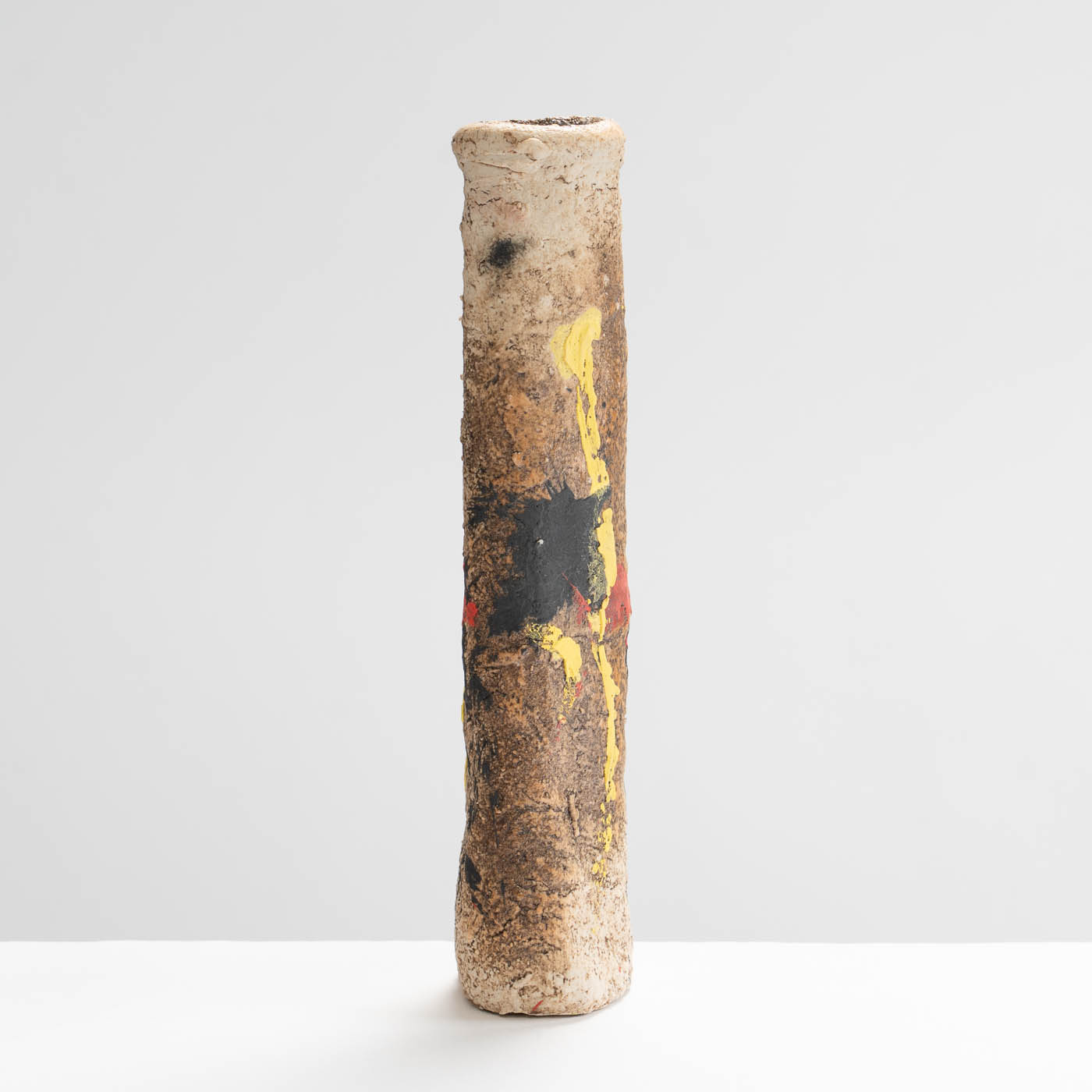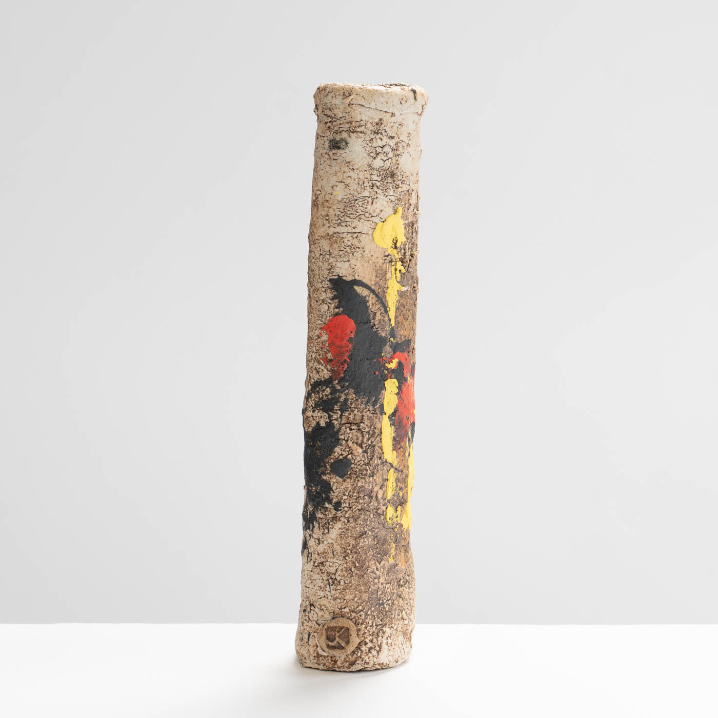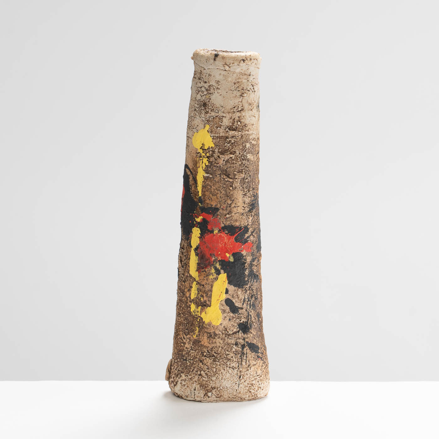 This stoneware vase is hand-built in ball clay and decorated with splashes of colour. Elements of John’s inspiration by ancient Greek pottery can be detected in the sandy textured surface and the deep turquoise interior.
