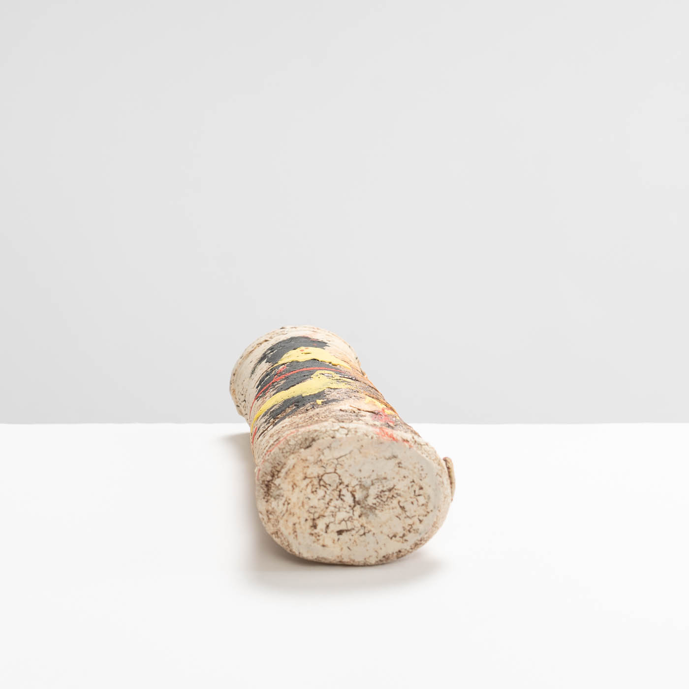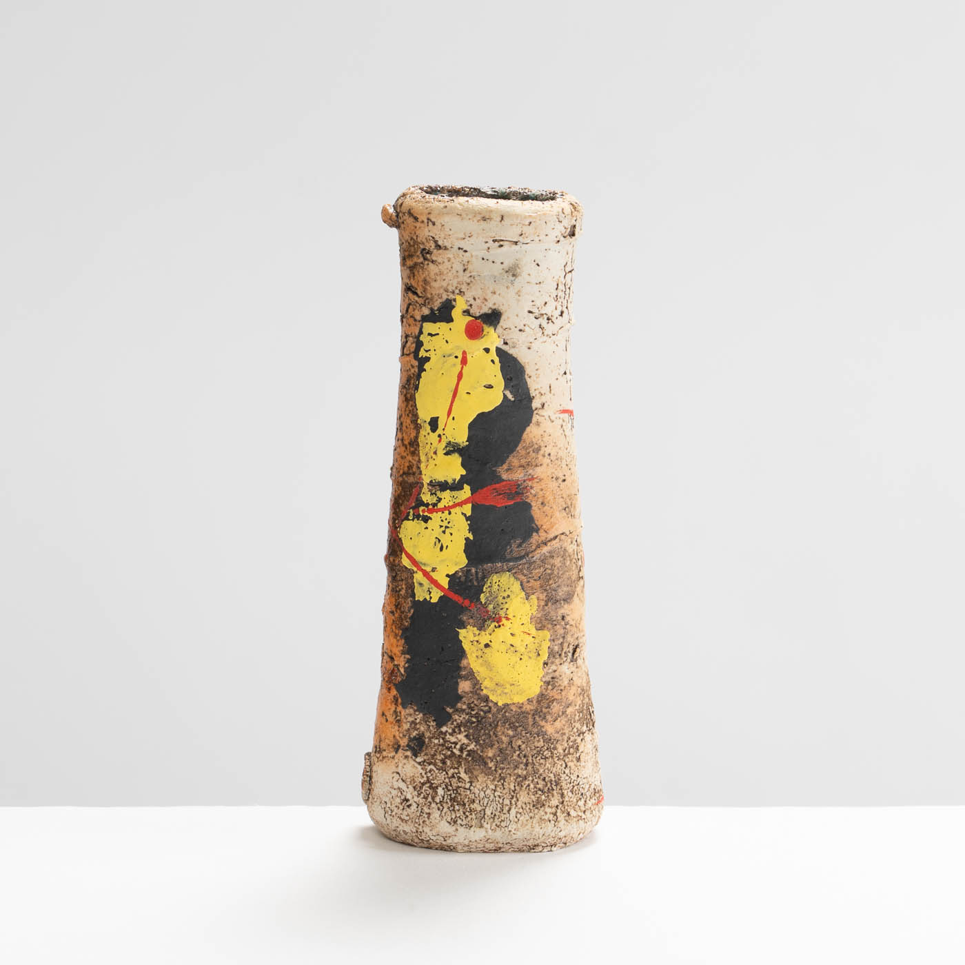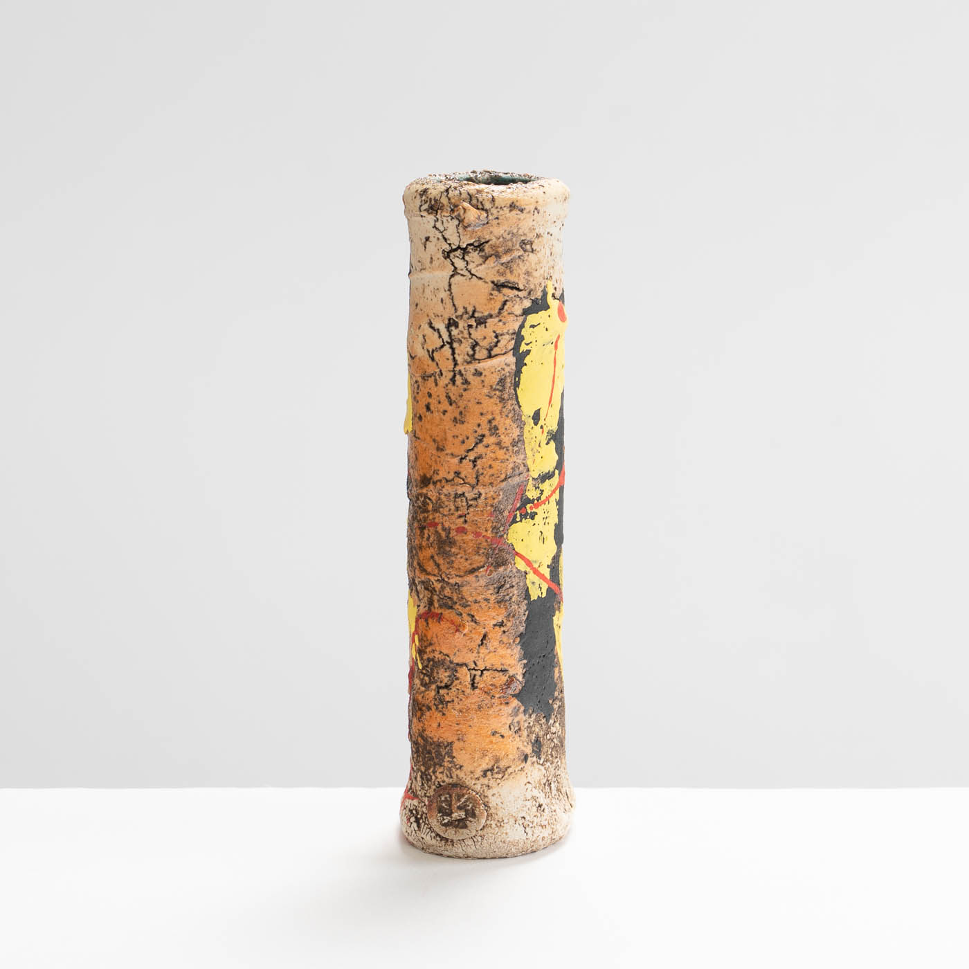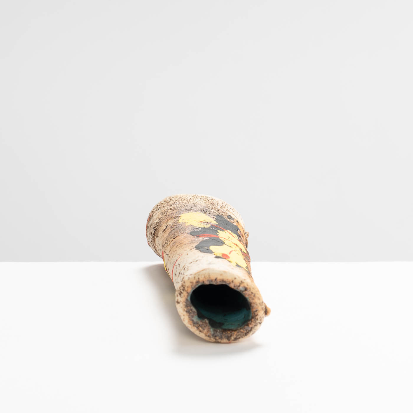 This stoneware vase is hand-built in ball clay and decorated with splashes of colour. Elements of John’s inspiration by ancient Greek pottery can be detected in the sandy textured surface and the deep turquoise interior.