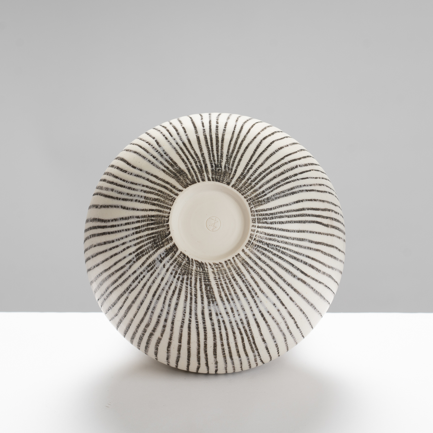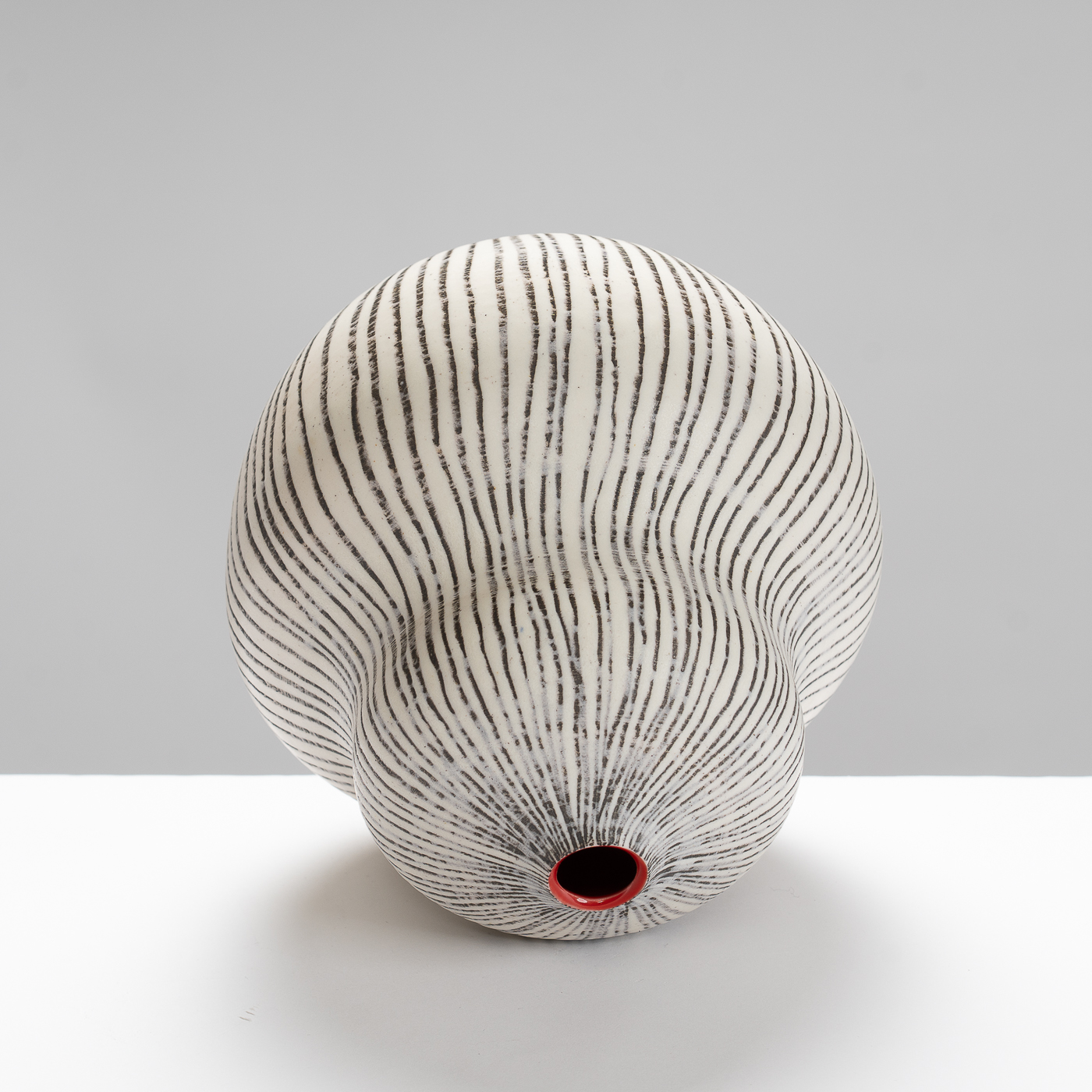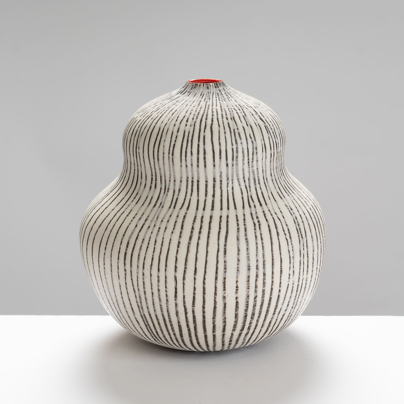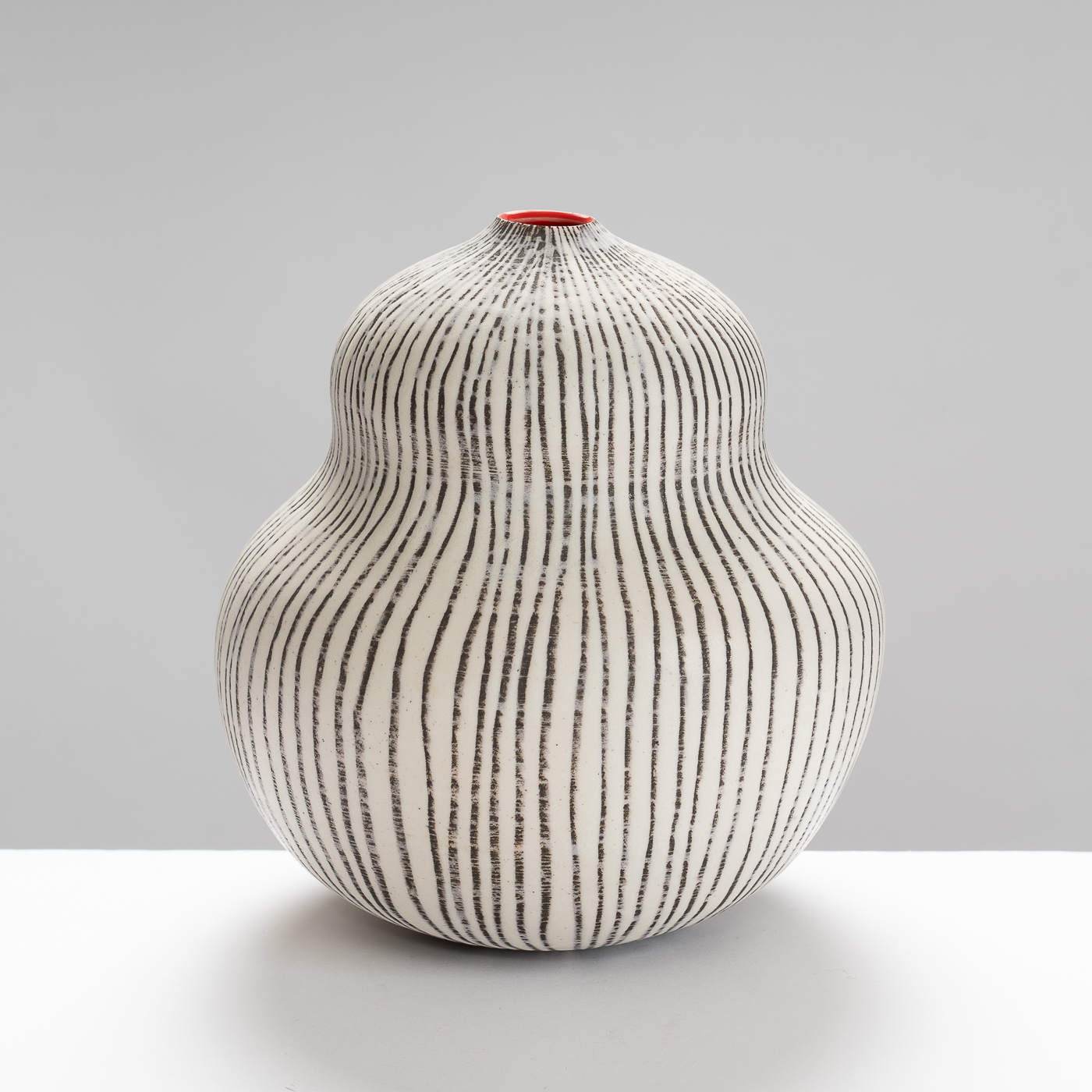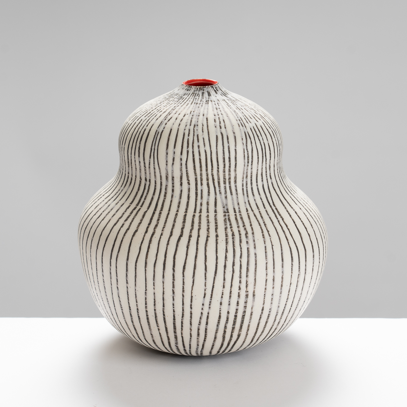 This wheel-thrown porcelain vase proudly displays its distinctive form. Finished with matt white glaze, hand-painted linear markings, and a red interior.