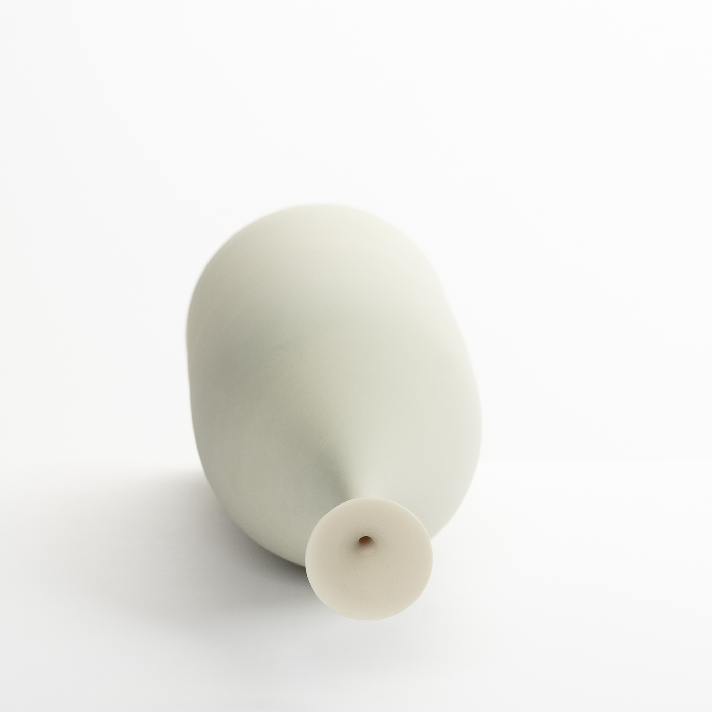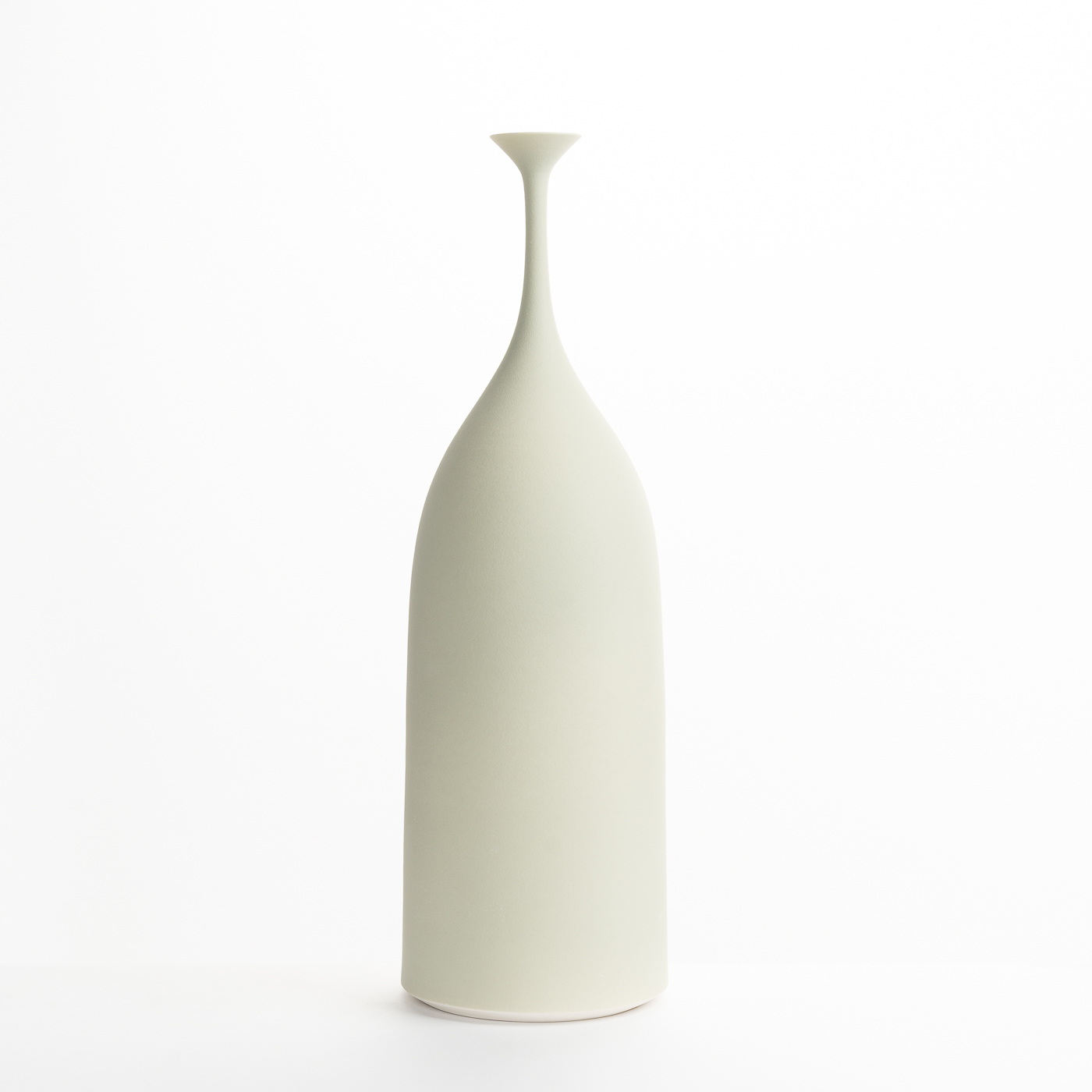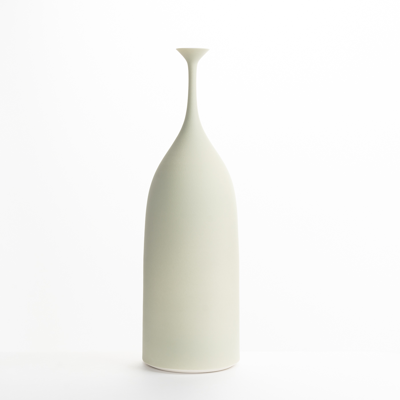 This elegant porcelain bottle form is wheel-thrown with precision and enveloped in a dry light sage glaze.