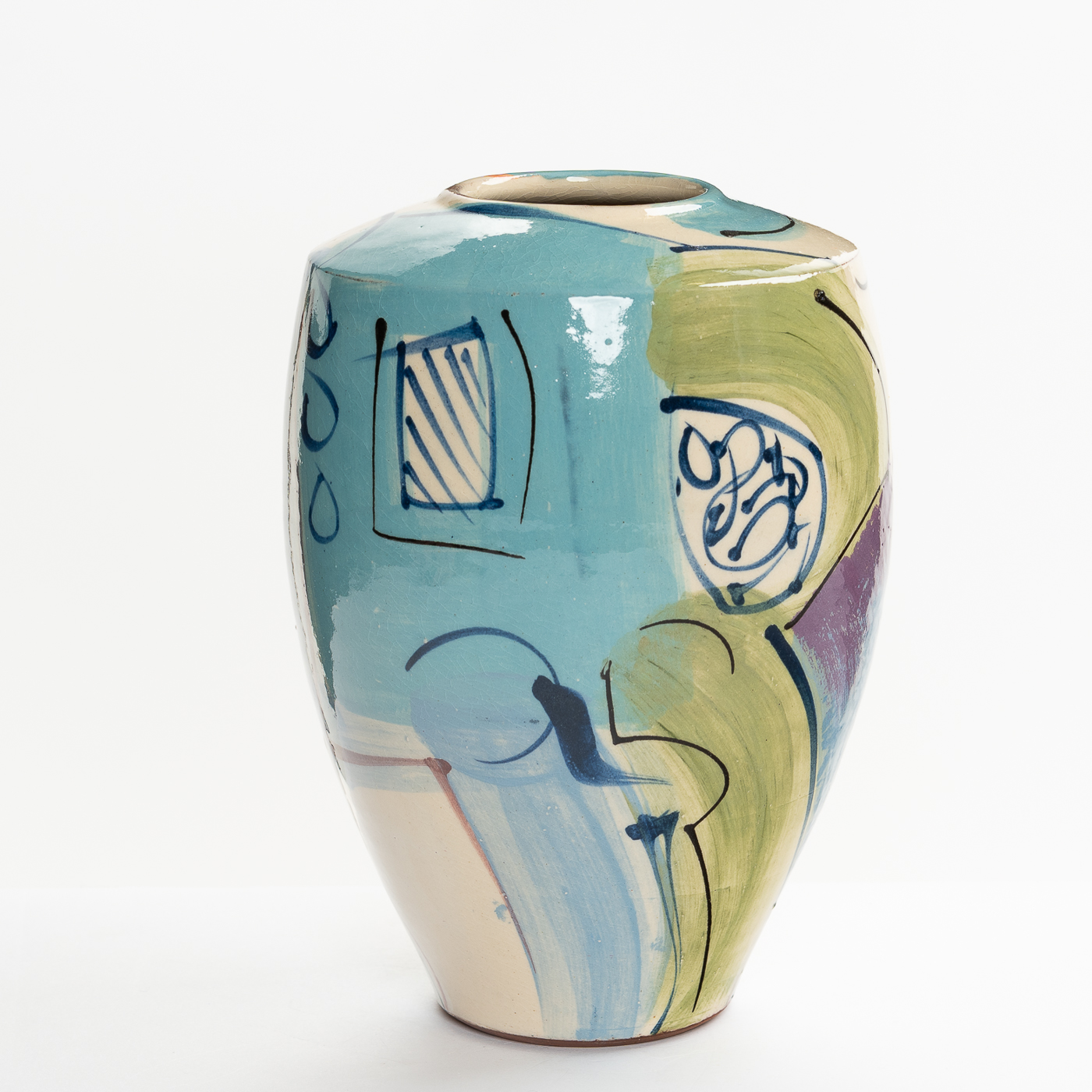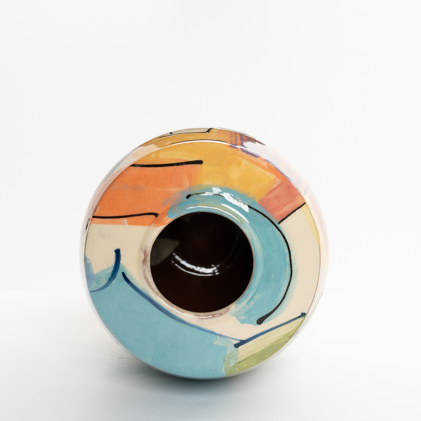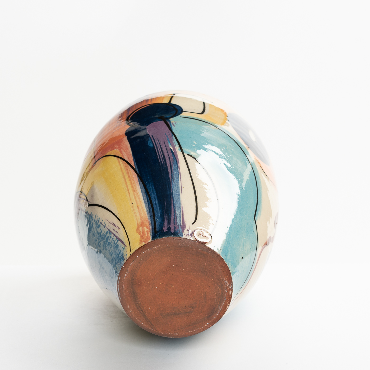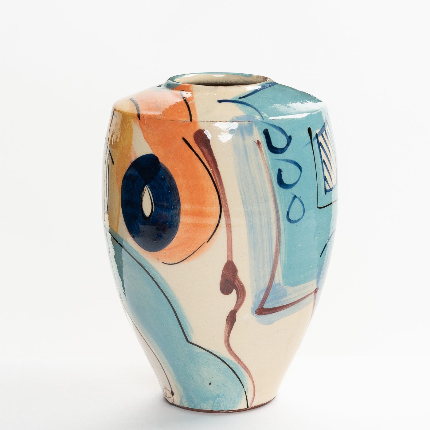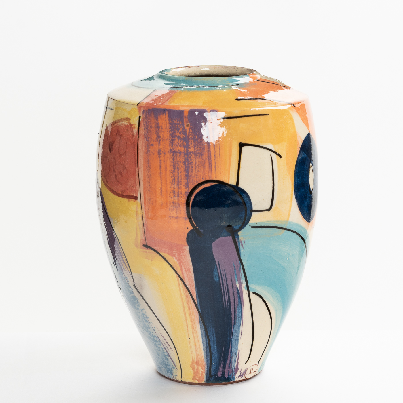 This vase is wheel-thrown in earthenware clay and decorated with brightly coloured slip, balancing colour and design with the form. The gestural and spontaneous abstract marks are created with different shaped brushes so that the slips are treated as oil paints. Fine slip trailed lines are added to enliven the form.