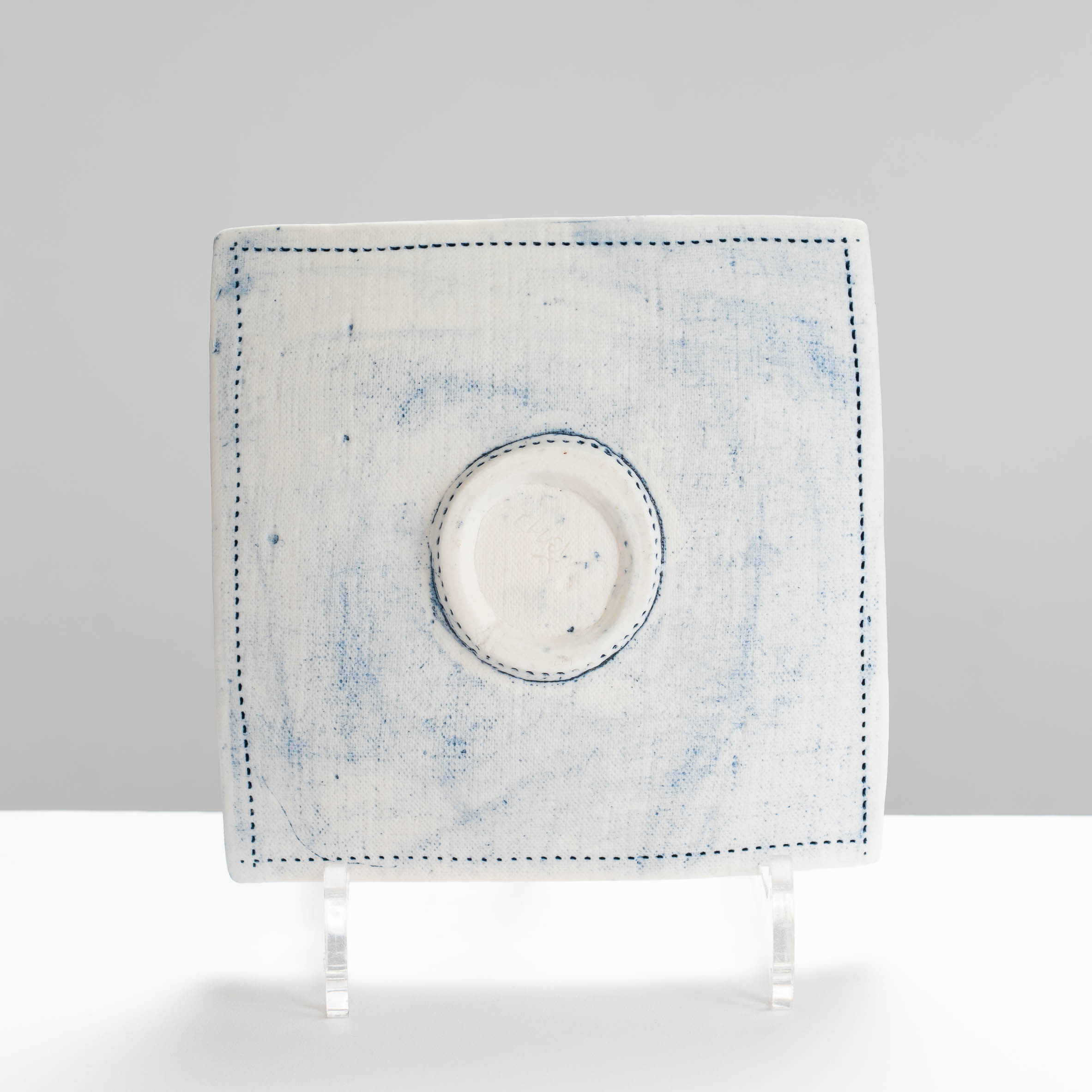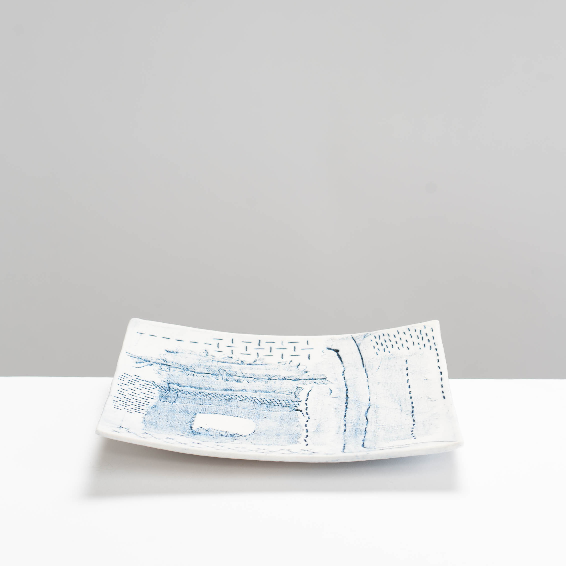 This dish is constructed from soft slabs of porcelain. It is decorated with a variety of resist techniques, impressed textiles, sgraffito, and marks drawn through oxides and underglaze colours.