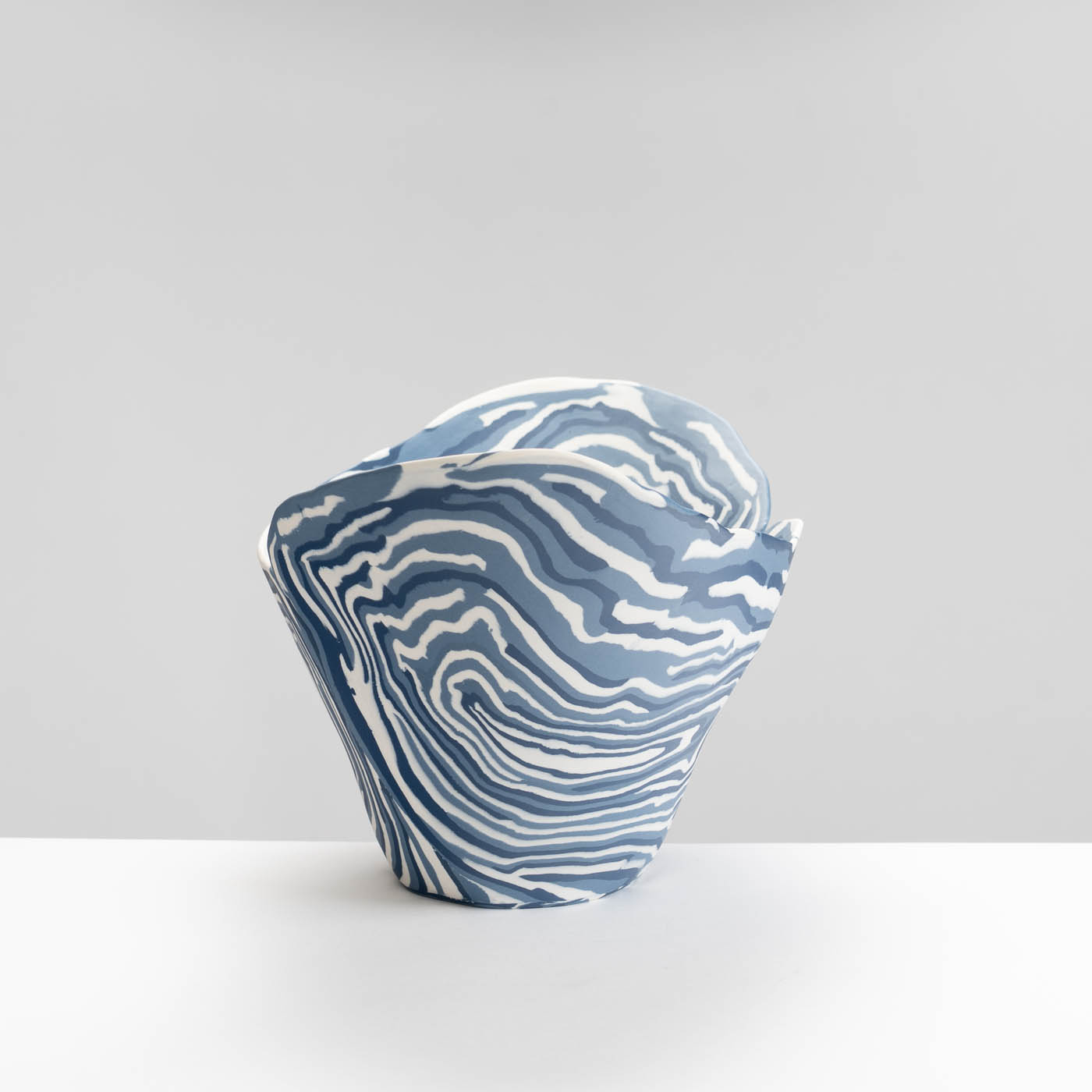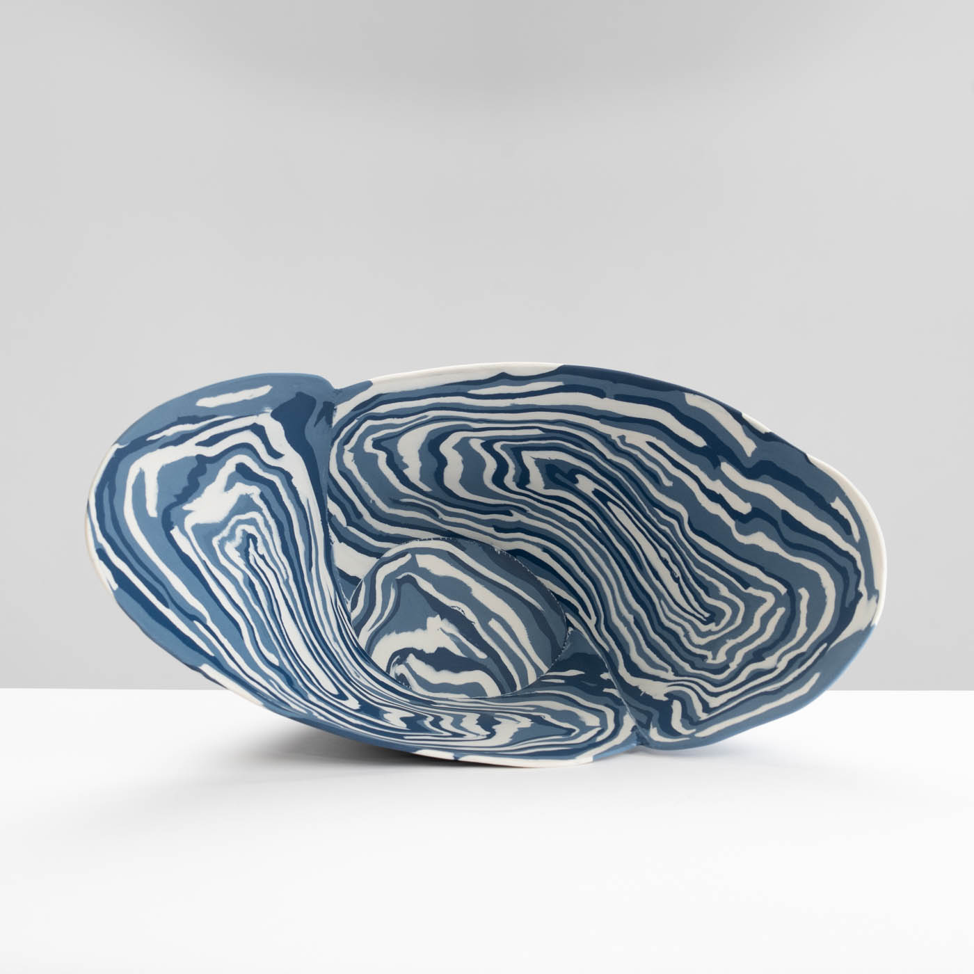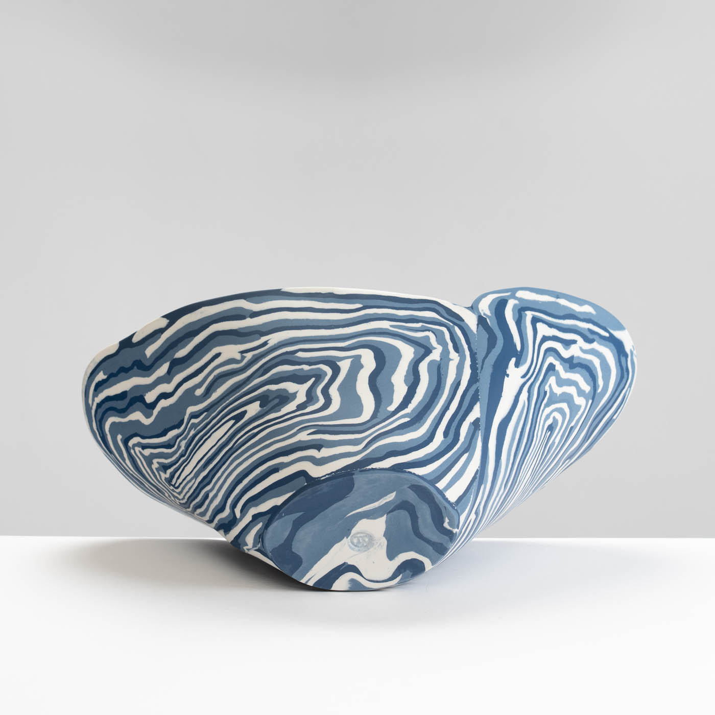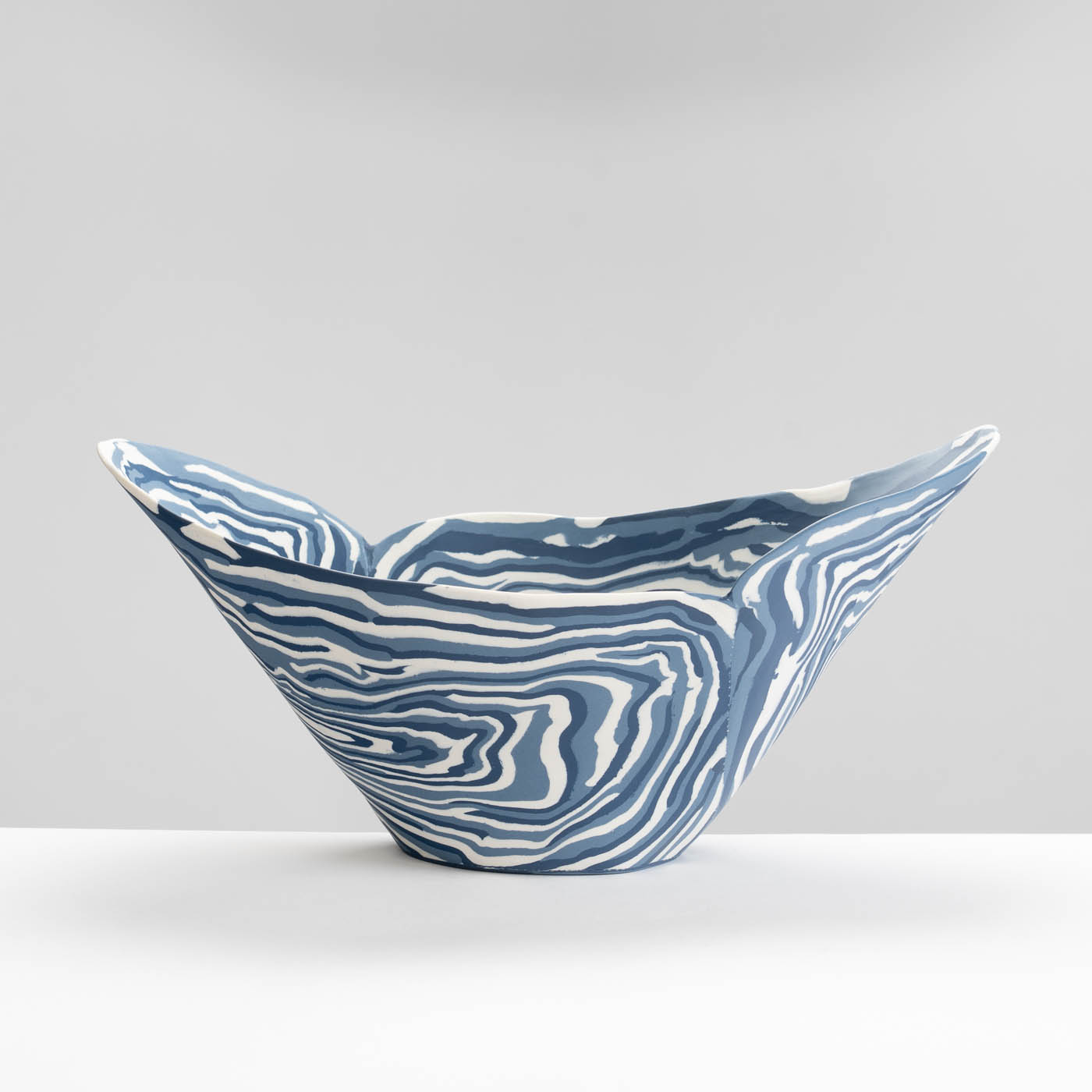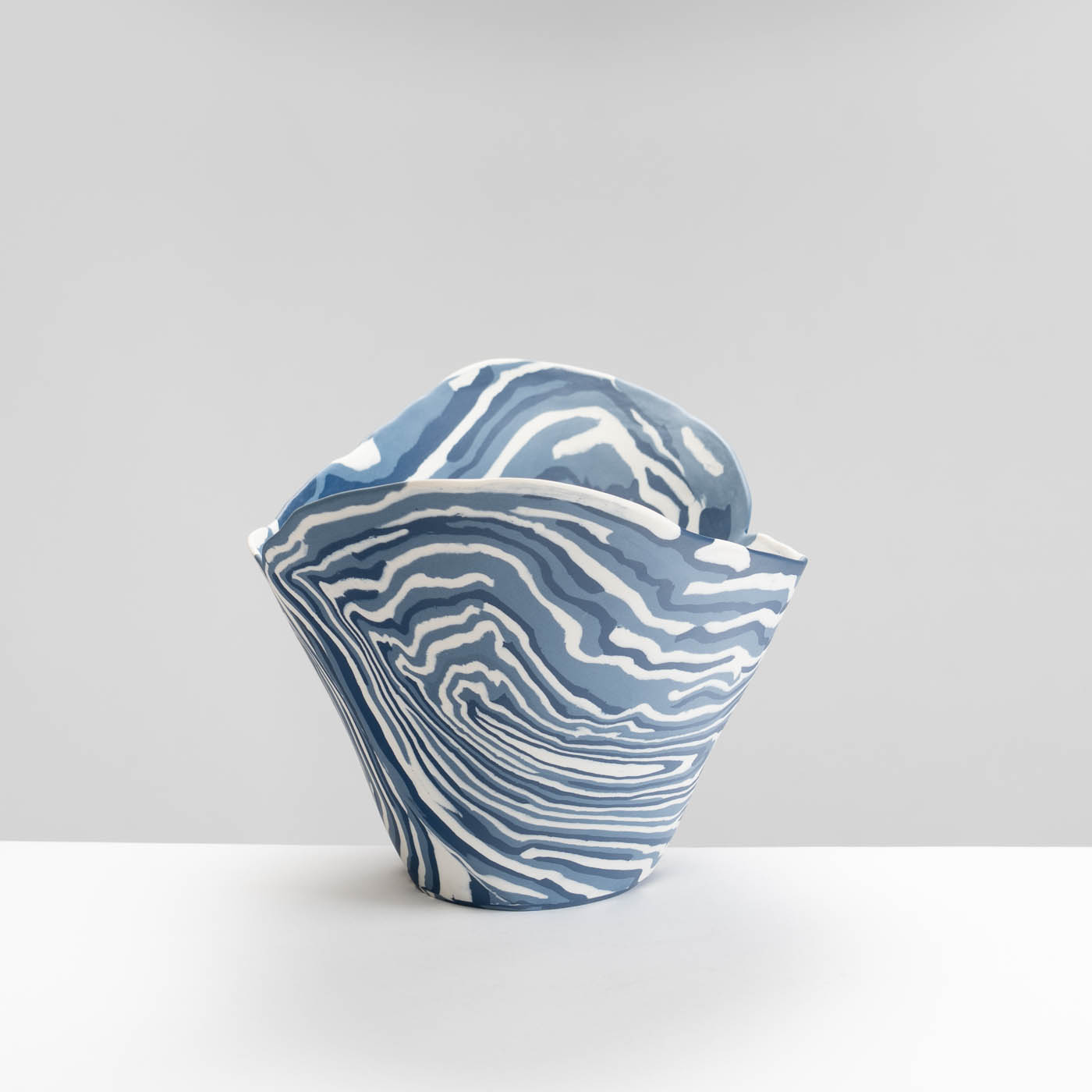 This vessel is hand-built in stained porcelain. The decorative patterns are made by an intricate and meticulous lamination technique called nerikomi. Each delicate, light and fluid piece is unglazed and finely polished both inside and outside to a smooth finish, revealing the the pattern.