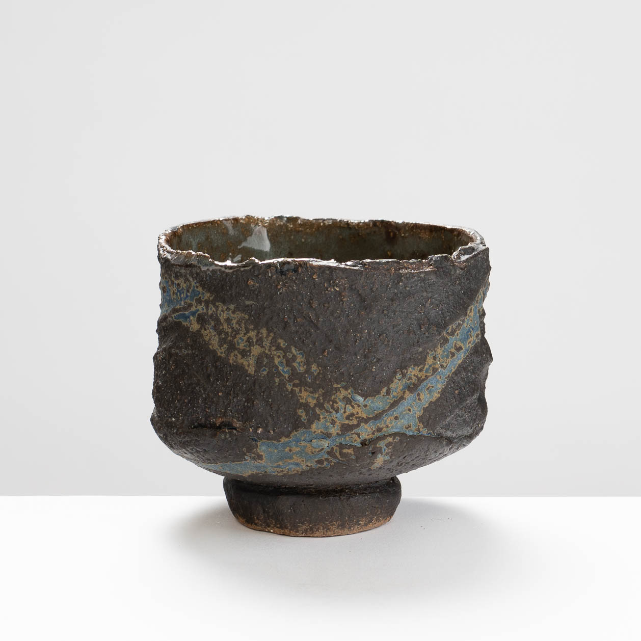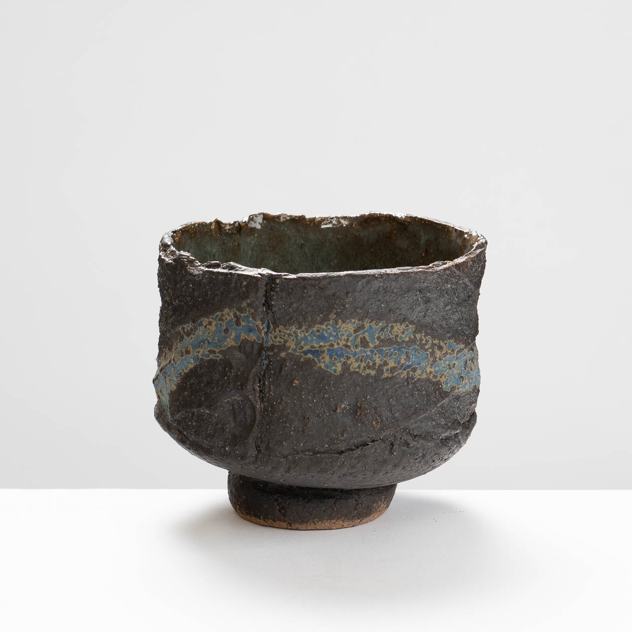 This chawan is hand-built in stoneware clay with a blue glaze brushed decoration.