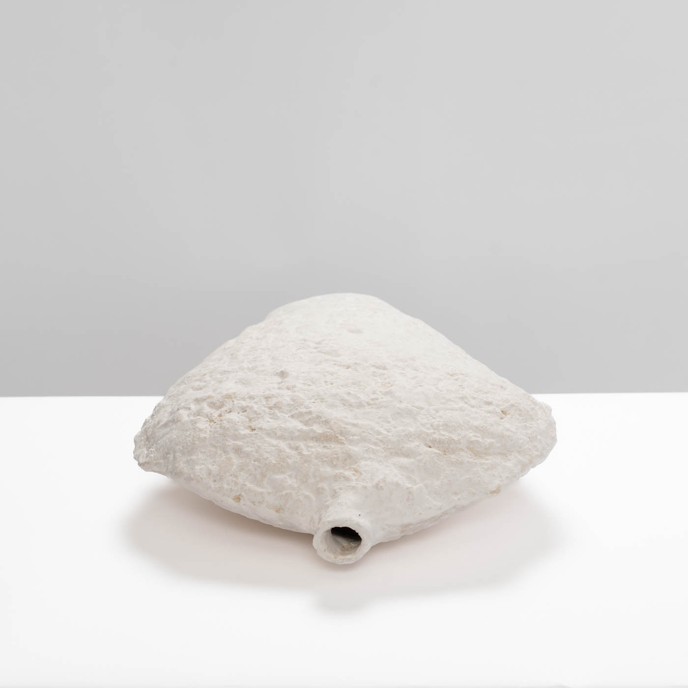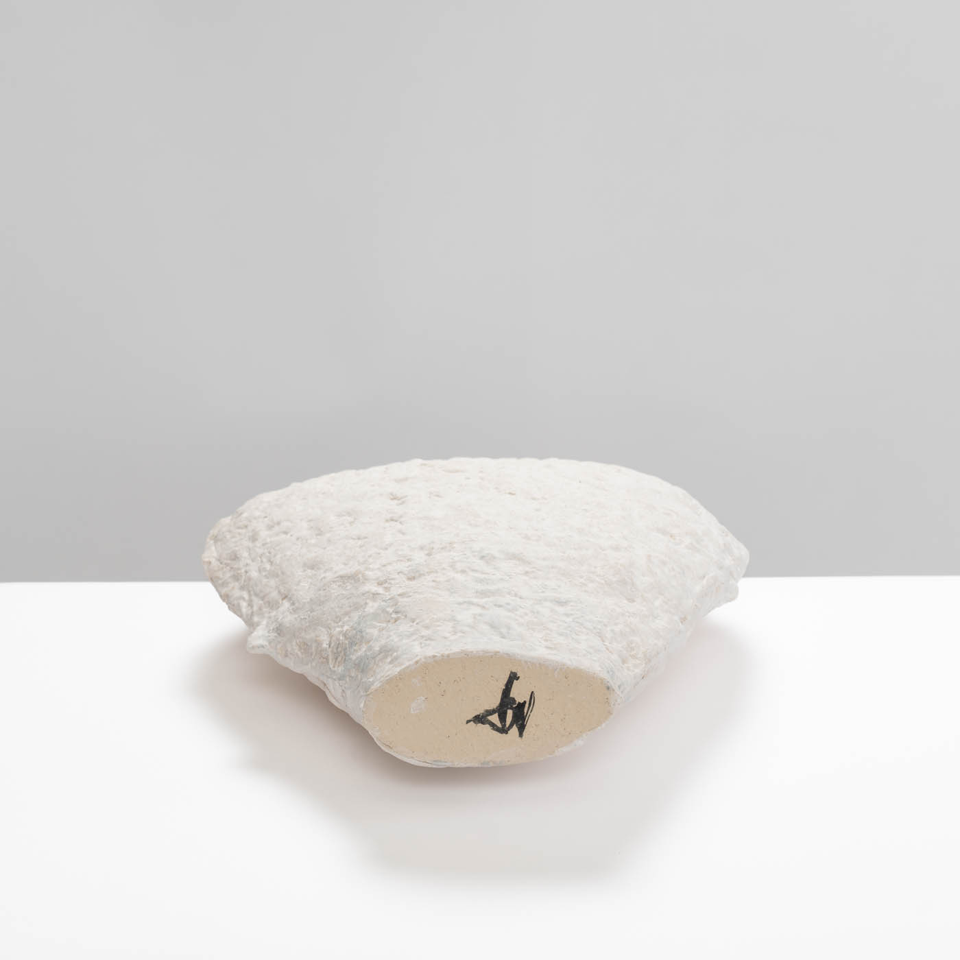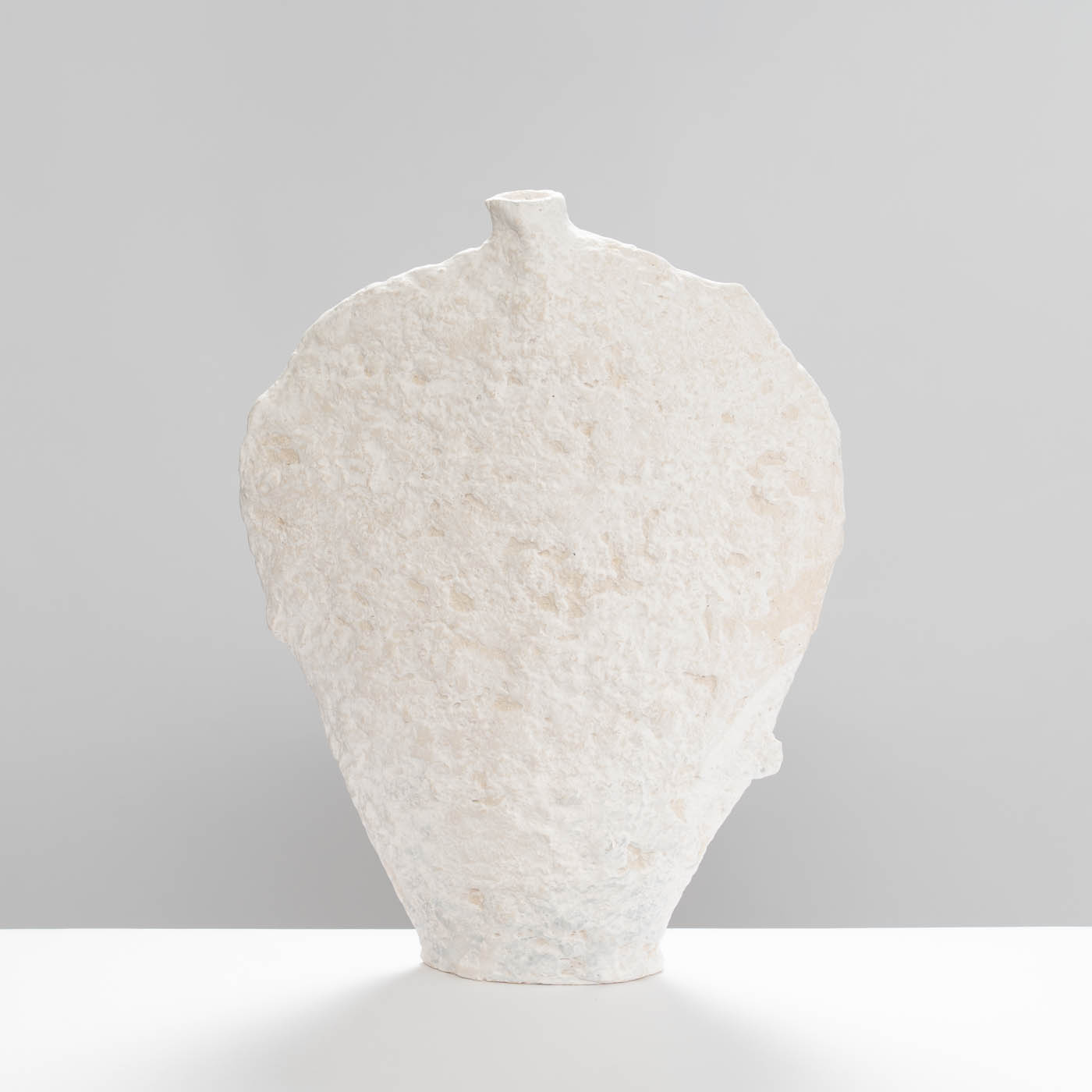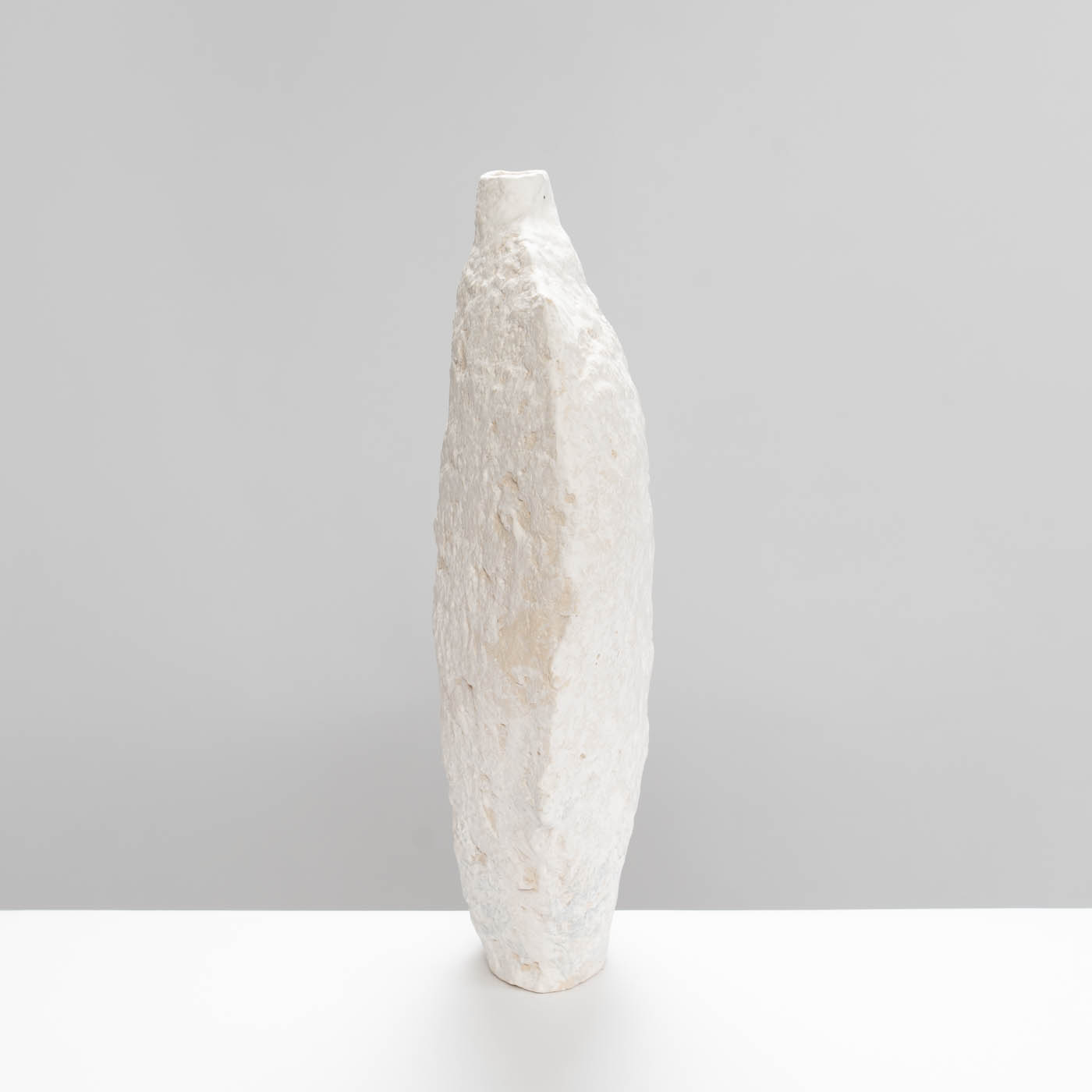 This vase form is hand-built in a pale, grogged clay. Its textured surface is highlighted in matt white.