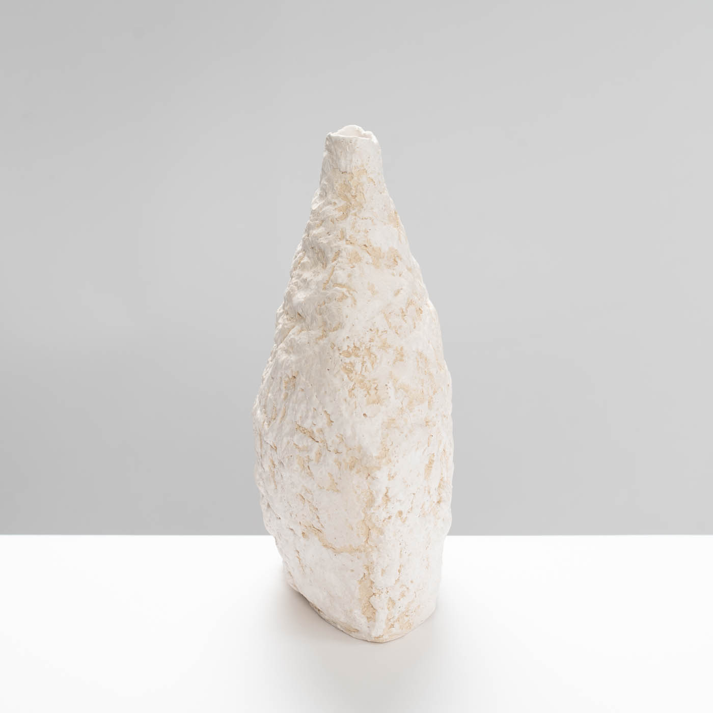 This vase form is hand-built in a pale, grogged clay. Its textured surface is highlighted in matt white.