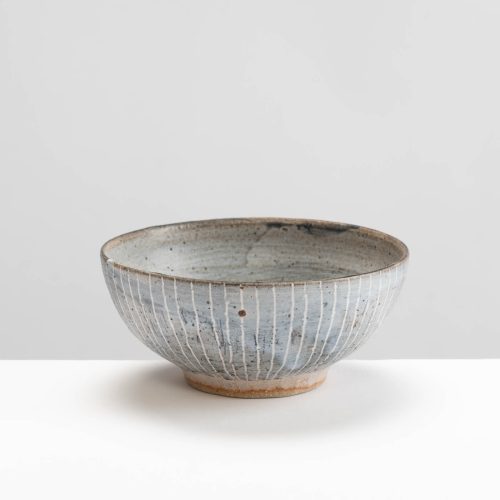 This stoneware bowl is wheel-thrown, then salt glazed and fired in a wood kiln. The combination of the salt and wood firing gives a glossy textured surface.